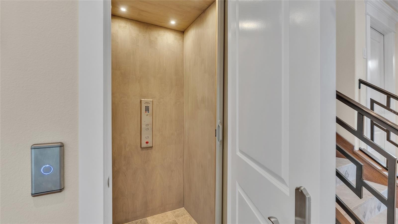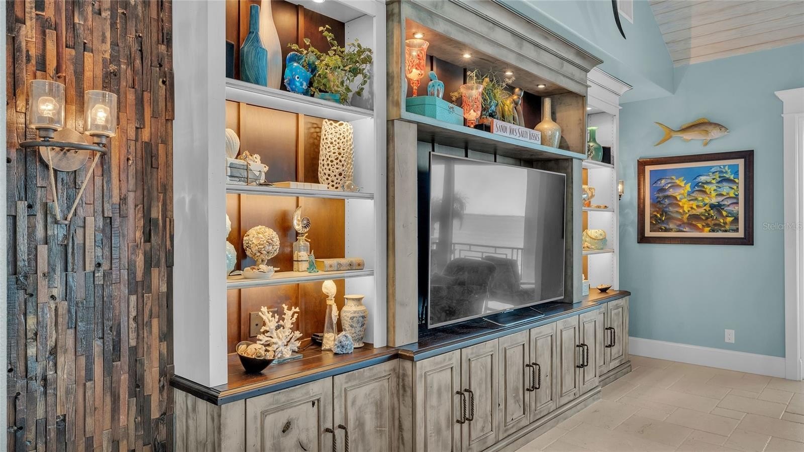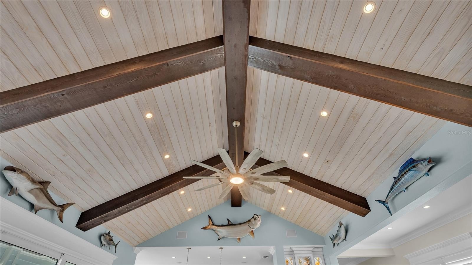 Calm coastal hues and shell stone travertine flooring flow throughout the soaring living spaces, highlighted by tongue-and-groove ceilings with solid wood beams. The home showcases custom cabinetry with 100-year-old pine accents, extensive millwork, and a handcrafted TV feature wall. Additional features include a Control4 AV system, upgraded custom lighting and fans, an elevator, 8-foot solid core interior doors, whole-home sound system, plantation shutters, custom motorized window treatments, and central vacuum.