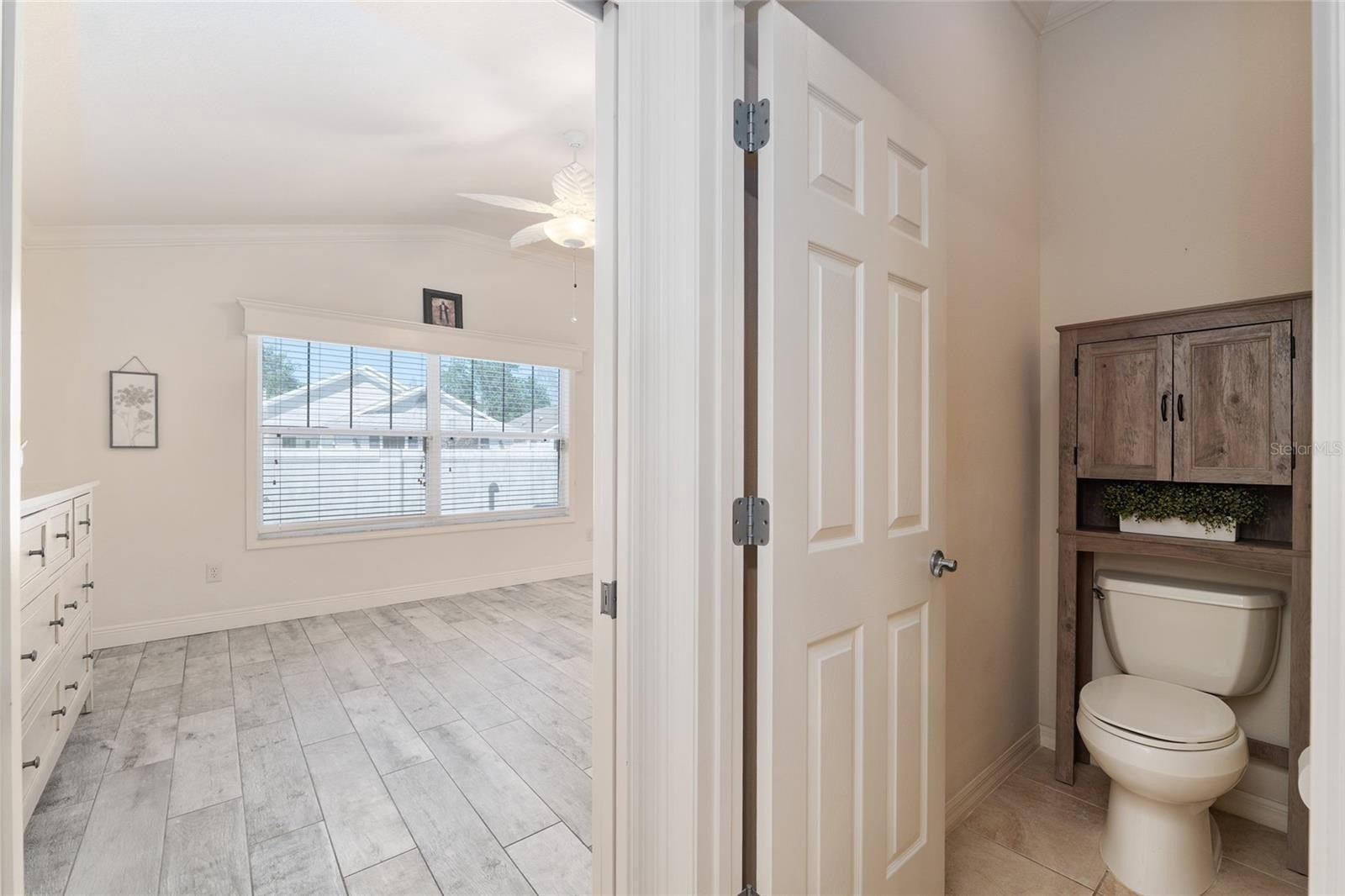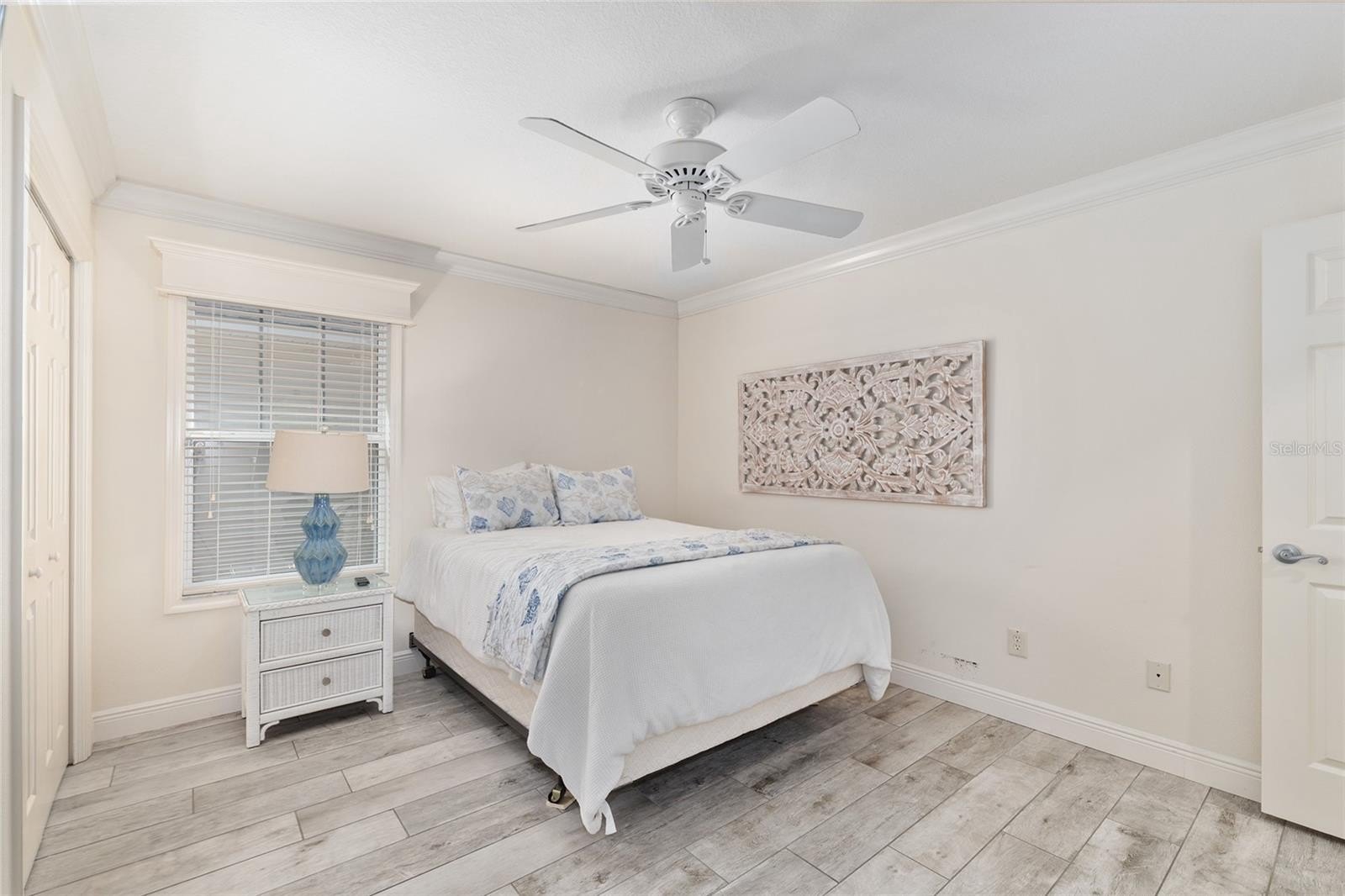 The spacious primary suite offers a private retreat with dual vanities, a linen closet, and a custom walk-in closet. Two additional generously sized guest bedrooms, each with ample closet space, share a well-appointed guest bath.