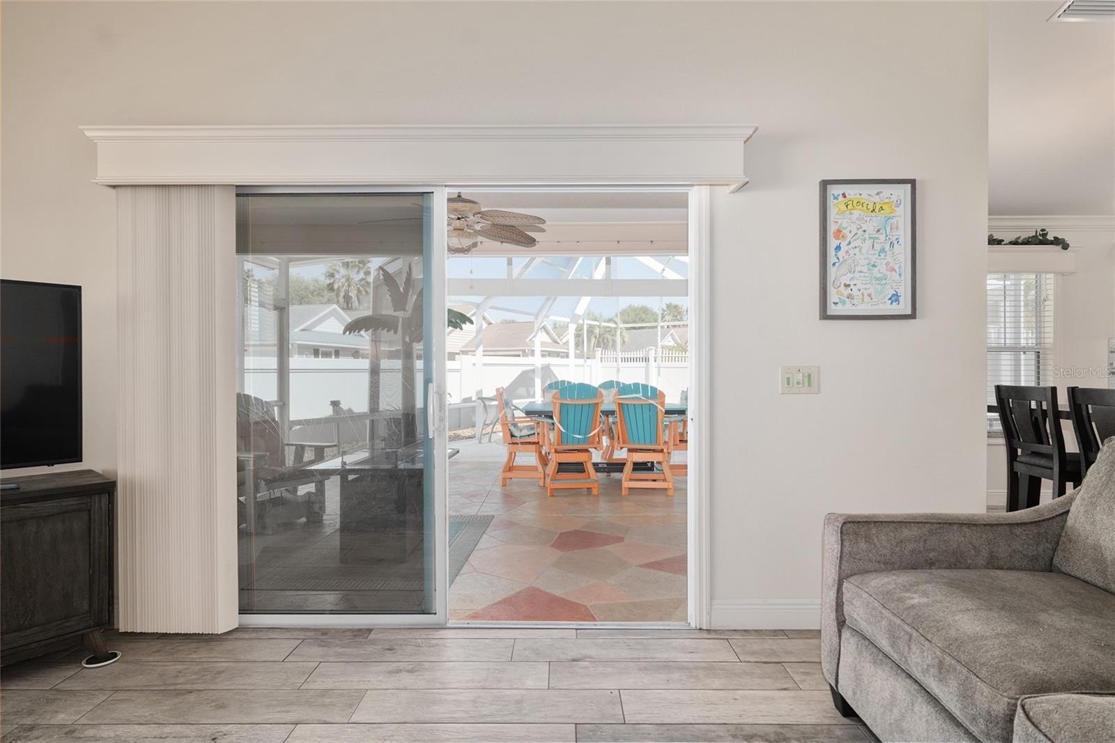 Step outside to your private backyard oasis. The screened lanai showcases a saltwater pool and spa, creating a serene and secluded setting. The oversized, low-maintenance lot offers ample space for pets or the opportunity to expand your outdoor living area.