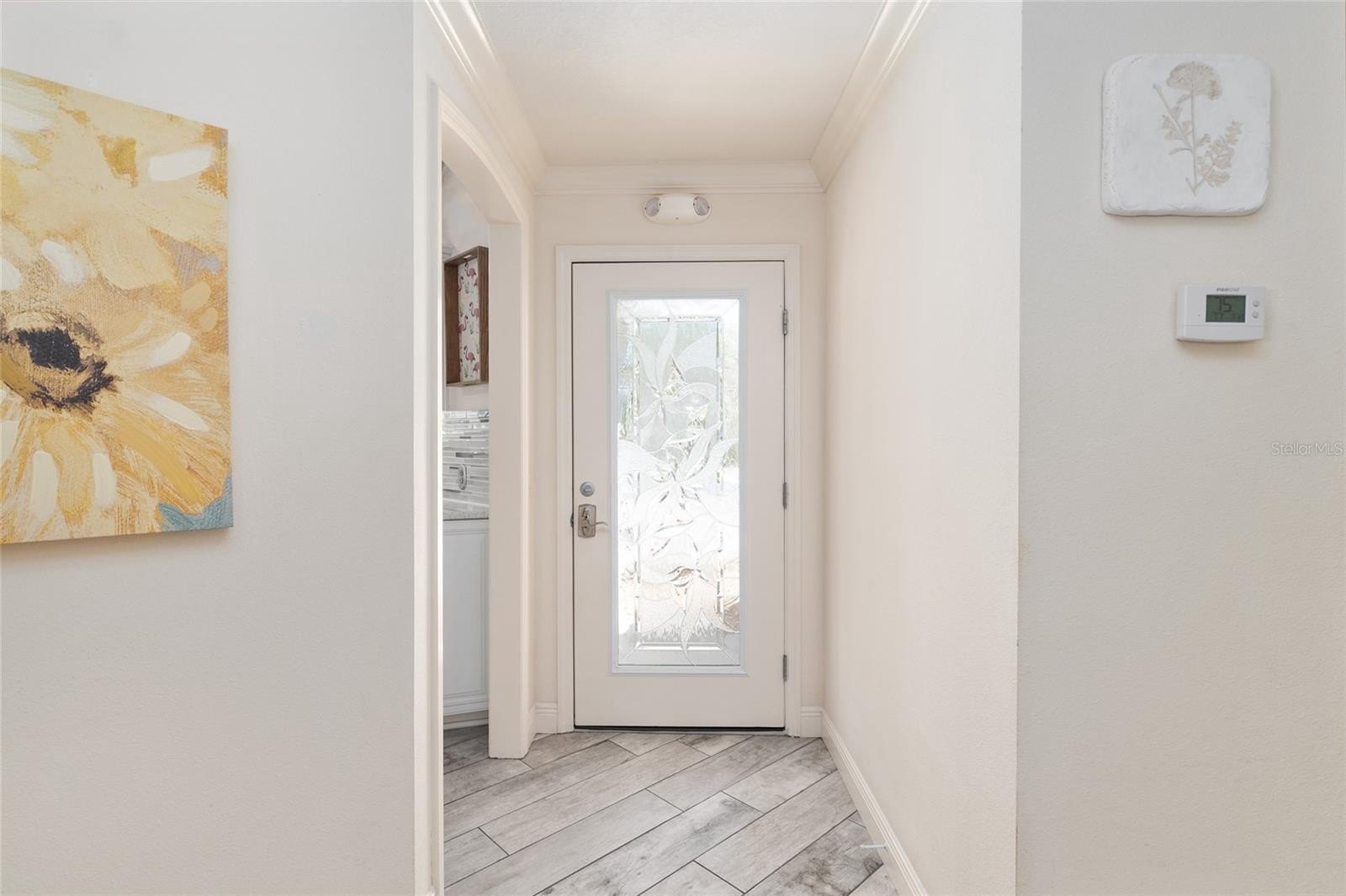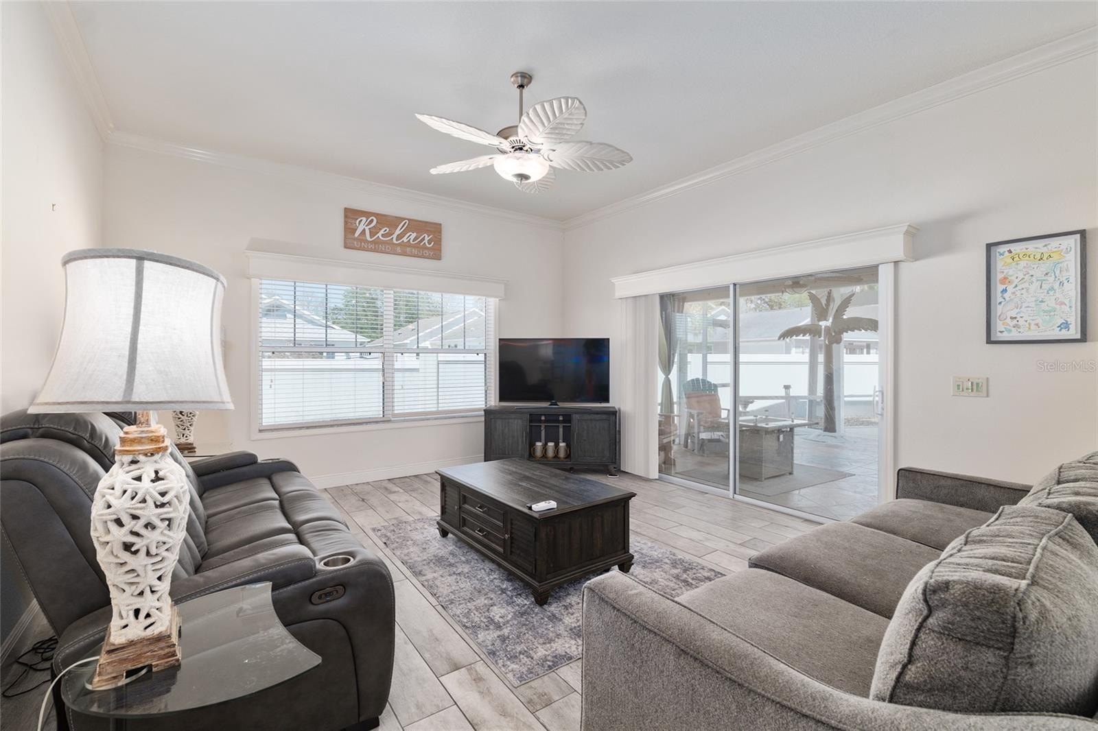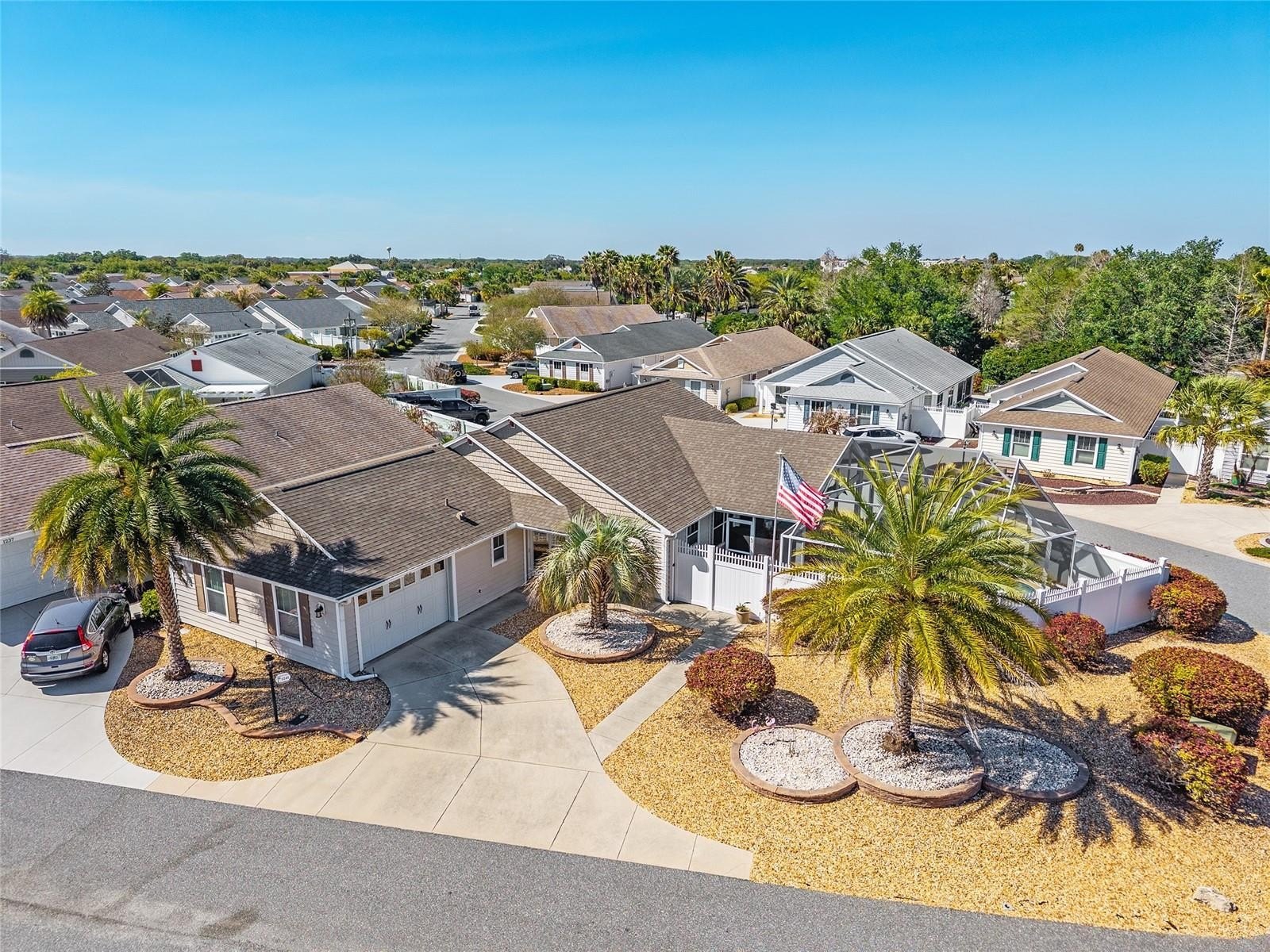 Discover an exceptional opportunity to own a pool and spa home in the desirable Creekside Landing community. Perfectly positioned within walking distance to Sumter Landing Market Square, this residence offers convenient access to premier dining, shopping, and nightly entertainment—while providing a private retreat to relax and unwind at home. This partially furnished 3-bedroom, 2-bath Anna Maria Courtyard Villa is ideally situated on an oversized corner lot. Upon entry, you are greeted by vaulted ceilings, crown molding, and tile plank flooring that enhance the home’s light, bright, and airy ambiance. The well-appointed kitchen features quartz countertops, stainless steel appliances, a decorative backsplash, a cooking island, and abundant cabinetry with convenient pull-out drawers. The open-concept dining and living areas flow seamlessly and provide direct access to the screened lanai—perfect for indoor-outdoor living and entertaining.