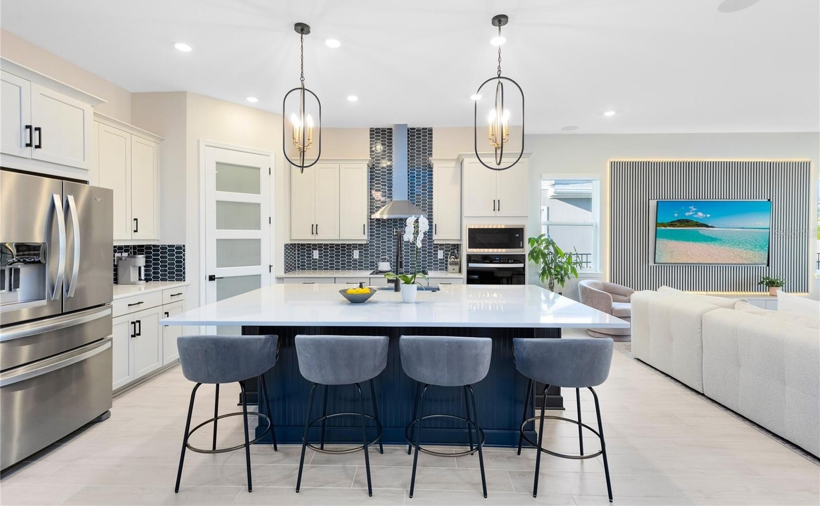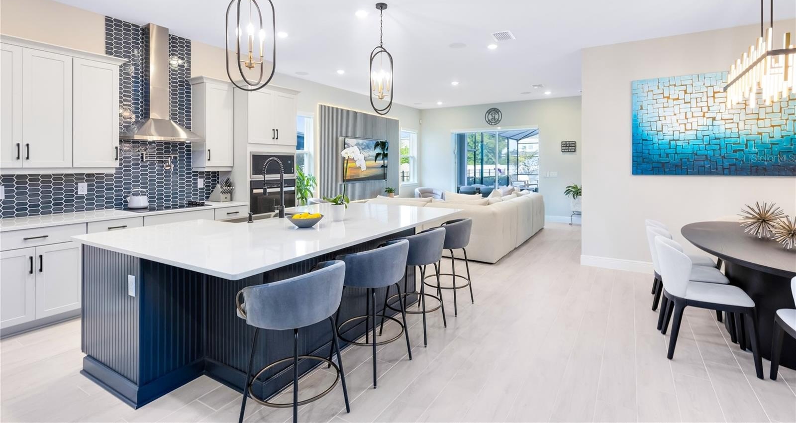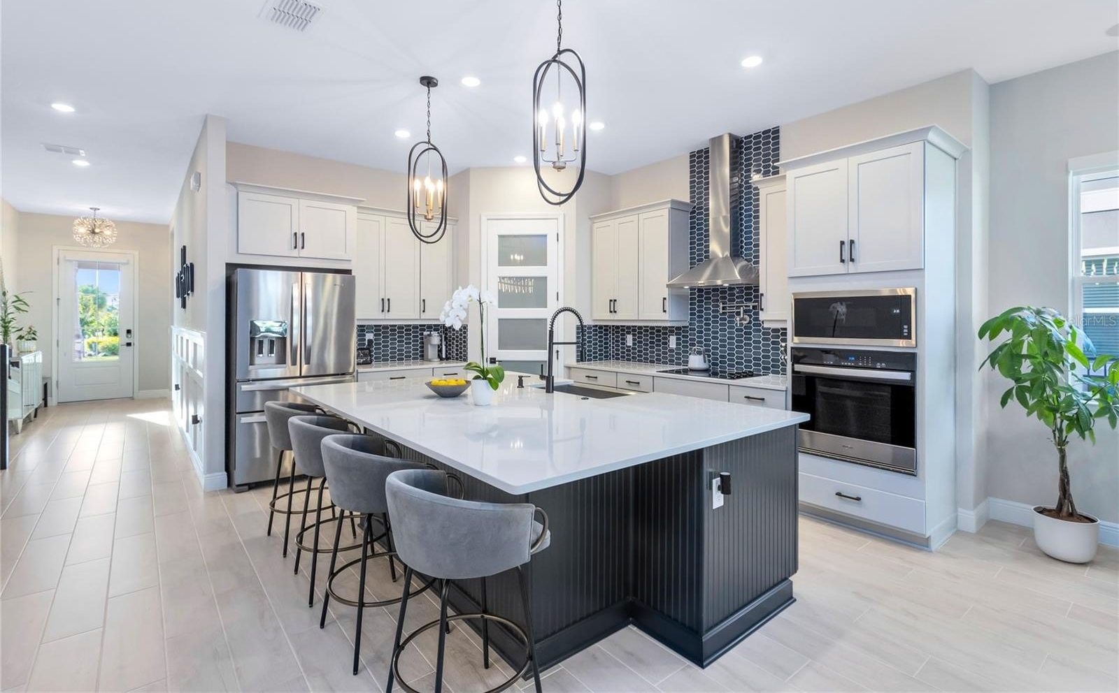 From the coastal inspired elevation and expanded paver driveway to the inviting covered front porch, this home makes a strong first impression. Inside, the open concept design is filled with natural light and enhanced by wide plank luxury vinyl flooring, custom finishes, and a seamless flow throughout the main living areas. The chef kitchen features a large quartz island, custom pantry shelving, stainless steel appliances, pot filler, and designer tile backsplash, opening effortlessly to the dining and living spaces with built in surround sound.