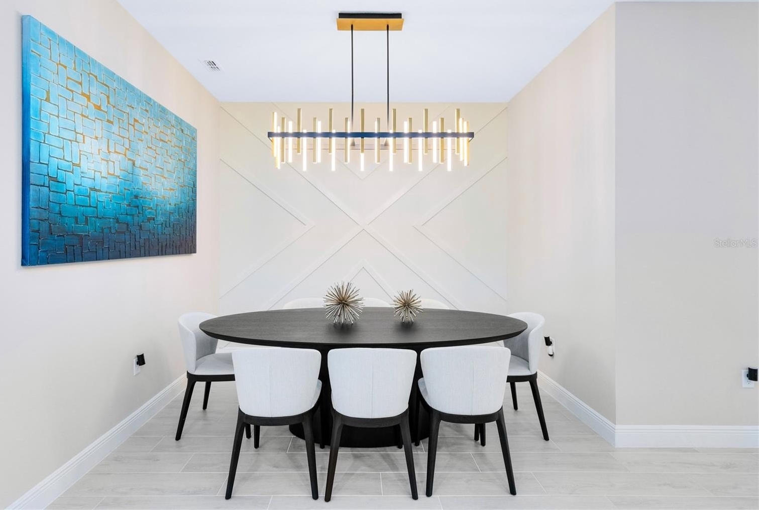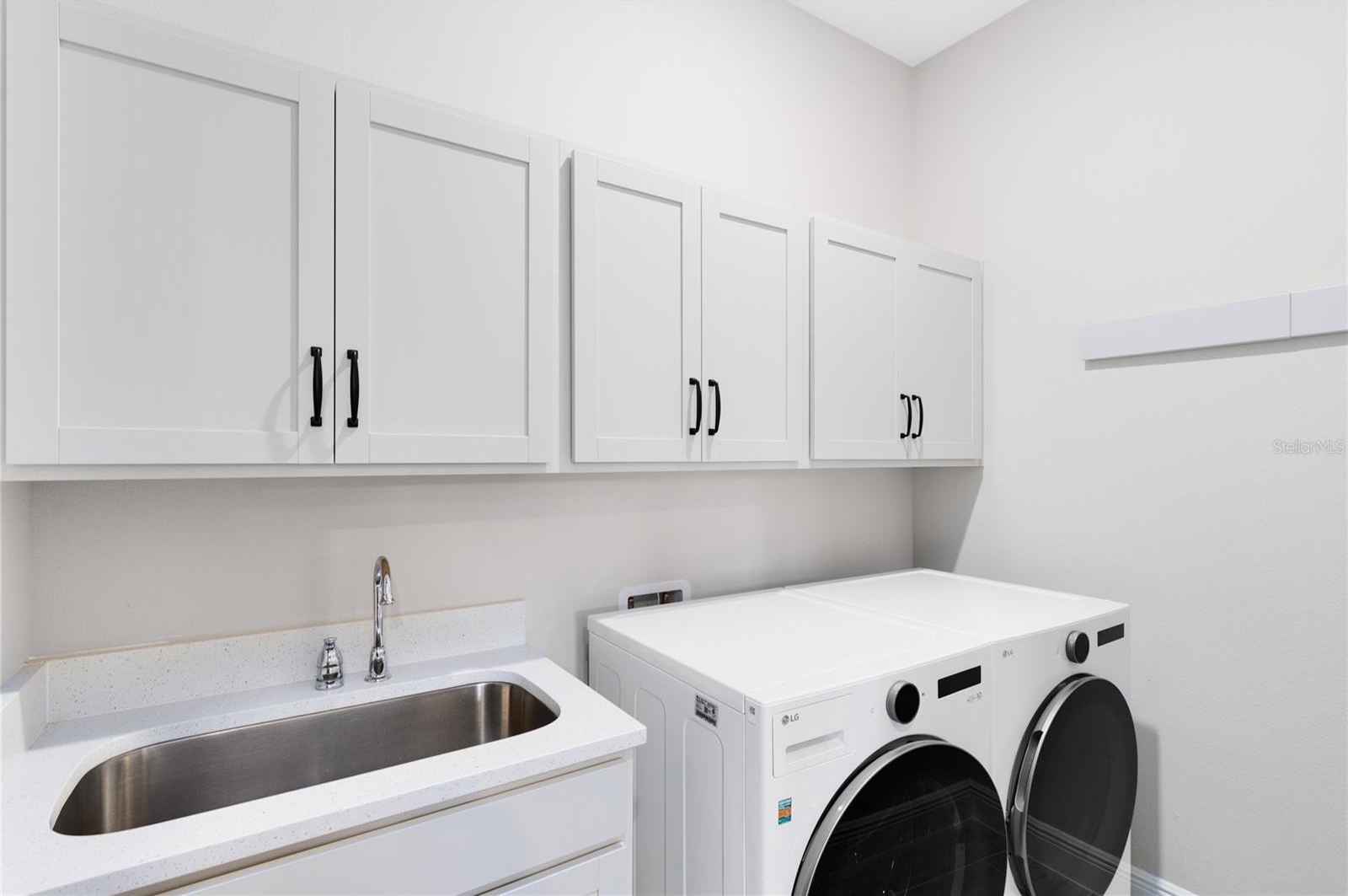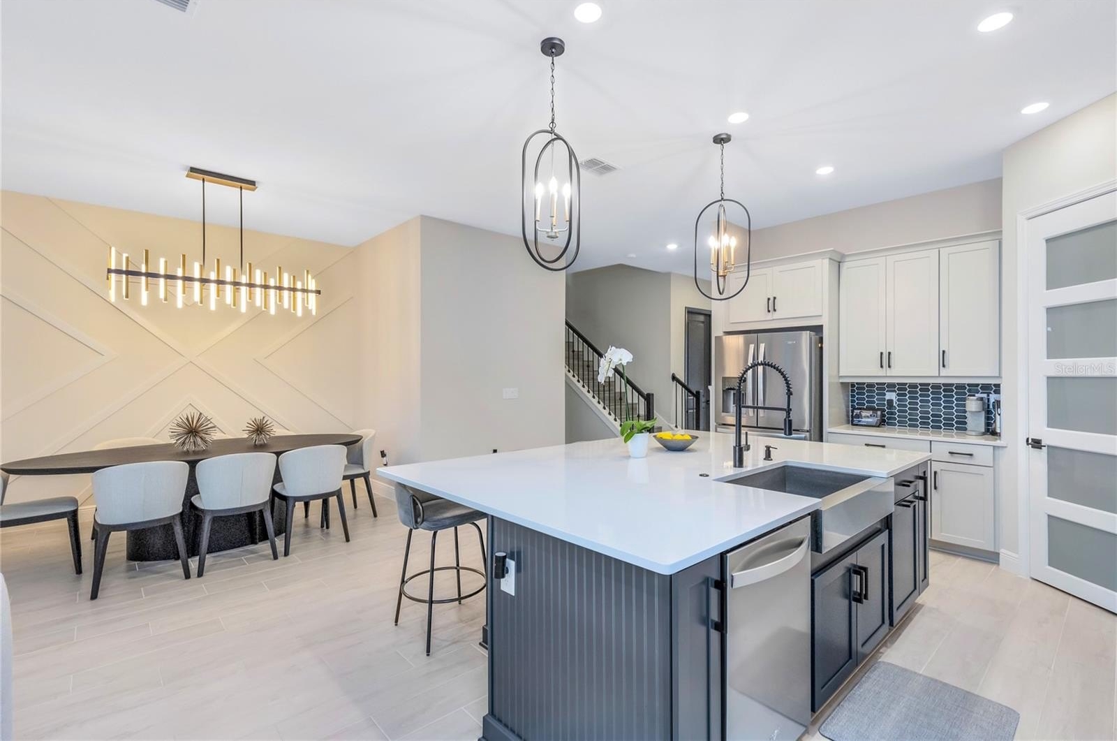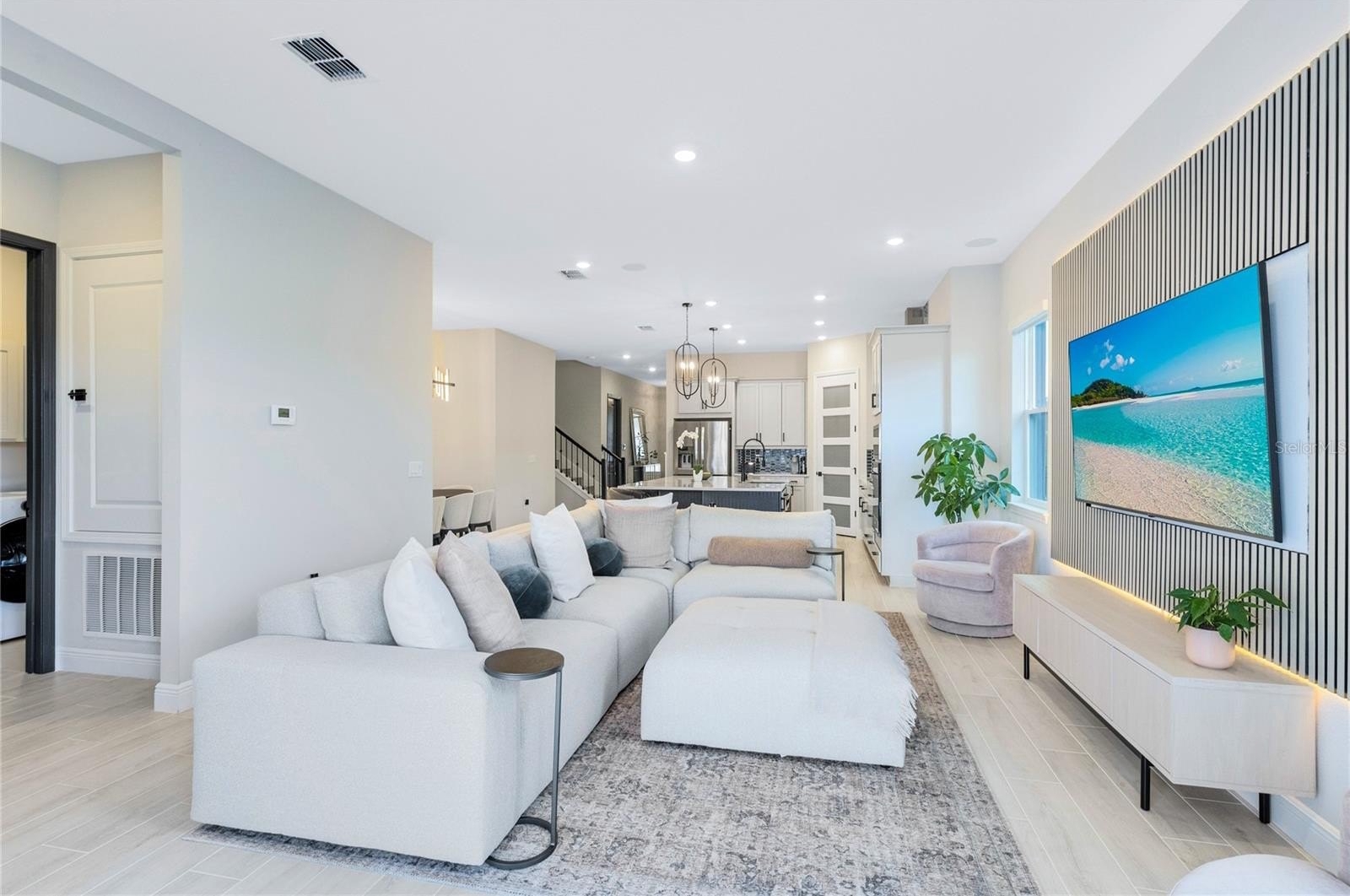 From the coastal inspired elevation and expanded paver driveway to the inviting covered front porch, this home makes a strong first impression. Inside, the open concept design is filled with natural light and enhanced by wide plank luxury vinyl flooring, custom finishes, and a seamless flow throughout the main living areas. The chef kitchen features a large quartz island, custom pantry shelving, stainless steel appliances, pot filler, and designer tile backsplash, opening effortlessly to the dining and living spaces with built in surround sound.