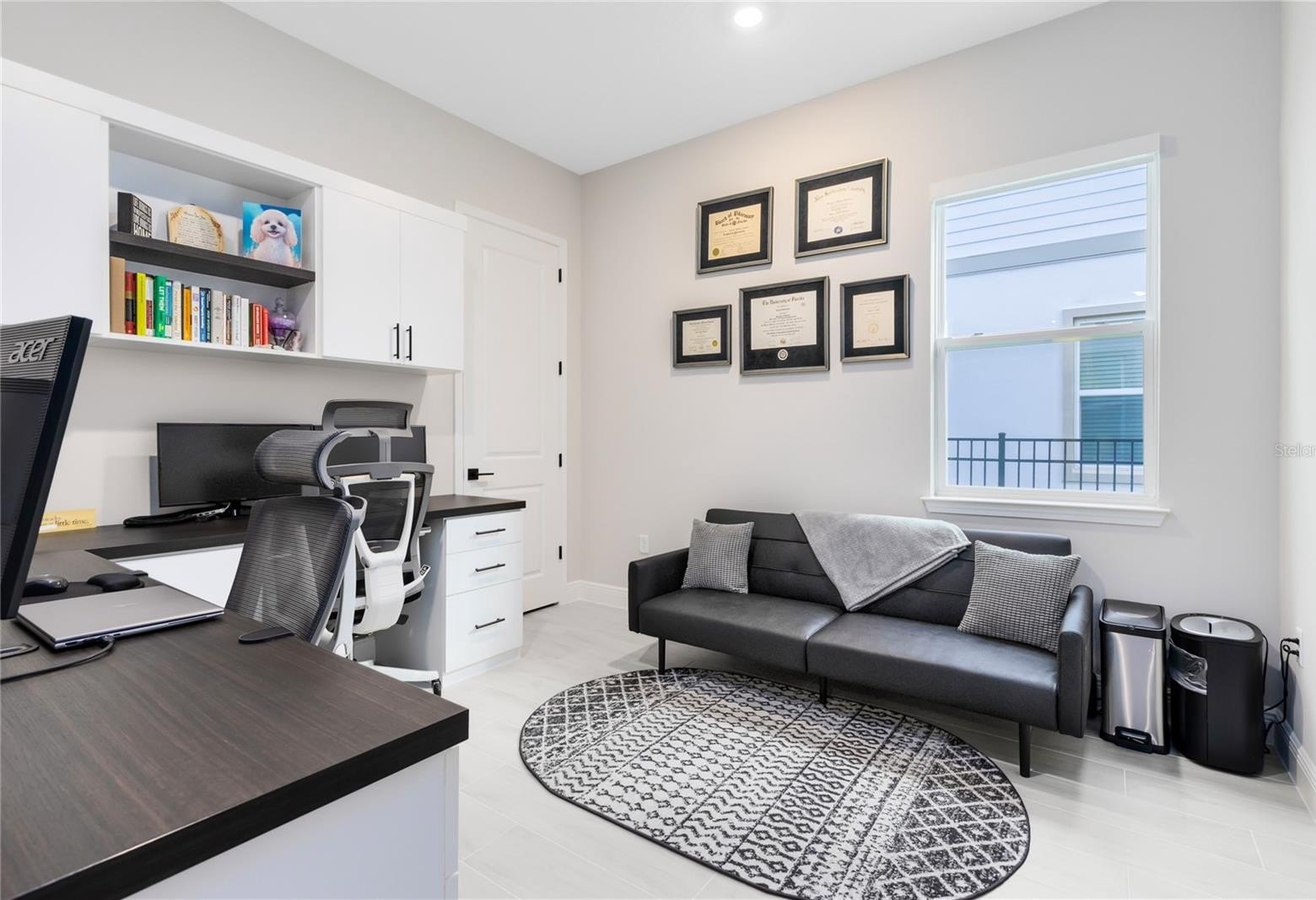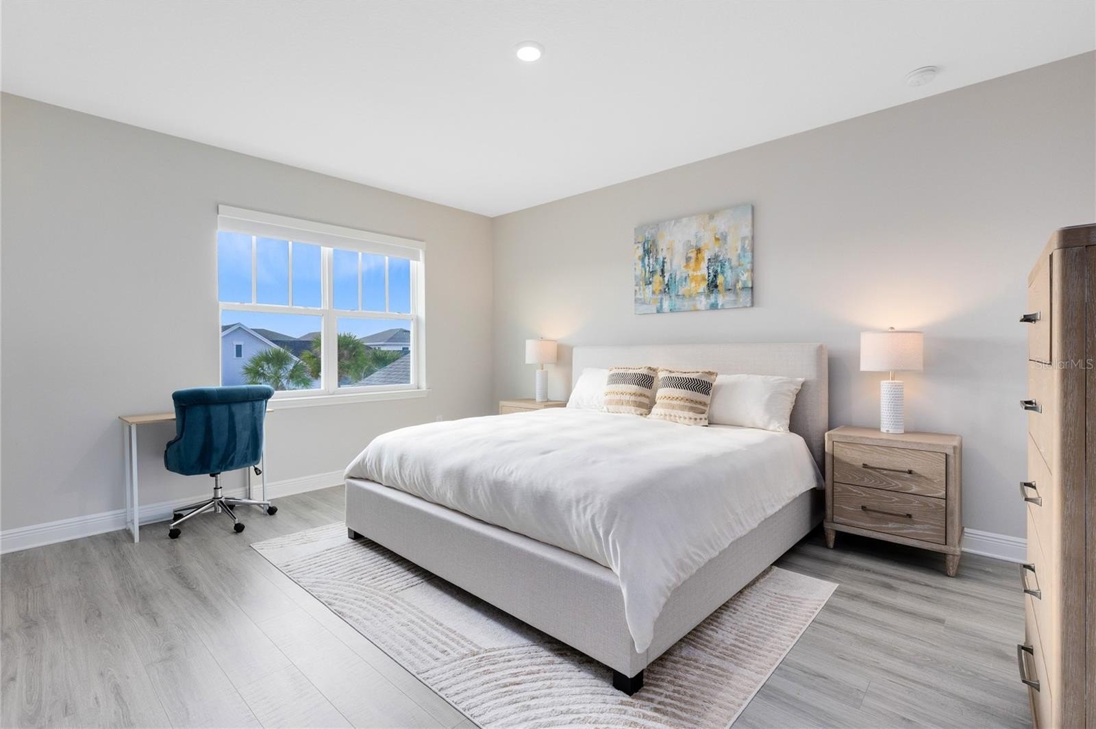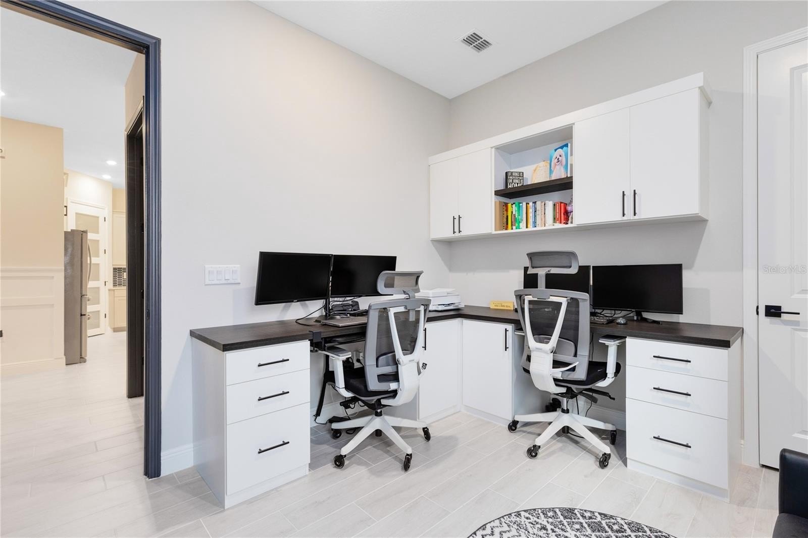 The first floor primary suite is a private retreat with a spacious bedroom, custom his and hers walk in closets, and a spa inspired bath with dual vanities, soaking tub, and an oversized walk in shower featuring both a standard shower head and a rain shower head. A first floor bedroom currently used as a home office offers flexibility for guests or additional living needs.