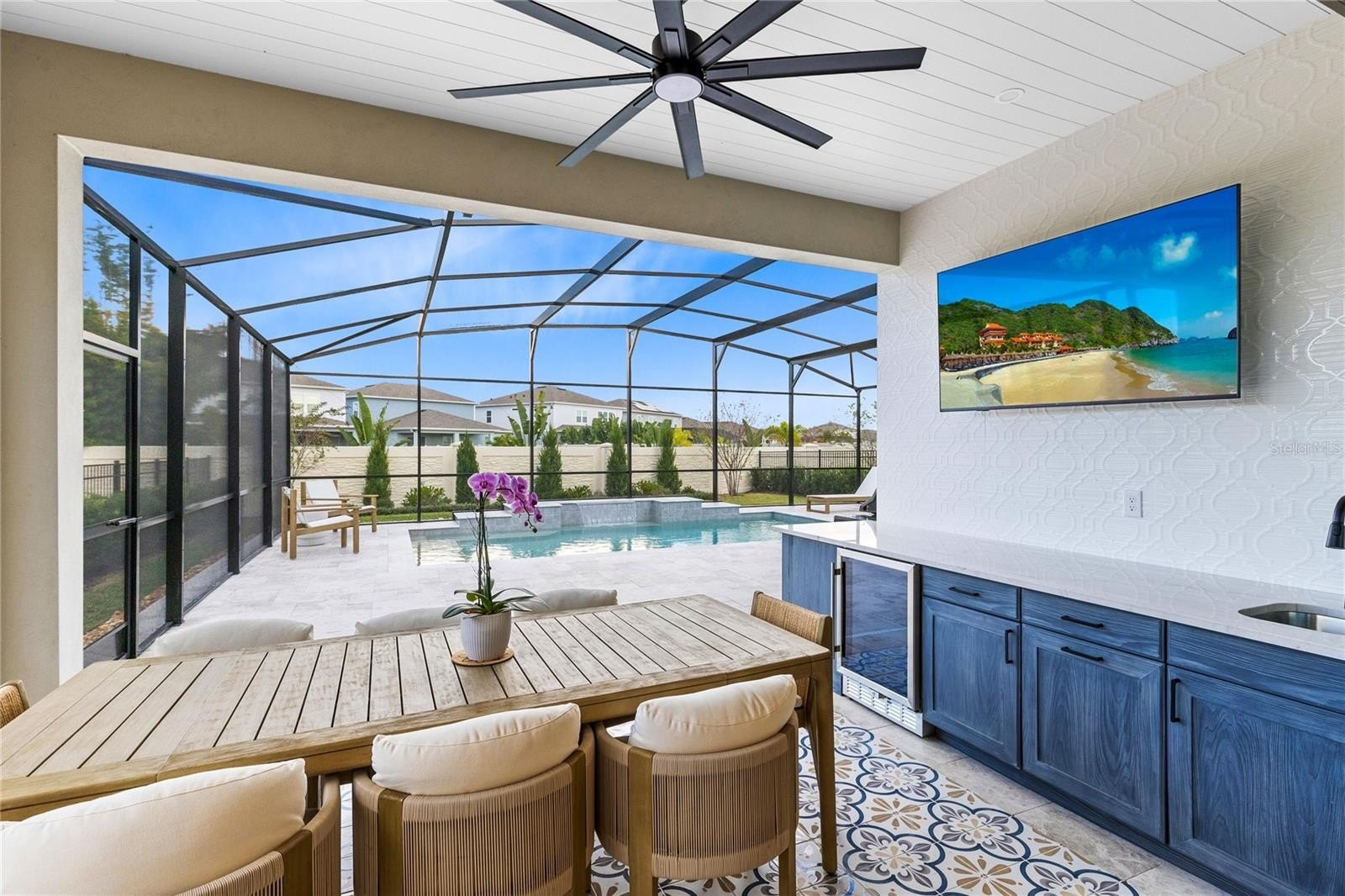 The fully screened pool area delivers true resort style outdoor living. Sealed travertine pavers surround a custom saltwater pool with raised wall waterfall accents and integrated lighting. The covered back patio features a custom wood ceiling, recessed lighting, and ceiling fan, while the outdoor kitchen is complete with Naturekast cabinetry, stainless sink, Moen faucet, refrigerator, mounted television, and surround sound. Large sliding glass doors open fully as pocket doors, creating a seamless indoor outdoor connection ideal for entertaining.