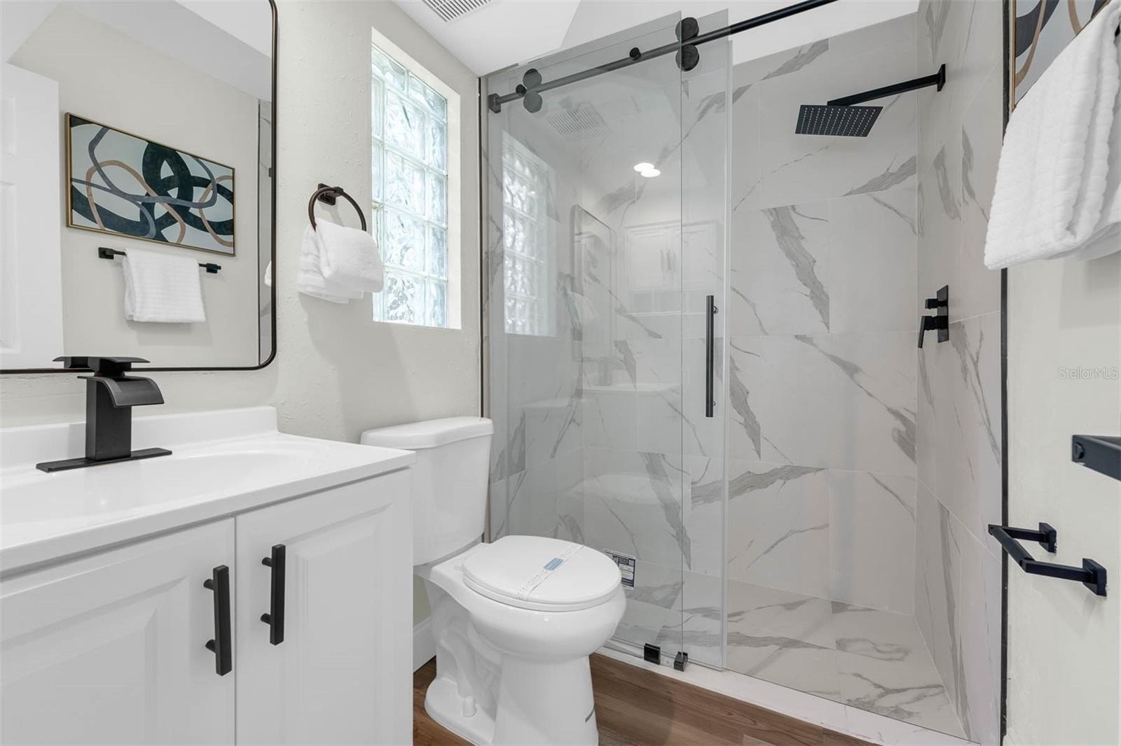 Both bathrooms have been fully renovated with luxury granite countertops and custom tile shower work, offering a spa-like experience.