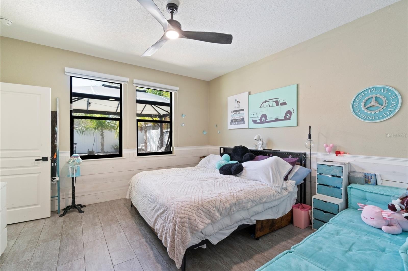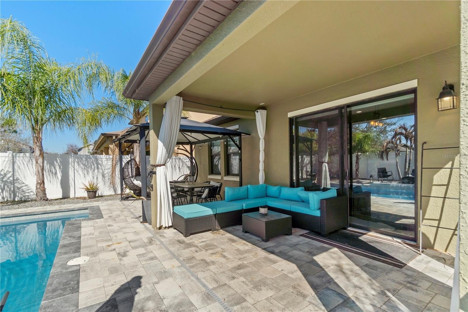 Welcome home to your beautiful and low maintenance private pool oasis in Orlando! If you don’t want to spend a ton of time maintaining and cleaning a large home and would rather spend your time enjoying the Florida sunshine, this is the perfect retreat for you! It’s beautifully updated. Four bedroom, two bathroom home is ideally located near the highly desirable Lake Nona area, in a private gated community. From the moment you walk in, you’ll notice the wood plank porcelain tile flooring that flows seamlessly throughout, creating a clean and modern feel. The open concept of living space is cozy, yet feels larger than life while your family enjoys a massive 125” custom framed, projector screen, and entertainment system. The kitchen features stunning quartz countertops, ample cabinetry, custom pantry inserts and a layout that opens perfectly to the main living areas, making it ideal for both everyday, living and entertaining. The custom remote controlled blinds in the dining space open to reveal where you will want to spend all of your time and can even eat al fresco. Step outside and experience what truly sets this home apart: an HGTV worthy backyard complete with a heated saltwater pool and spa that feels like your own private resort. Whether you’re hosting gatherings or simply unwinding, the covered outdoor area provide provides the perfect space to enjoy Florida living year-round and is complete with outdoor living furniture and accessories so you won’t have to invest… Just dive right in! The spacious primary suite is separate from the secondary bedrooms, making it truly a private retreat. It overlooks the backyard oasis with upgrades, including shiplap wainscoting, crown molding, and a large en-suite bathroom with an oversized, frameless tile shower, as well as a custom walk-in closet. Conveniently located just minutes from Lake Nona, Orlando, International Airport, major highways, downtown Orlando, and with easy access to world class attractions, dining, entertainment, this home offers the perfect blend of style, comfort, and location.
