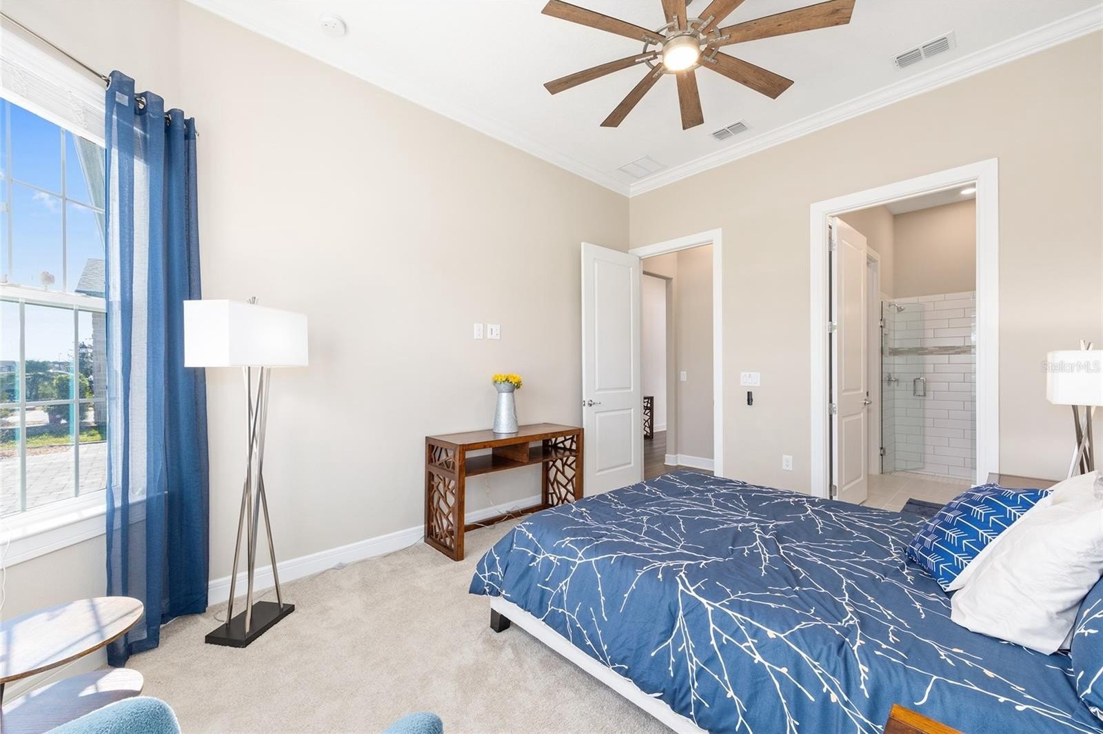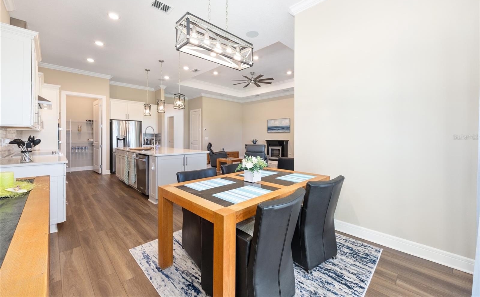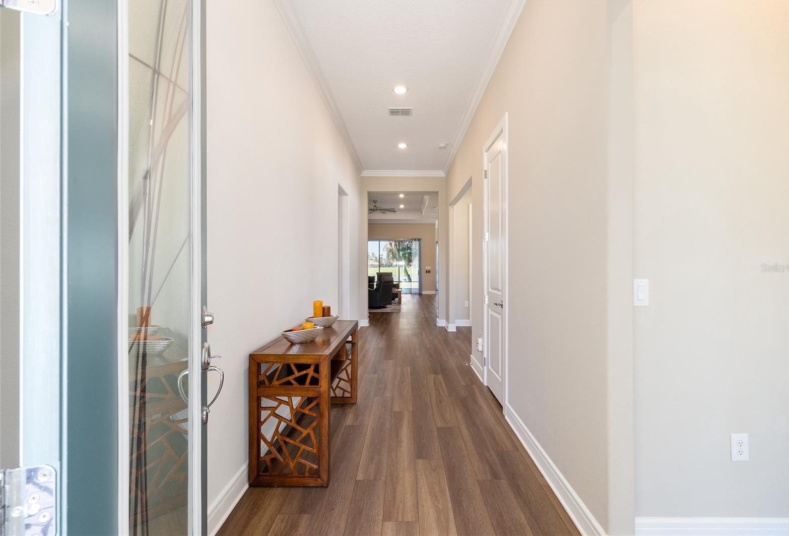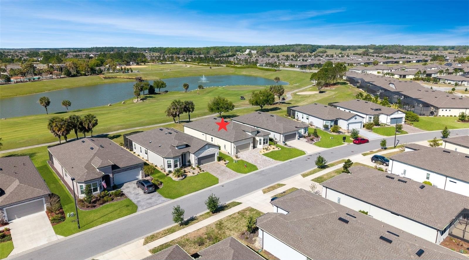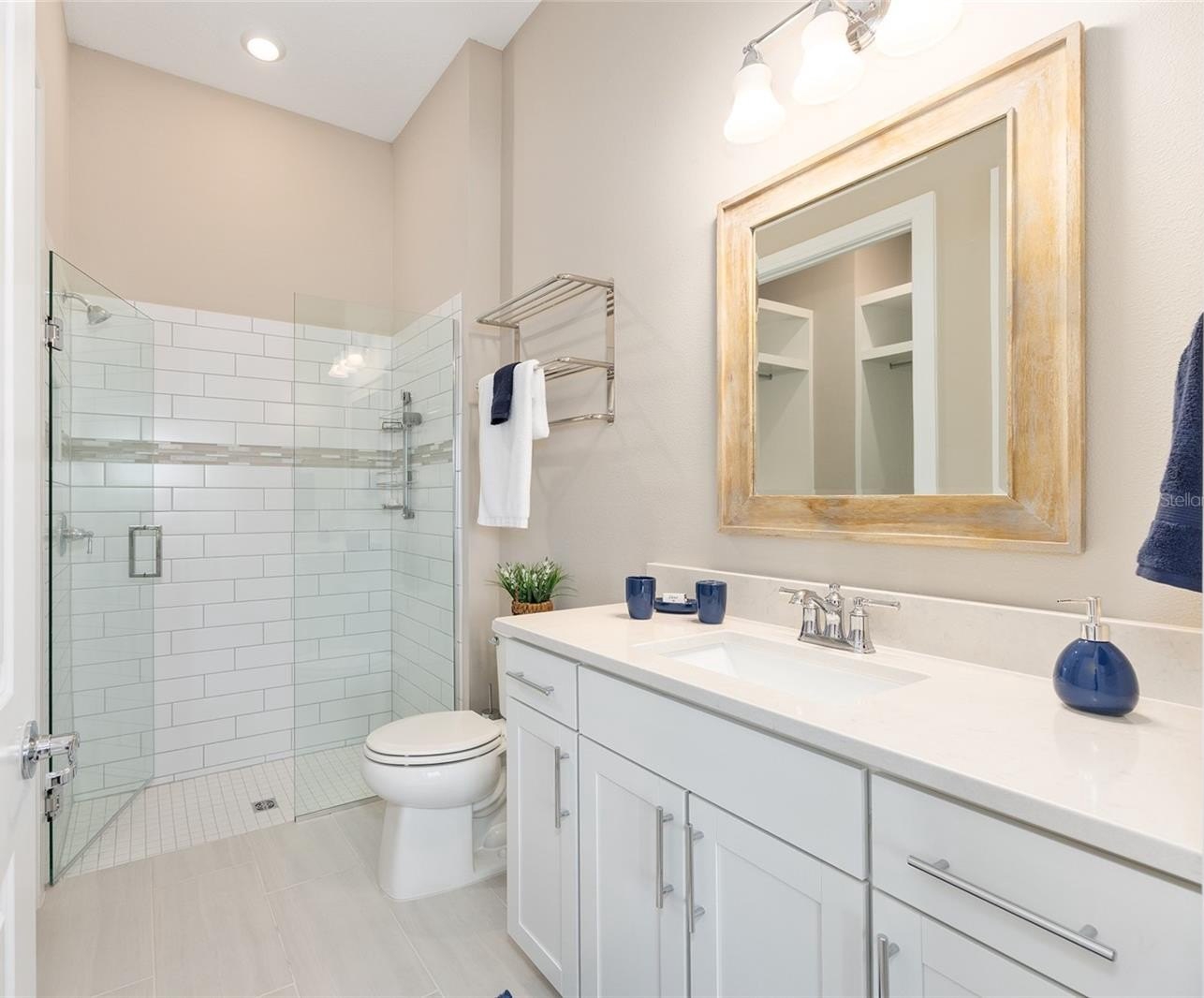 Extraordinary views set the tone for refined resort-style living in this beautiful 2-bedroom, 2.5 bath Prestige model, perfectly positioned on one of Stone Creek’s most desirable lots with tranquil golf course vistas and breathtaking waterfront scenes overlooking Reflection Bay. In this gated 55+ golf community known for its exceptional amenities, homes offering this rare blend of premier location, thoughtful upgrades, and elevated outdoor living are seldom available. Curb appeal begins with a recently sealed paver driveway and walkway, a Kordella glass-inset front door, and manicured landscaping enhanced with river rock ground cover and custom concrete curbing. Inside, the home offers an elegant setting for both everyday living and sunset entertaining, enhanced by a versatile bonus room/den with a decorative tray ceiling and a screened-in paver-lined lanai situated for privacy while enjoying the stunning views. Designed with luxury and comfort in mind, this open concept layout home features high ceilings, luxury vinyl plank flooring, and refined crown molding accents in the main living areas. The gathering room is further enhanced by a dramatic tray ceiling and dual sliding glass doors that blur the line between indoors and out, drawing your eye straight to the priceless views. The Chef’s Kitchen is a standout, offering Shaker-style cabinetry, sleek quartz countertops, a glass tile backsplash, stainless steel built-in appliances with a vented range hood, bar-height seating with pendant lighting, and a spacious walk-in pantry. The owner’s suite is a serene retreat with a drop-soffit ceiling, dual custom-designed walk-in closets, including one with a convenient laundry chute, and a spa-inspired bath featuring dual vanities and a zero-entry shower with decorative glass tile inlay and a transom window for soft natural light. A private secondary bedroom with its own full bathroom with an upgraded walk-in shower and walk-in closet, a separate powder room for guests, and a generous laundry room with a laundry tub, storage cabinets, and a folding table add everyday convenience. A well-placed mudroom offers access to the 4' extended garage offering overhead storage, rubber floor tiles, and ample room for a golf cart. Additional upgrades include a Kinetico water softener, blinds and ceiling fans throughout, and a whole-home surge protector for added peace of mind. Embrace the exceptional lifestyle of this vibrant community, featuring a 24/7 staffed gated entrance for security and peace of mind. Luxury-inspired amenities include heated pools, a state-of-the-art fitness center, a spa, and relaxing hot tubs and saunas. Stay active with pickleball, bocce, tennis, and a softball field, while a dedicated lifestyle staff curates entertainment, activities, and special events to foster connections. Just beyond the gates, enjoy a golf course, pro shop, and restaurant—perfect for socializing and unwinding. Make your move today and experience resort-style living at its finest!