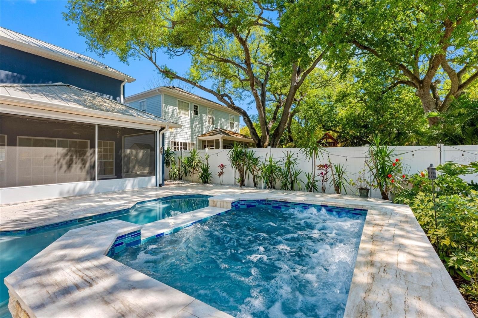 travertine decking. Surrounded by lush, manicured landscaping and complemented by a