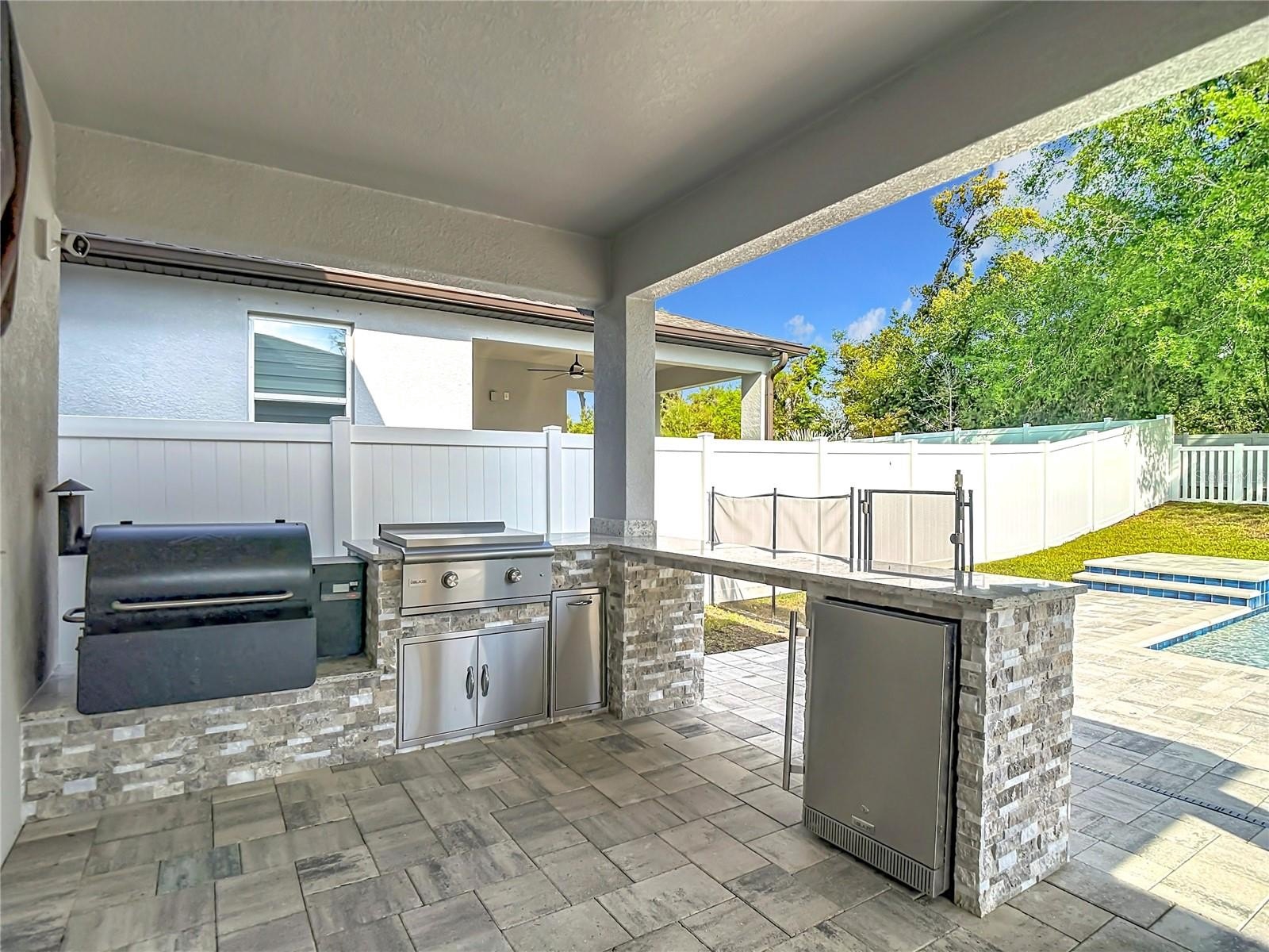 Premium Appliances: Massive stainless steel Blaze Griddle and a Traeger Wood-Fired Grill.