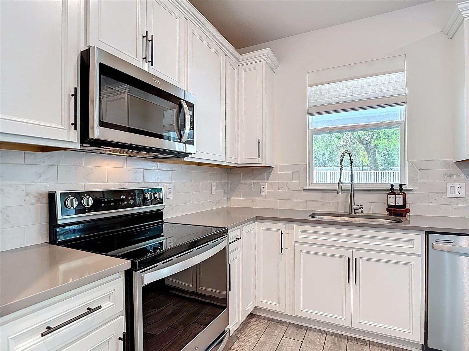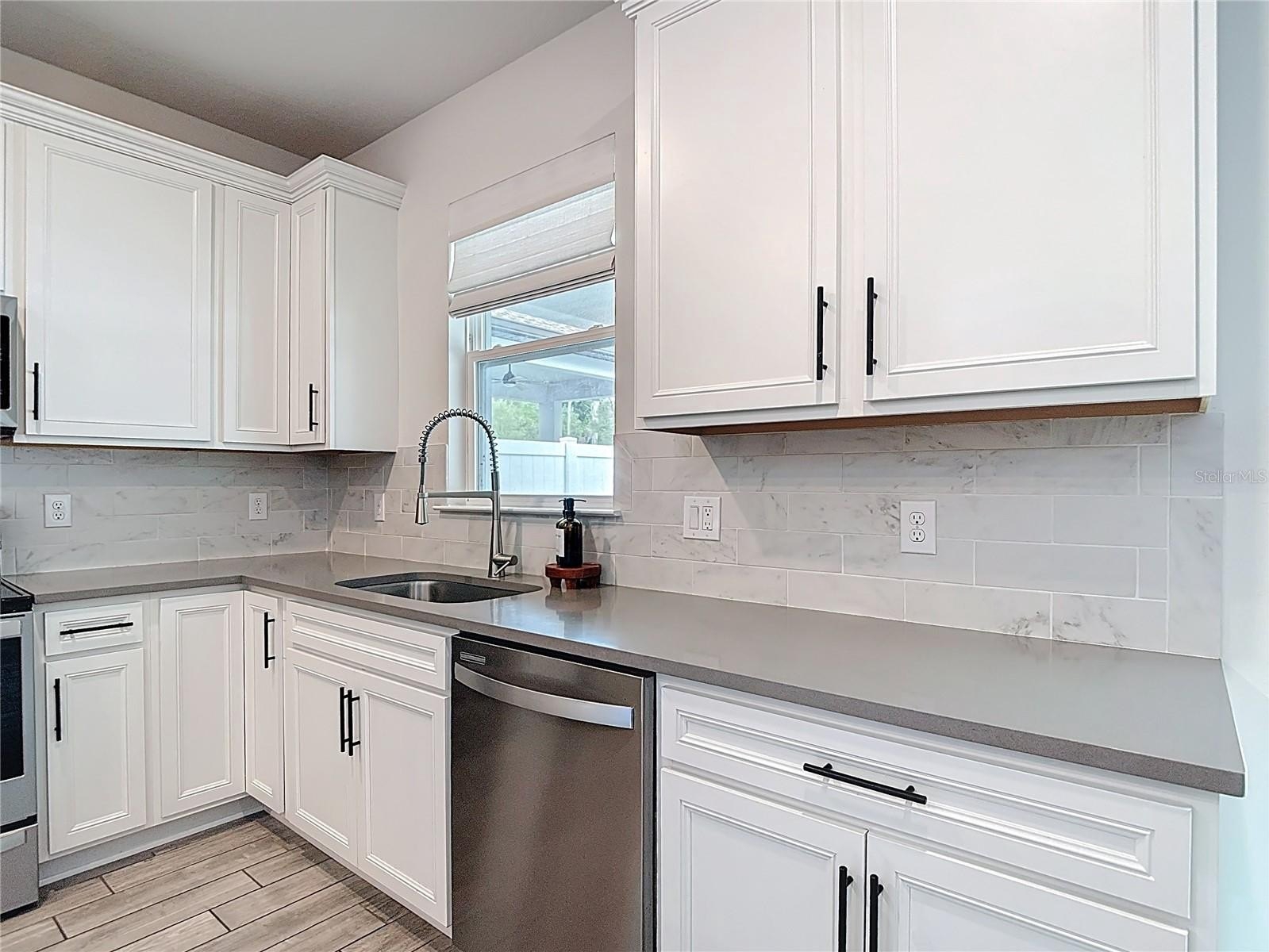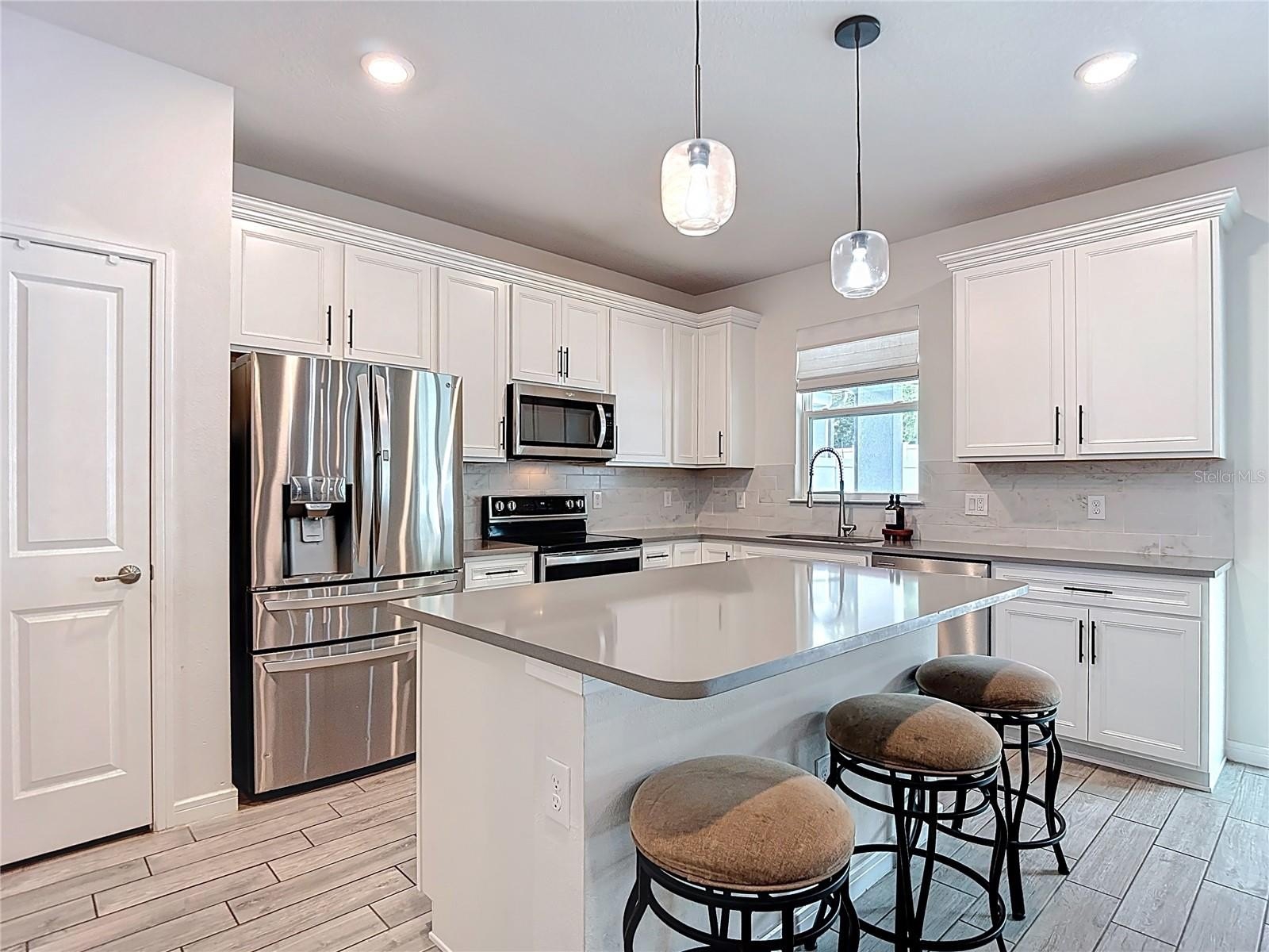 Convenience: Integrated beverage fridge and expansive quartz countertops for easy prep and serving.