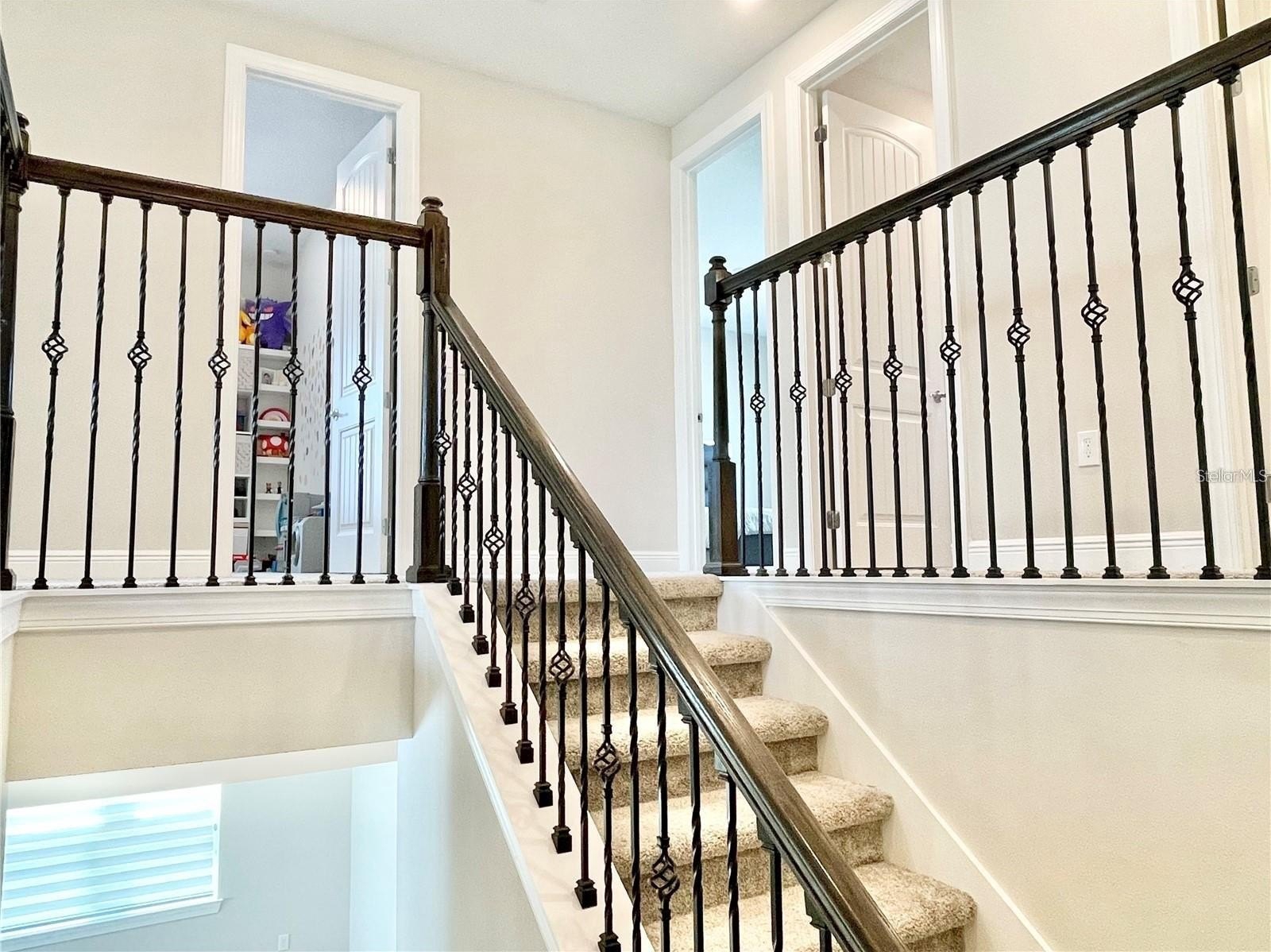 Designer upgrades include a stone-accented exterior, glass-inlay front door, tile flooring in the main living areas and bathrooms, stain-resistant carpet in the bedrooms and second floor, oak stair rail with iron spindles, upgraded trim and baseboards, and completed outdoor kitchen plumbing and pool electrical wiring.