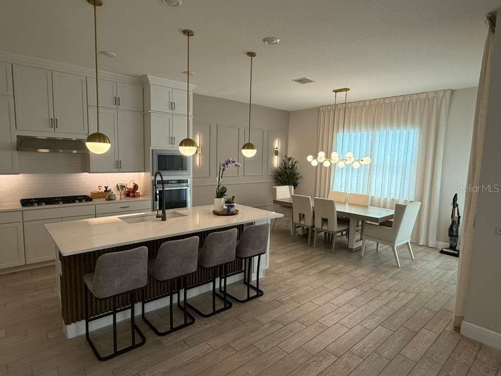 The gourmet kitchen features built-in appliances, a walk-in corner pantry, upgraded stacked white cabinetry, quartz countertops, a mosaic backsplash, under-cabinet lighting, and pendant lighting over the large center island.