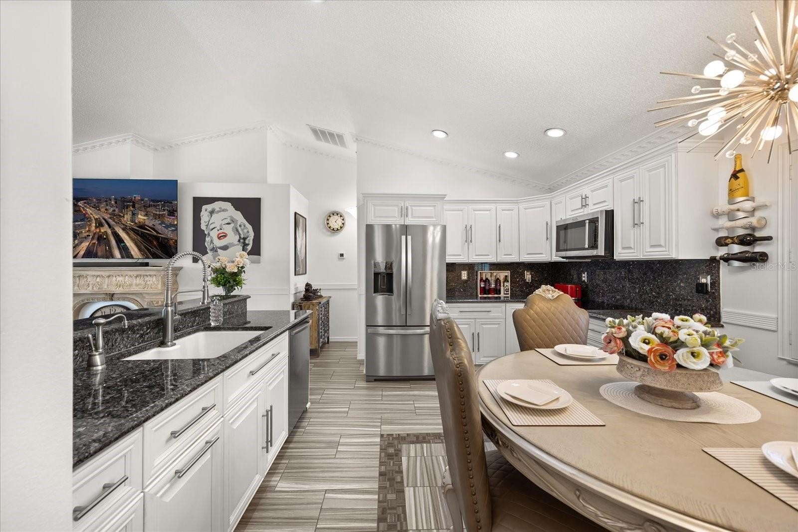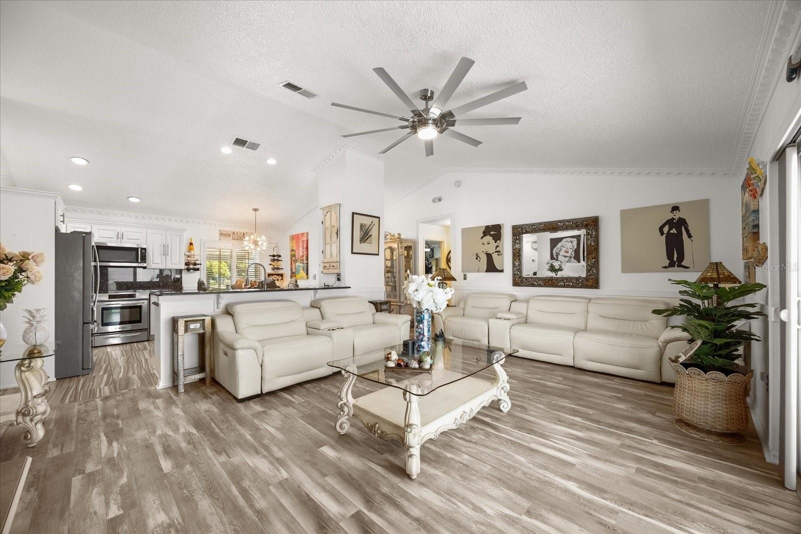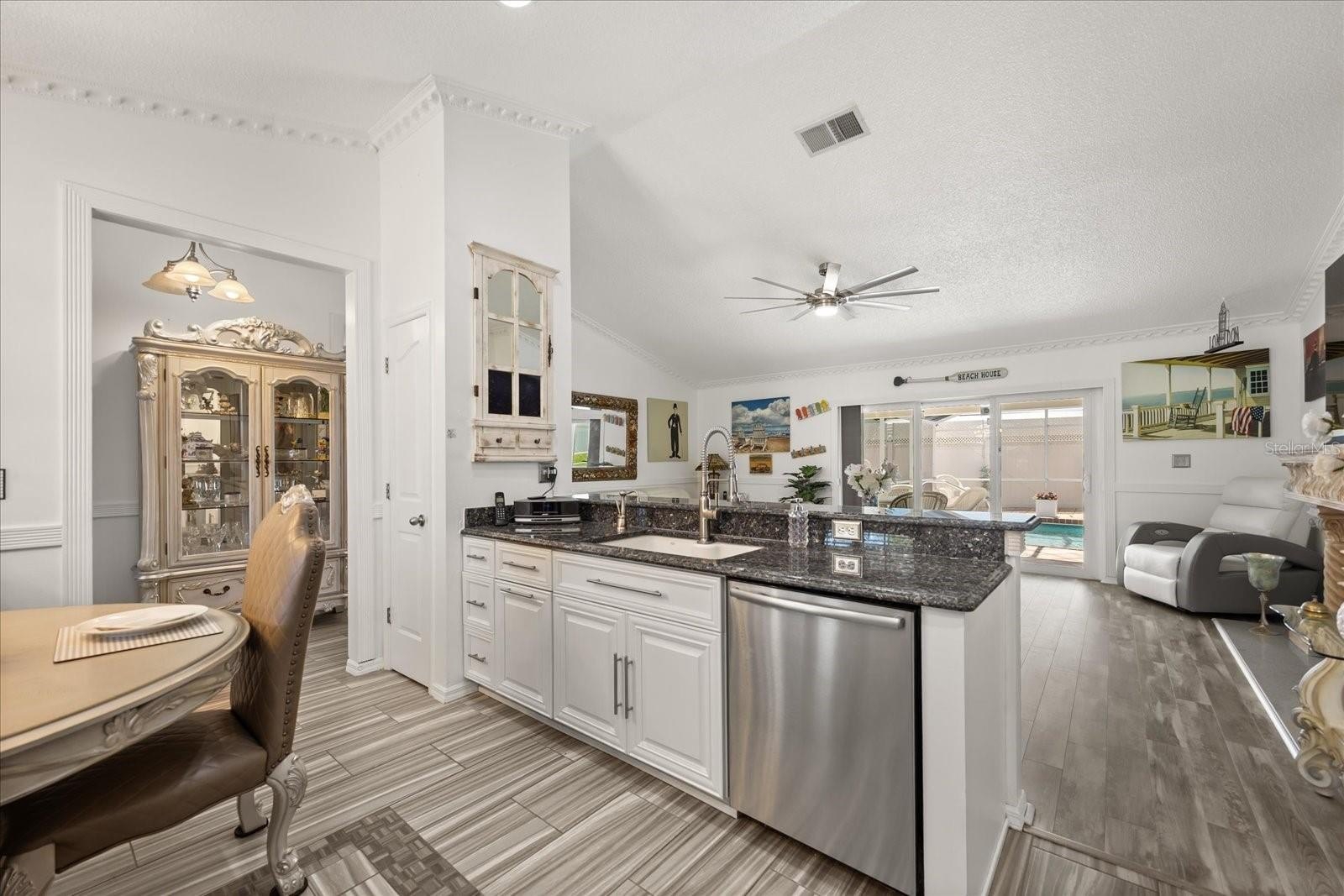 This is the kind of home that just feels right the moment you pull up—inviting, well cared for, and designed for easy Florida living. Situated on an oversized .27-acre corner lot, this beautifully maintained 3-bedroom, 2-bath home offers the perfect blend of indoor comfort and outdoor living. Step inside to a bright, open floor plan with vaulted ceilings, creating an airy, inviting atmosphere. So many upgrades to mention crown molding, plantation shutters, light fixtures, granite countertops in Kitchen and bathrooms. The main living areas feature luxury vinyl plank and tile flooring, with a clean and modern feel. The kitchen is both functional and elegant, complete with stainless steel appliances and seamless flow into the living and dining spaces—ideal for entertaining. The primary suite is a true retreat, featuring dual closets and a beautifully finished en-suite bath with elegant tile work, a soaking tub, and a separate walk-in shower. With direct access to the pool, it’s designed for effortless Florida living. Step outside to your screened-in private pool with stone pavers, surrounded by a fully fenced white vinyl yard and lush landscaping—perfect for relaxing, hosting, or enjoying quiet evenings at home. Even the garage is retreat with tile flooring and screened in door perfect for overlooking the beautiful curb appeal in the shade on a summer day. Located just minutes from Champions Gate and Reunion Resort & Golf Club, with easy access to major highways, shopping, dining, and Central Florida’s top attractions, this home offers both convenience and a lifestyle buyers are searching for. Well cared for, beautifully presented, and perfectly located—this is the one to see.