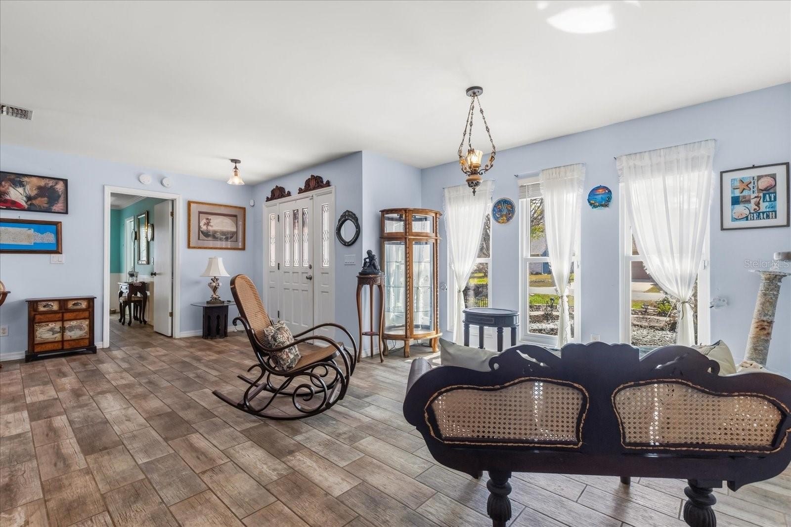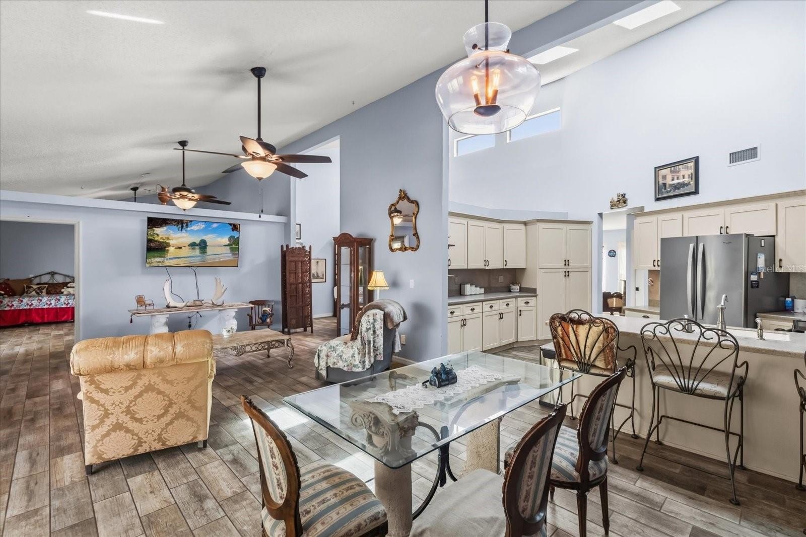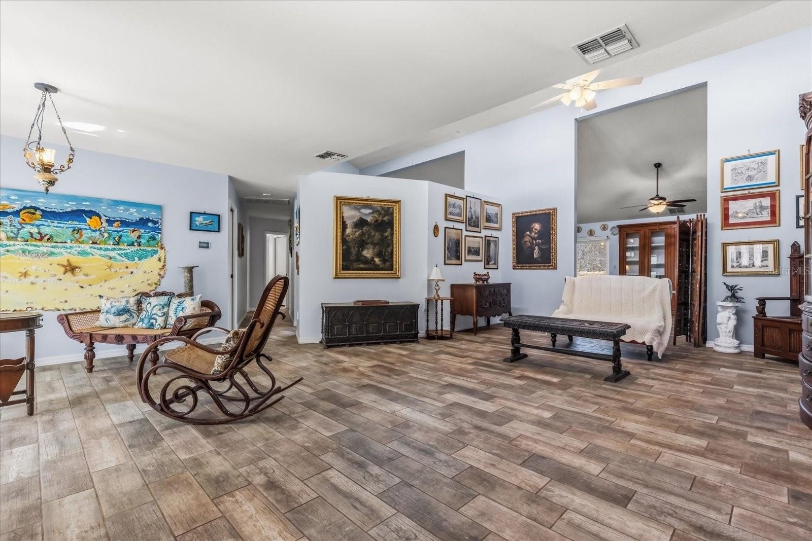 From the moment you step inside, you’ll be welcomed by soaring high ceilings and a spacious, light-filled layout that feels both elegant and inviting. This home offers 3 bedrooms, 2 full baths, a grand great room, formal living and dining areas, plus a flexible bonus room ideal for a home office, media room, hobby space, or potential 4th bedroom, perfect for today’s modern lifestyle. The bright kitchen shines with skylights, light cabinetry, modern appliances, and generous counter space, ideal for entertaining or everyday living. Retreat to the expansive primary suite featuring a large walk-in closet and a spa-inspired en-suite with jetted tub, walk-in shower, and skylight, creating a private sanctuary to unwind. Step outside and fall in love with the updated lanai, complete with new designer tile and stunning views of the former golf course and tranquil pond, a peaceful backdrop for morning coffee or sunset gatherings. Enhancing the indoor-outdoor lifestyle are two triple-panel, hurricane-rated collapsible sliding glass doors and new hurricane windows, flooding the home with natural light while providing energy efficiency and peace of mind. Additional upgrades include a new HVAC system and a new walk-in shower in the second bathroom, making this home truly move-in ready. Every detail has been thoughtfully updated and meticulously cared for. With its new price, premium upgrades, serene views, and flexible floorplan, this home is an exceptional value and won’t last. Schedule your private showing today and experience refined Florida living in Whispering Oaks Estates.