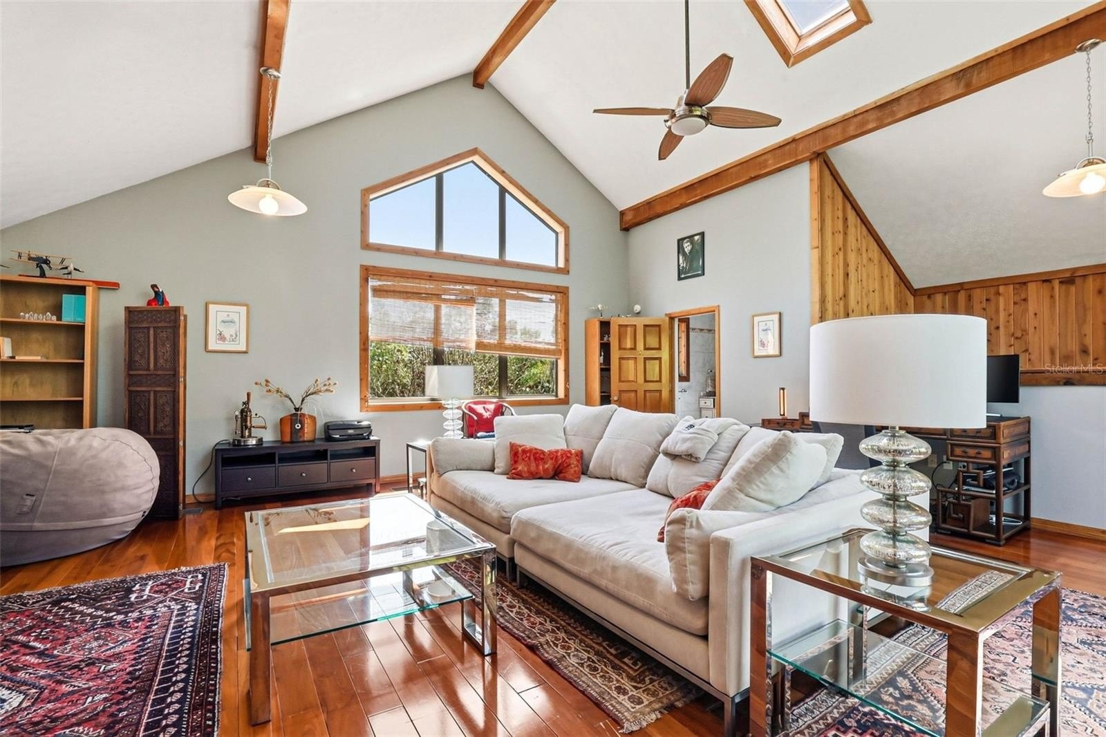 Step into a home full of character and warmth in the desirable Twin Branch community, where peace, privacy, and a true sense of neighborhood come together. Situated on over an acre of land, this 4BD/4BA home with a studio, features a bright, open living space highlighted by soaring vaulted ceilings with exposed beams, skylights, and large windows that fill the room with natural light, anchored by a cozy fireplace that adds to the home’s inviting feel. The newly updated kitchen offers generous counter space, abundant cabinetry, and a functional layout with a center island, flowing seamlessly into the main living areas for easy everyday living and entertaining. The attic has been thoughtfully converted into a bonus bedroom or studio with a full bathroom, providing flexible space for guests, a home office, or additional living. The primary suite offers direct access to the private pool area, creating a true retreat, while the expansive wooden deck overlooks the serene, tree-filled property - perfect for relaxing or hosting gatherings or events. Set on a spacious lot, there is plenty of space for gardening, whether you’re growing fruits, vegetables, or herbs. Twin Branch offers a quiet, secure setting with friendly neighbors and community gatherings, all while being conveniently located near downtown Tampa, international airports, and the area’s beautiful beaches. If you’re looking for space, charm, and a unique lifestyle opportunity, this home delivers. Schedule now for a private showing! ** Brand NEW ROOF & POOL PUMP Dec. 2025, Water heater 2020 **