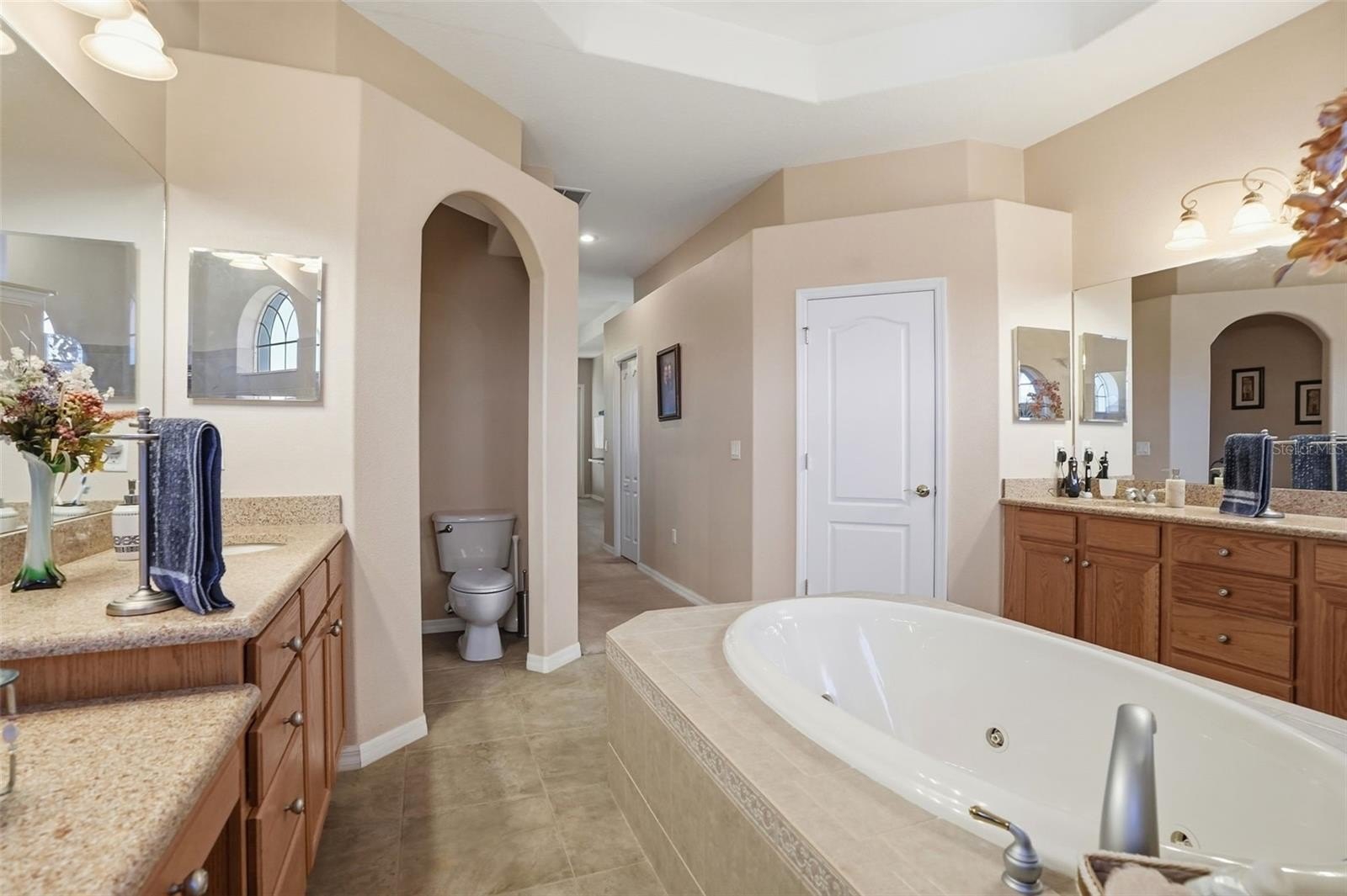 The master suite is large (22x14) with ensuite bathroom + dual walk-in closets + real wood cabinets + granite countertops +dual sinks and vanities + large soaking tub with walk through shower...spacious and beautiful!! The bedroom is large enough to have seating area, too, with views of the pool! Second and third bedrooms and good sizes and close to the second bathroom! The size of the laundry room is impressive itself with extra cabinets for storage and extra countertop space with laundry sink!! Foundation Stabilized. All ENgineer's Reports Available. Fully Financeable and Insurable!