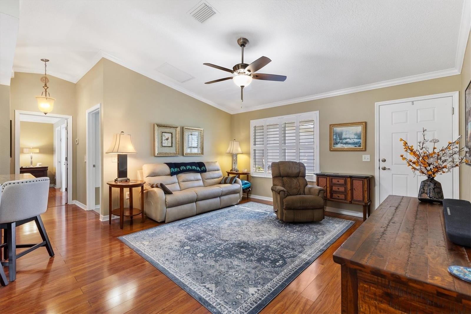 Step inside to soaring vaulted ceilings and an abundance of natural light enhanced by a solar tube, creating a bright, open, and inviting atmosphere. The home showcases seamless flooring throughout (no carpet), complemented by plantation shutters, elegant crown molding, and smooth ceilings free of popcorn texture, delivering a clean and polished look.