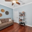 The first floor features an open-concept living and dining area with engineered hardwood floors and a generous kitchen equipped with granite countertops, a large cooking island, stainless appliances (2020), wood cabinetry, and a range with an air fryer feature. Double doors open to the main-floor office with a walk-in closet, making it easy to convert into a true fourth bedroom or guest suite. A half bath is also located on this level. Outdoor living includes a cozy front porch, private back patio, and a 2-car garage.