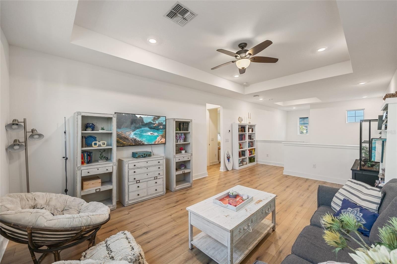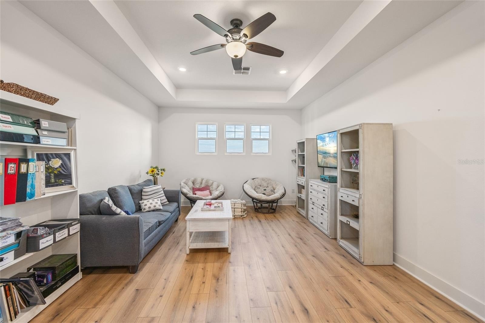 The open-concept great room flows through triple sliding glass doors onto a large screened-in patio, perfect for outdoor dining, entertaining, or quiet evenings surrounded by nature. The backyard faces a peaceful conservation area, offering privacy and a serene green backdrop with room to add a future pool if desired.