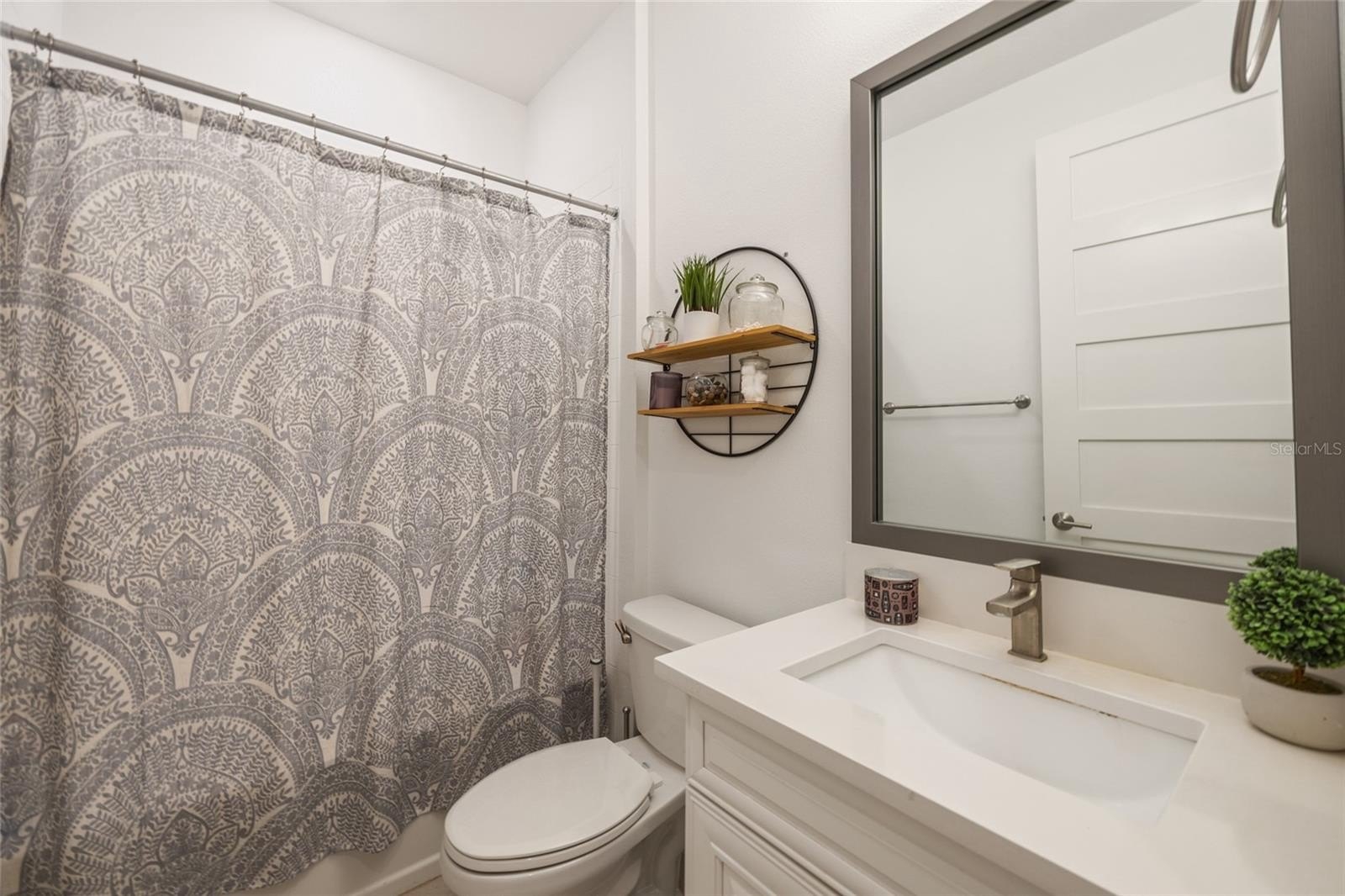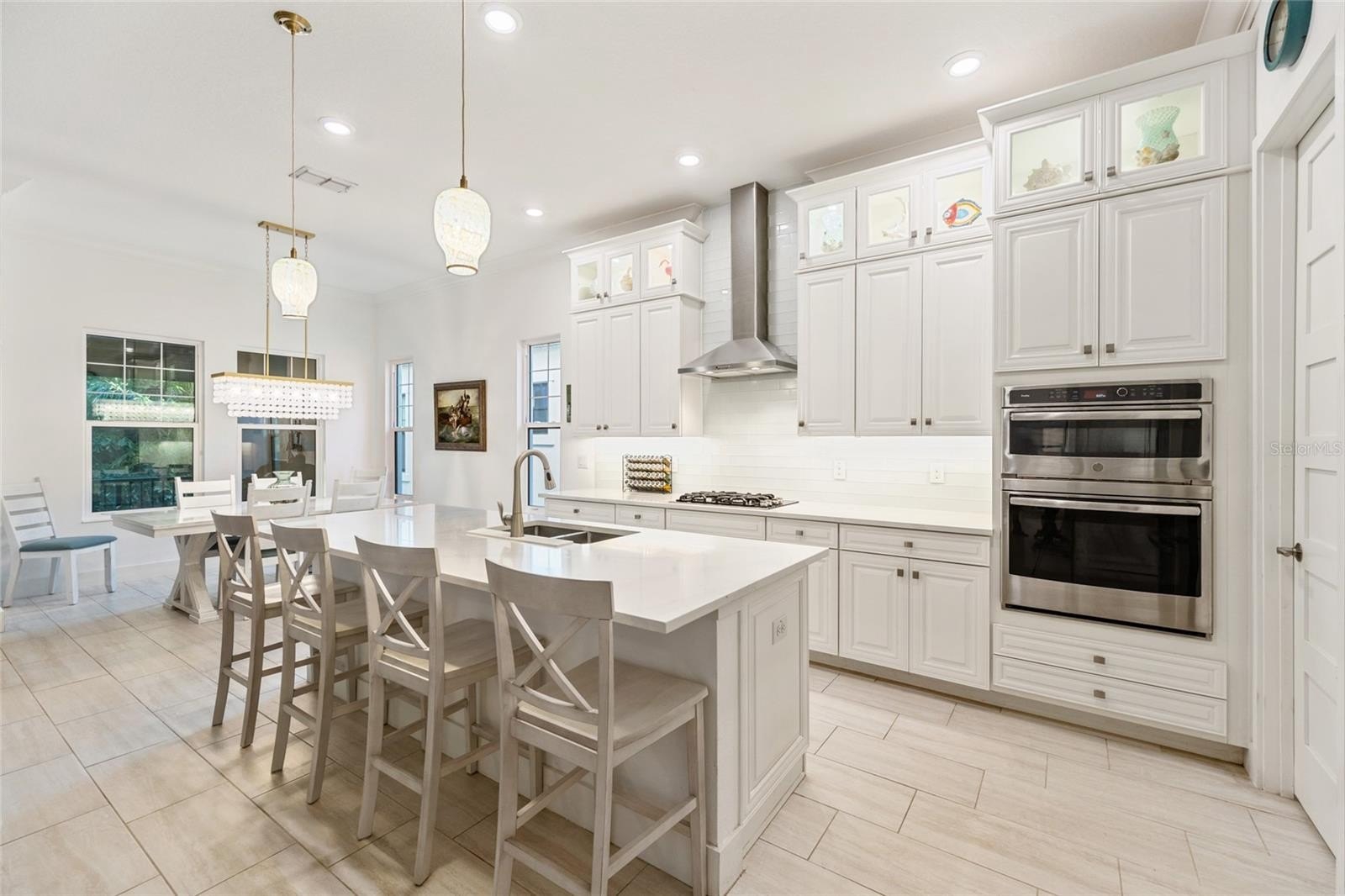 The chef’s kitchen is a showpiece, featuring 42-inch Sierra Vista painted linen cabinetry with custom trim, Calcutta Gold polished quartz countertops, GE Profile stainless appliances, satin nickel hardware, and Esplanade Hall ceramic tile laid in a 70/30 offset pattern for a designer finish.