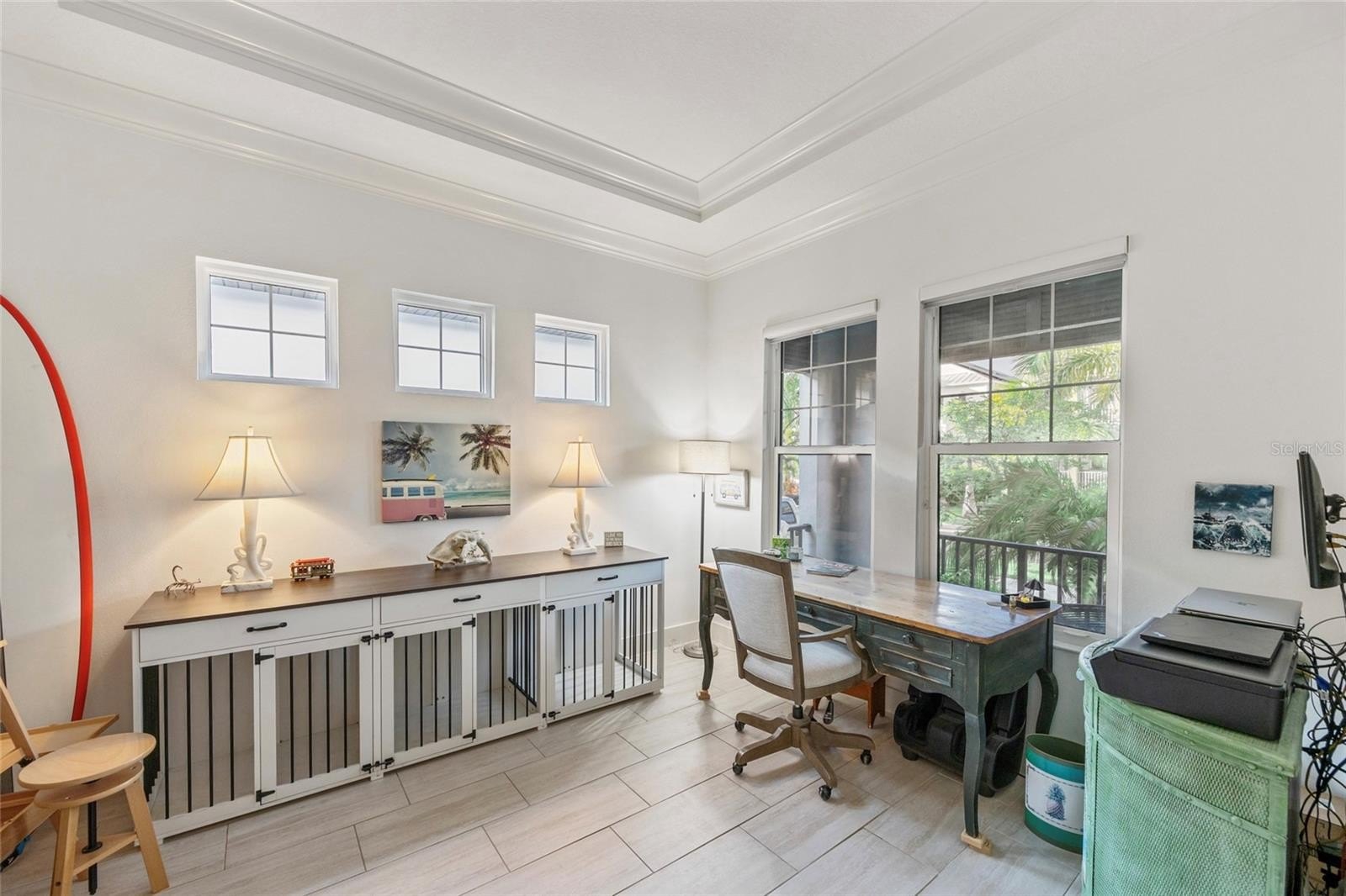 The grand entry welcomes you with a soaring 22-foot foyer ceiling and 8-inch crown molding. A glass-enclosed office with custom finishes provides an elegant work-from-home space, setting the tone for the rest of the home’s sophisticated design.