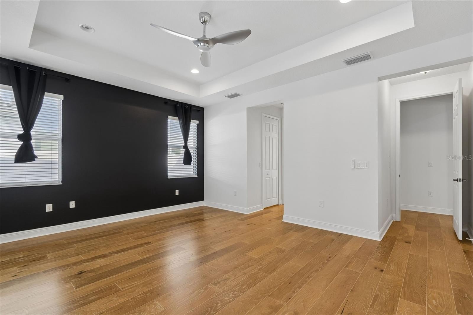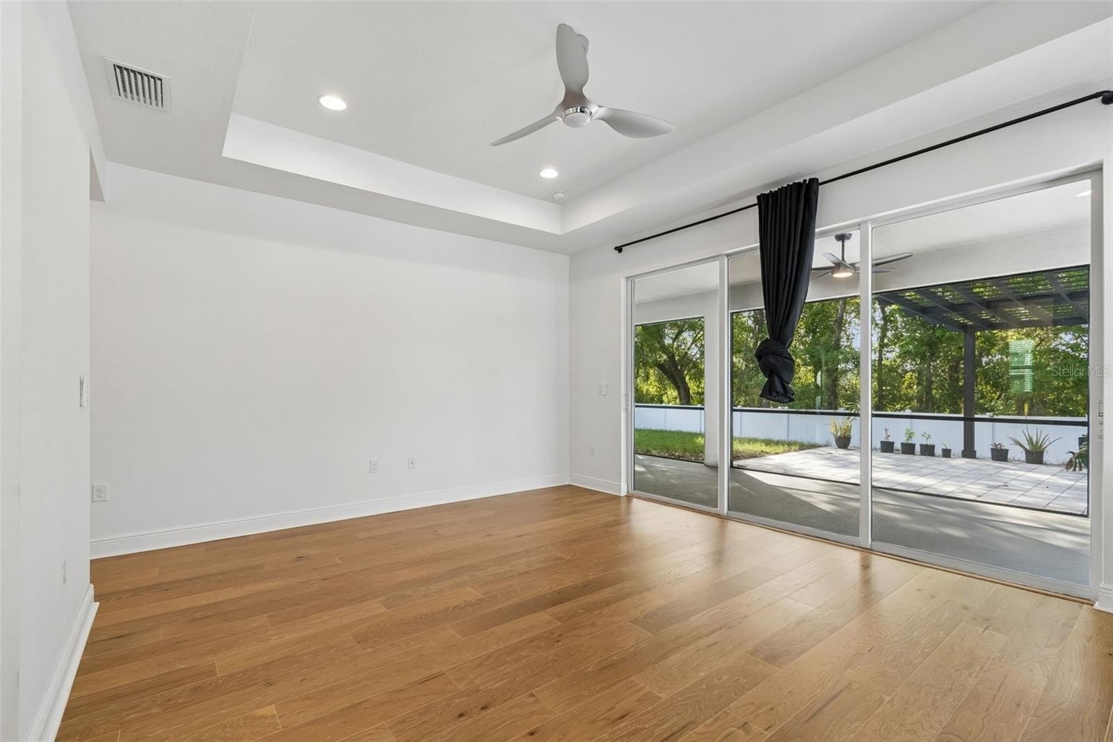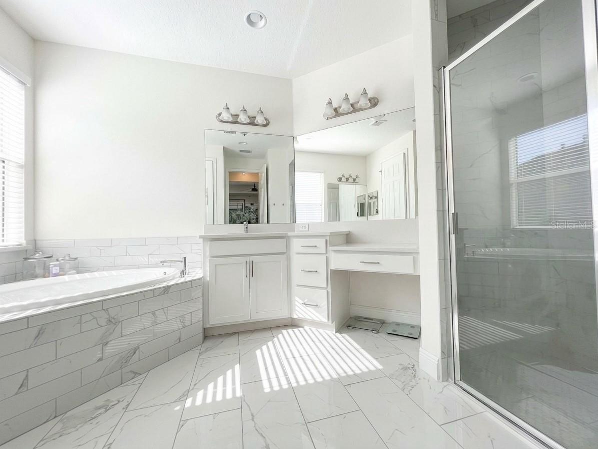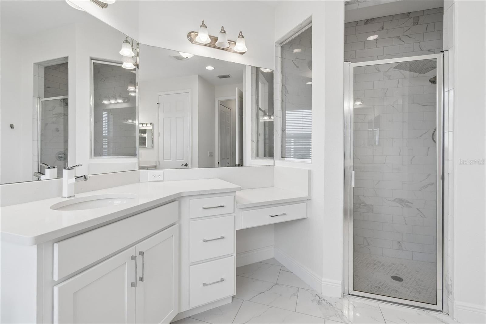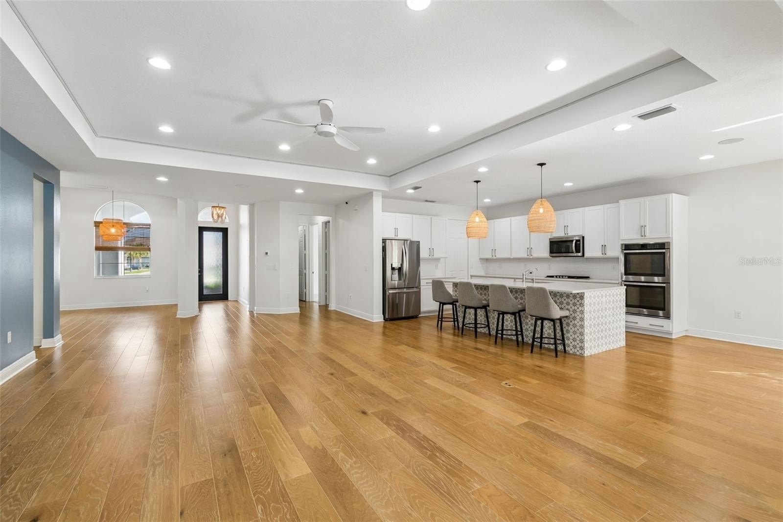 The well-designed 3-way split floor plan enhances privacy, while the luxurious primary suite offers a spa-like bath with quartz countertops, a soaking tub, a walk-in shower, and lanai access. The gourmet kitchen is a chef’s delight, featuring quartz countertops, a gas range with a double oven, a large island, and a bright breakfast nook. Three additional bedrooms, including a Jack-and-Jill bath, provide flexible living options.