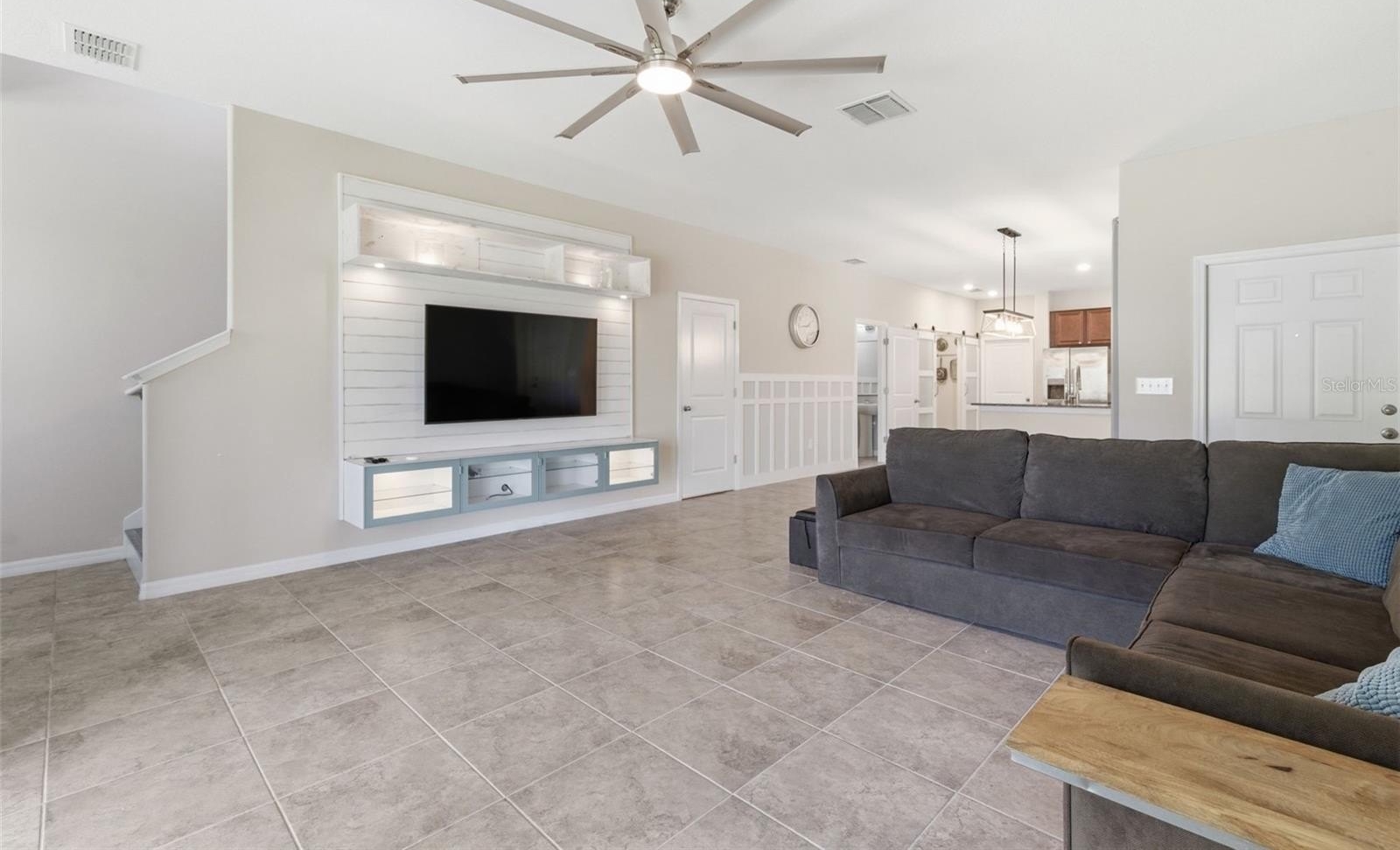 BEAUTIFULLY UPGRADED! Welcome to this stunning corner-unit townhome in the gated community of Riverview Lakes, offering over 2,200 square feet of thoughtfully designed living space with tranquil pond views and a true sense of privacy. This spacious four-bedroom, two-and-a-half-bath home features all bedrooms upstairs, creating a functional layout with a natural separation between living and private spaces. Throughout the home, you’ll find no carpet, with luxury vinyl plank flooring extending across the stairs and all bedrooms for a clean, modern look. The main living area stands out with custom design elements rarely found in townhomes, including detailed wainscoting and a built-in entertainment wall with a wood accent feature that creates a warm, high-end focal point. The kitchen is both stylish and functional, featuring granite countertops, stainless steel appliances, abundant cabinetry, and an open layout ideal for everyday living and entertaining. Just off the kitchen, the designer pantry is thoughtfully upgraded with barn doors and built-in organization, offering both character and convenience. Additional upgrades include a fully customized primary closet system and a dedicated laundry room with a folding station and added cabinetry. A two-car garage with extra storage and workspace further enhances the home’s functionality. As a premium corner unit, this property benefits from additional natural light and a more private setting. Enjoy peaceful pond views from the screened patio or take advantage of the community’s gated amenities, including a private dock for fishing or relaxing. Ideally located near shopping, dining, and major roadways, this home offers the perfect balance of space, upgrades, and lifestyle.