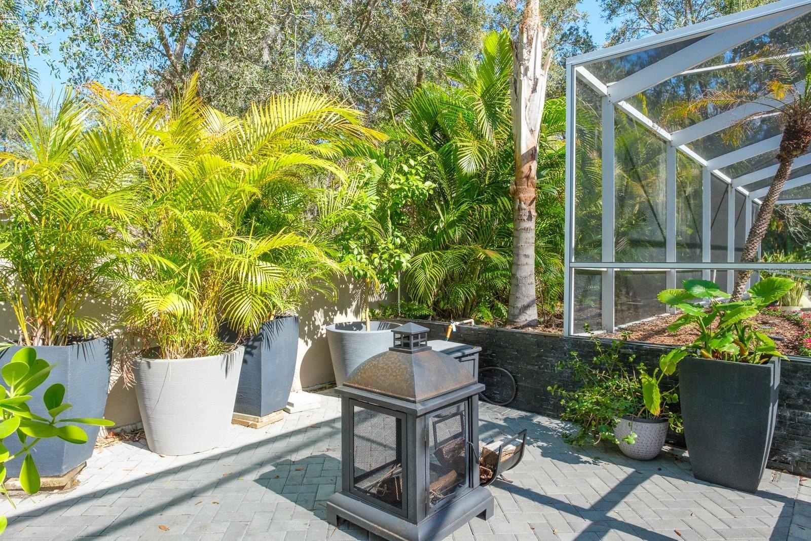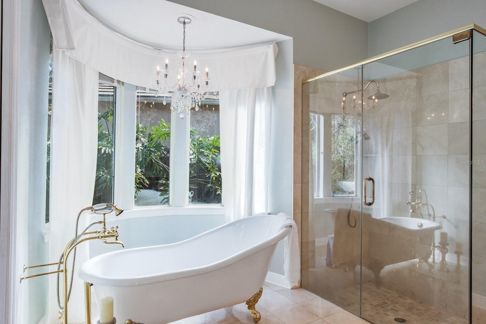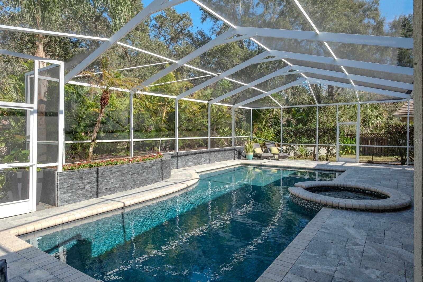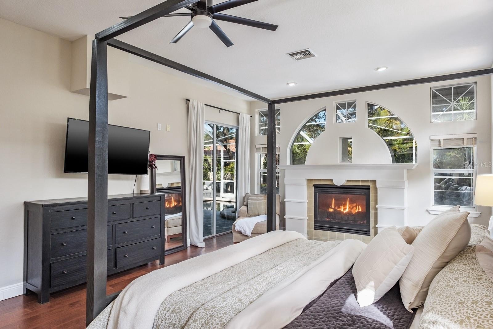 The luxurious primary suite serves as a private retreat with sliding doors opening to the patio. A grand gas fireplace with a custom mantel adds character, while the spa-inspired bathroom features dual vanities, a private water closet, a walk-in shower with dual showerheads, and a stunning clawfoot soaking tub positioned in a bay window beneath a chandelier. Expansive walk-in closets with custom built-ins complete the suite. Outdoor living is equally impressive. The backyard showcases an oversized pool with automation, solar heating, and a spillover spa with optional propane heating. Travertine pavers surround the pool area, and the covered screened patio provides multiple seating and entertaining spaces. Mature landscaping and decorative accent planters create a private resort-style setting. The irrigation system utilizes reclaimed water. Additional highlights include a barrel tile roof (2013), brick-paver driveway, oversized three-car garage, large laundry and mudroom, updated HVAC systems with UV lights (2016 and 2019), a water softener system, and a 100-gallon propane tank serving the pool, spa, and range. Most solar panels have been replaced within the past four years, and the exterior was freshly painted in 2017.