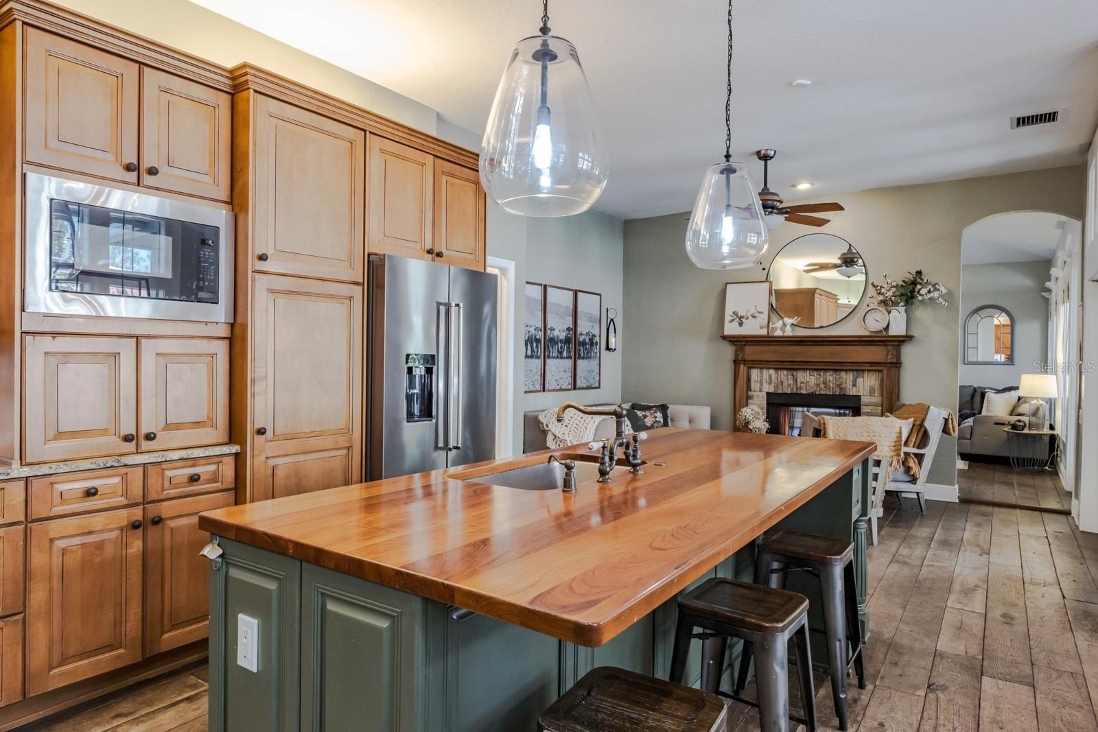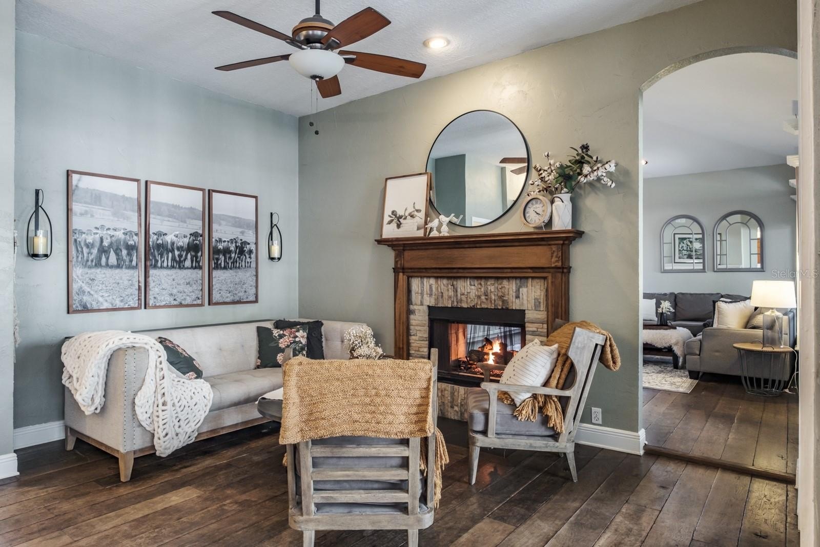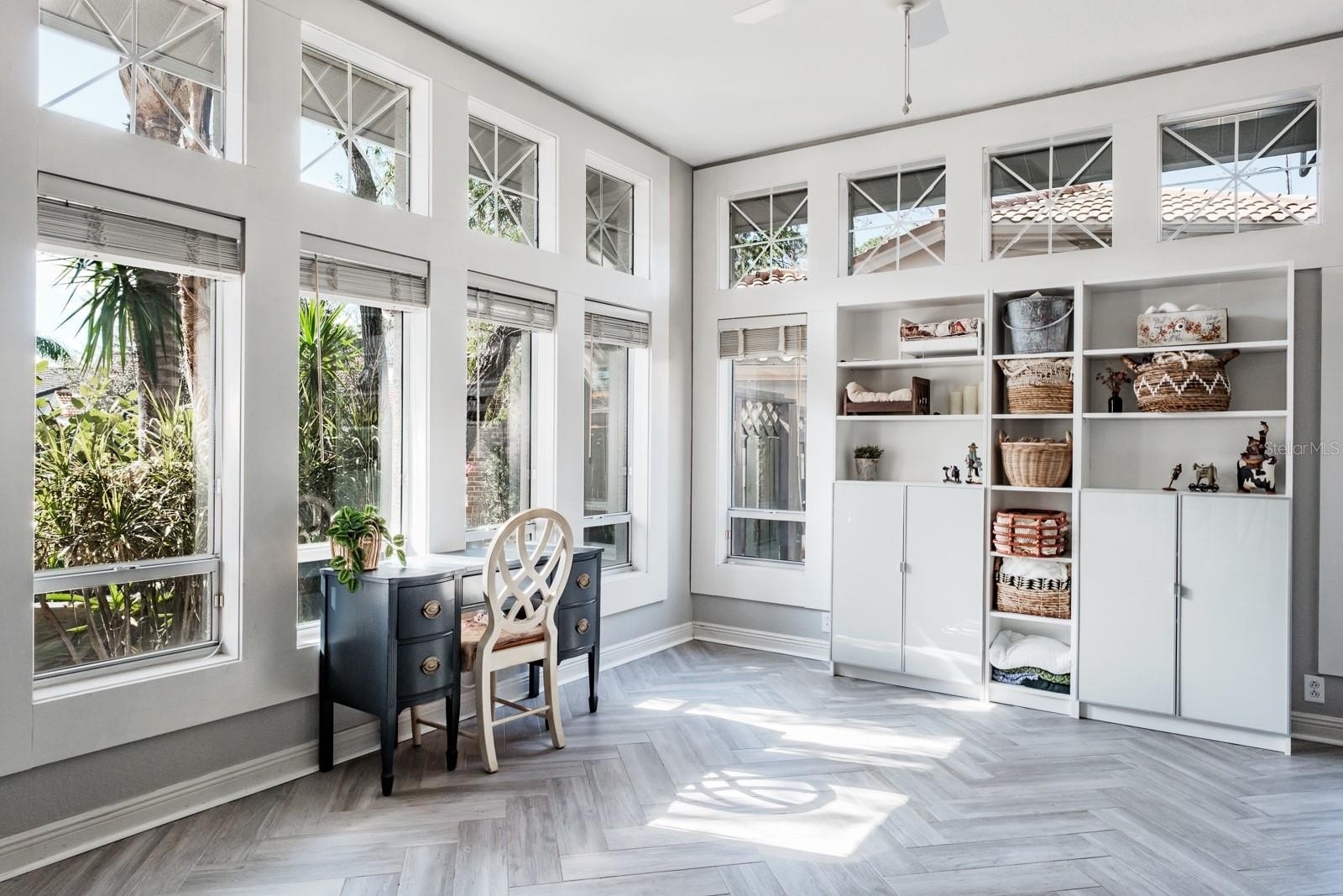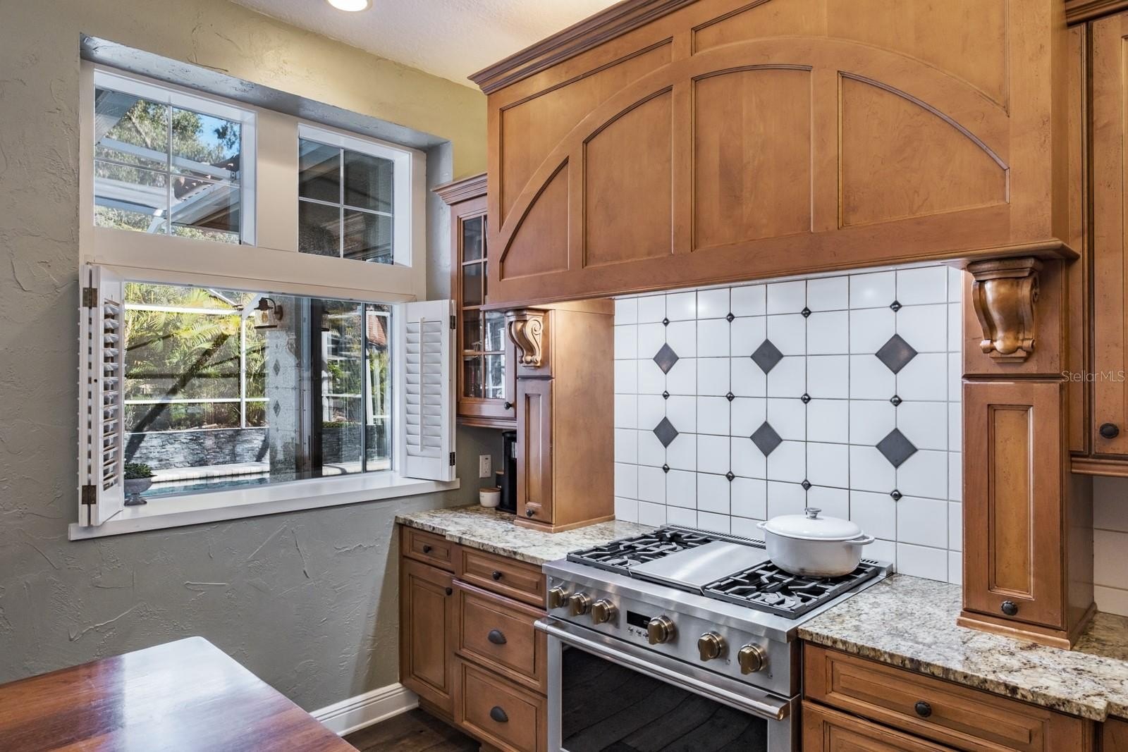 The luxurious primary suite serves as a private retreat with sliding doors opening to the patio. A grand gas fireplace with a custom mantel adds character, while the spa-inspired bathroom features dual vanities, a private water closet, a walk-in shower with dual showerheads, and a stunning clawfoot soaking tub positioned in a bay window beneath a chandelier. Expansive walk-in closets with custom built-ins complete the suite. Outdoor living is equally impressive. The backyard showcases an oversized pool with automation, solar heating, and a spillover spa with optional propane heating. Travertine pavers surround the pool area, and the covered screened patio provides multiple seating and entertaining spaces. Mature landscaping and decorative accent planters create a private resort-style setting. The irrigation system utilizes reclaimed water. Additional highlights include a barrel tile roof (2013), brick-paver driveway, oversized three-car garage, large laundry and mudroom, updated HVAC systems with UV lights (2016 and 2019), a water softener system, and a 100-gallon propane tank serving the pool, spa, and range. Most solar panels have been replaced within the past four years, and the exterior was freshly painted in 2017.
