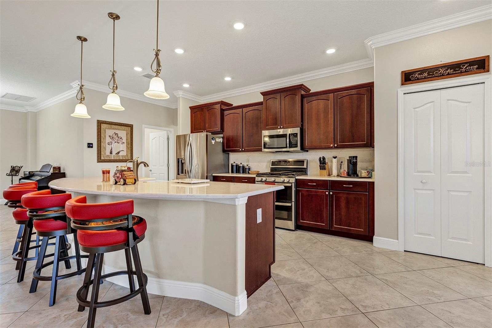 OPEN CONCEPT FLOOR PLAN GREAT FOR ENTERTAINING, High ceilings, Crown Molding and tile flooring on diagonal in main parts of the home, luxury vinyl plank flooring in other rooms except family room/ office/ man cave overlooking golf course, Kitchen has bar top w/room for 4 stools, closet pantry, plenty of Quartz countertops and soft close cabinets and drawers with pull-outs, Stainless fridge & gas range w/double oven that stays, separate indoor laundry room with W & D that stay, one of the guest multi-purpose bedrooms has a built-in desk & 2 murphy beds that folds down from wall when you need an extra beds for guest, home constructed to wind code, high & dry elevation NO FLOODING OR STORM SURGE and low wind zone which qualify home for deep discounts & affordable insurance premiums.