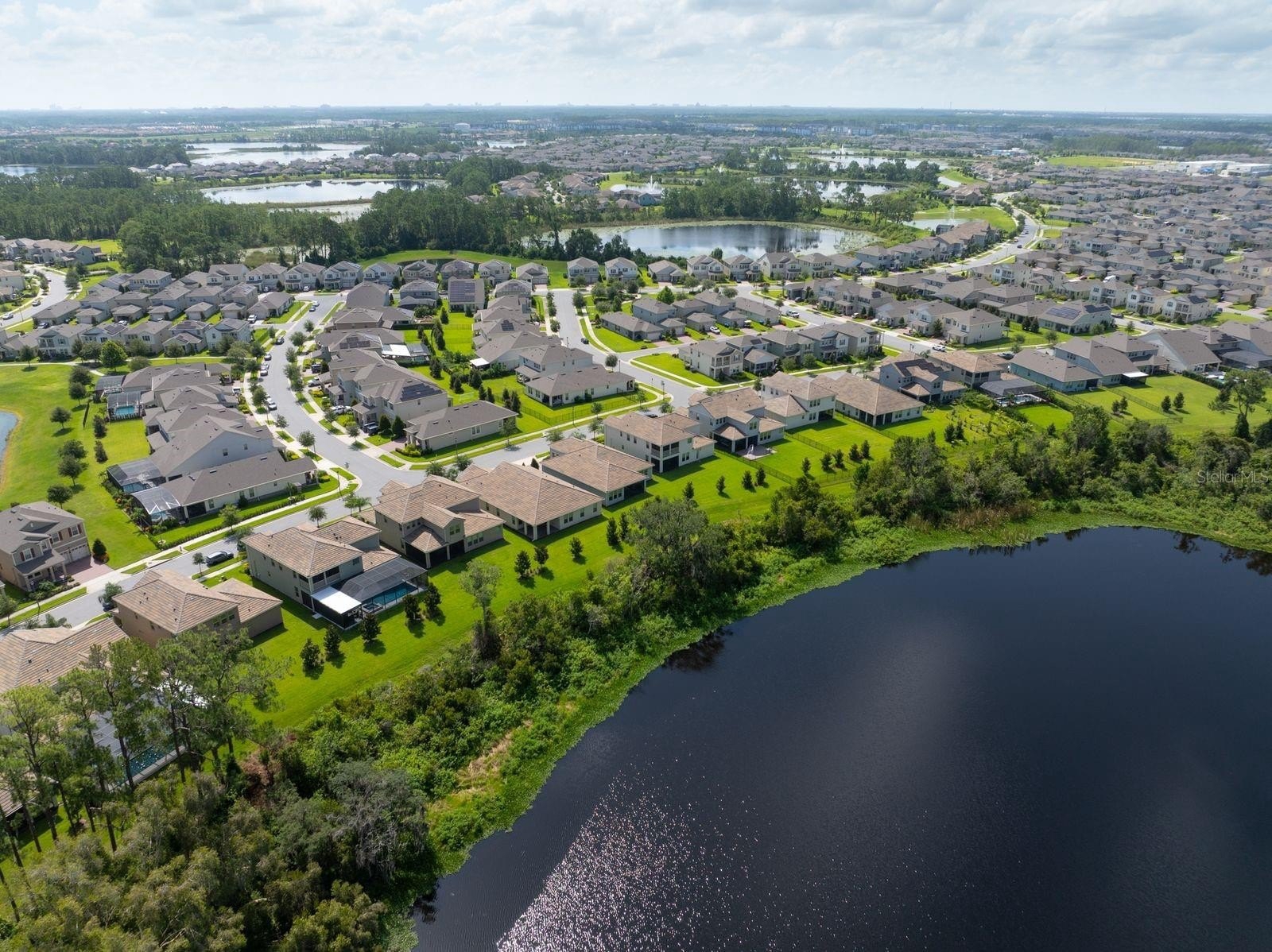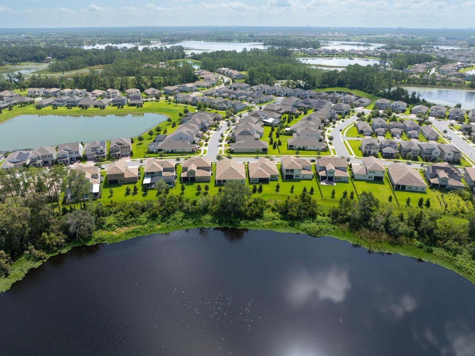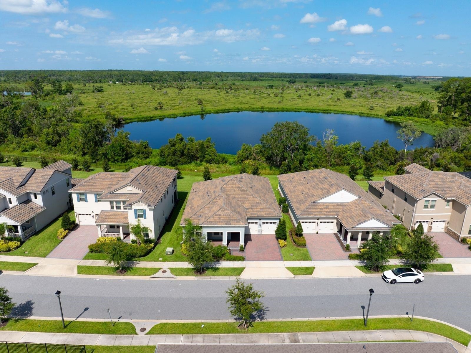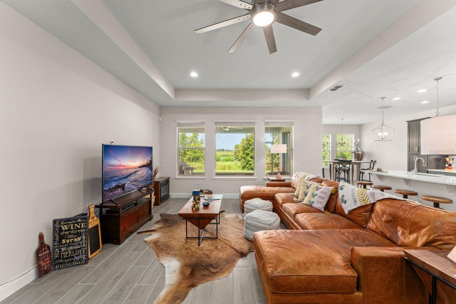 Welcome to your dream home! This beautifully decorated 3 Bedroom + Office, 2 1/2 Bath home where comfort meets style offers stunning lake views and a sleek tile roof. Upon entering you'll be greeted by architectural arches and a wide foyer entry. To your left, you will be greeted by architectural arches and a wide foyer entry. On your left you will find a Den/Study/Office with glass entry doors & the same upgraded porcelain tile wood plank floor that are seen throughout the living areas. Step inside to find an open floor plan filled with natural light with large windows showcasing the gorgeous lake, conservation and breathtaking sunsets views! Serve gourmet meals with flair and ease in the gourmet island kitchen featuring modern appliances, plenty of storage space and pendant lights. The owner's suite offers a tranquil retreat, complete with a spacious walk-in closet and an ensuite bath. Two additional bedrooms provide plenty of space for family/guests. Enjoy beautiful lake views from the spacious screened in lanai. The peaceful outdoor space is perfect for entertaining guests. The large 3 car tandem garage has a beautiful epoxy floor with plenty of storage space. this home is a must see for the discerning buyer! Conveniently located to all Winter Garden has to offer including shopping, dining, main roads and entertainment options.