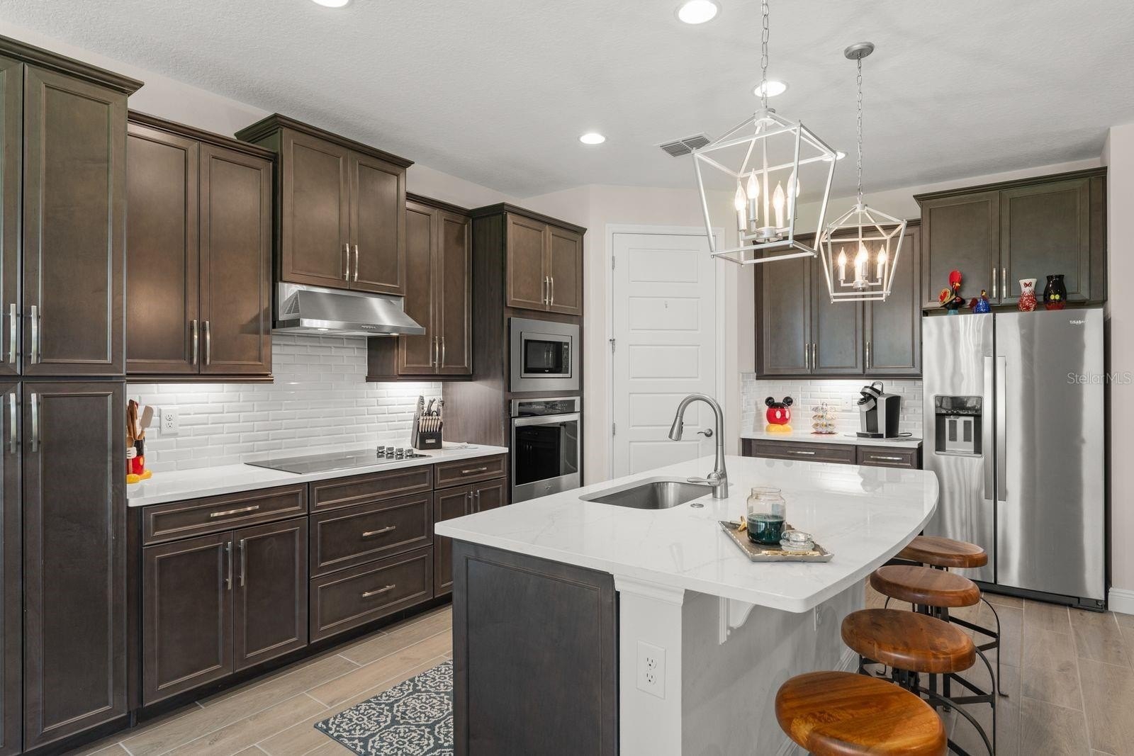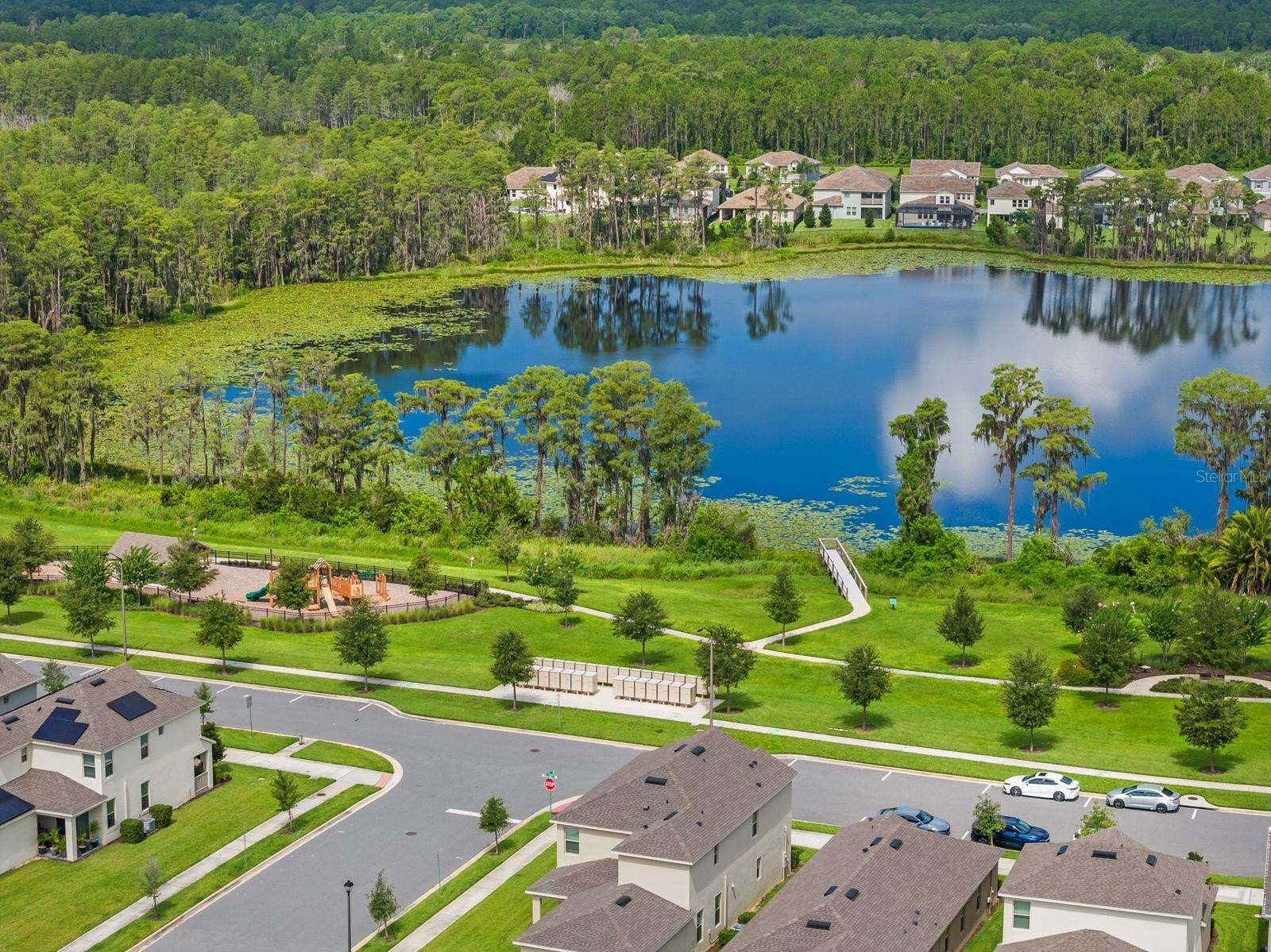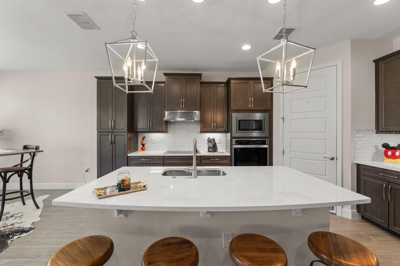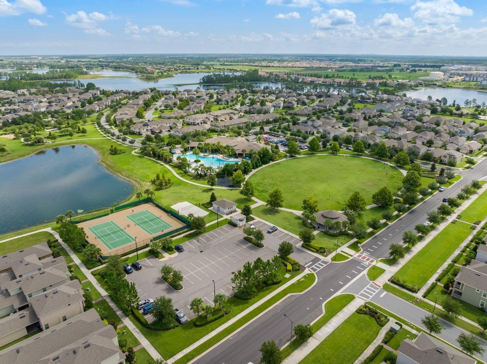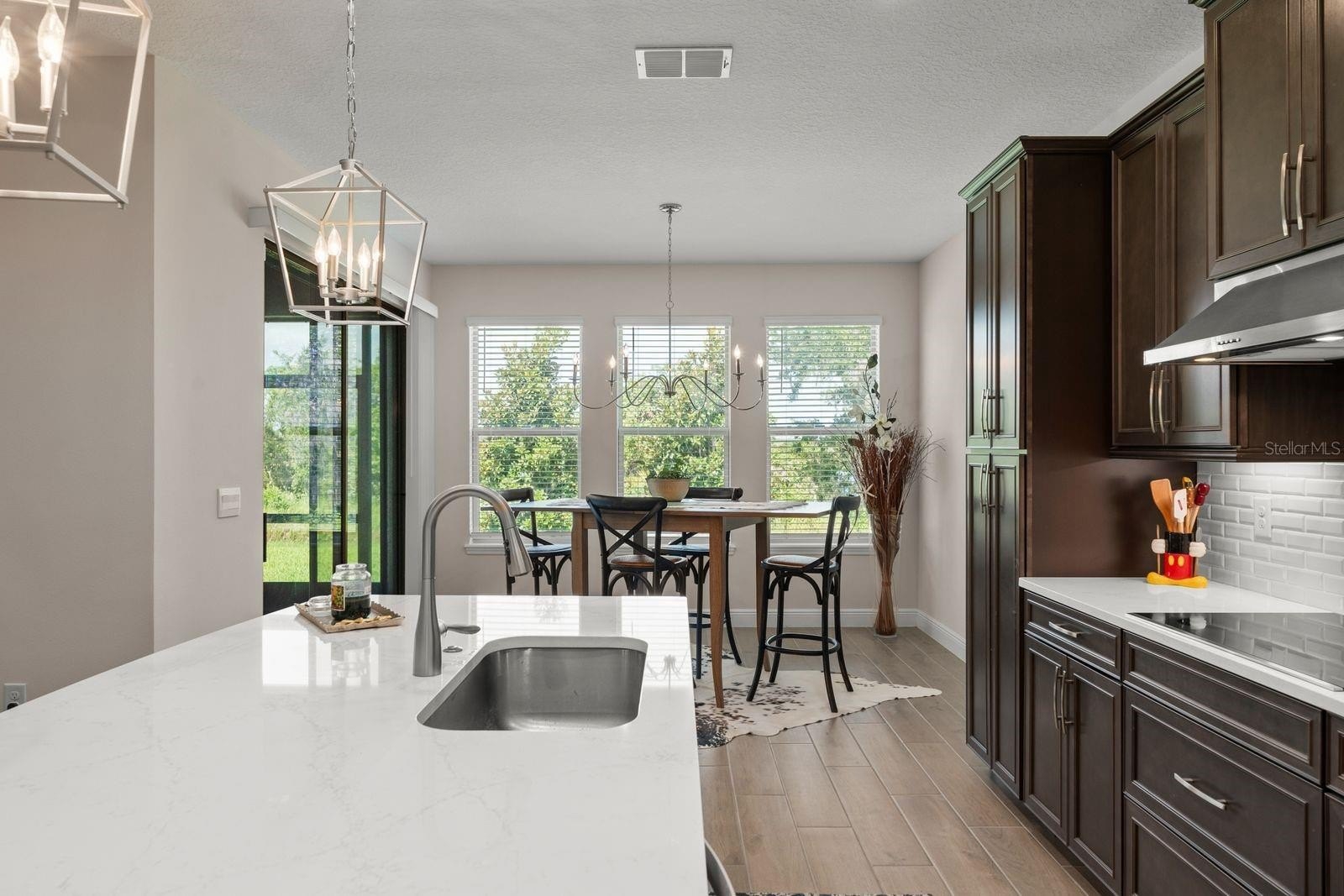 Welcome to your dream home! This beautifully decorated 3 Bedroom + Office, 2 1/2 Bath home where comfort meets style offers stunning lake views and a sleek tile roof. Upon entering you'll be greeted by architectural arches and a wide foyer entry. To your left, you will be greeted by architectural arches and a wide foyer entry. On your left you will find a Den/Study/Office with glass entry doors & the same upgraded porcelain tile wood plank floor that are seen throughout the living areas. Step inside to find an open floor plan filled with natural light with large windows showcasing the gorgeous lake, conservation and breathtaking sunsets views! Serve gourmet meals with flair and ease in the gourmet island kitchen featuring modern appliances, plenty of storage space and pendant lights. The owner's suite offers a tranquil retreat, complete with a spacious walk-in closet and an ensuite bath. Two additional bedrooms provide plenty of space for family/guests. Enjoy beautiful lake views from the spacious screened in lanai. The peaceful outdoor space is perfect for entertaining guests. The large 3 car tandem garage has a beautiful epoxy floor with plenty of storage space. this home is a must see for the discerning buyer! Conveniently located to all Winter Garden has to offer including shopping, dining, main roads and entertainment options.