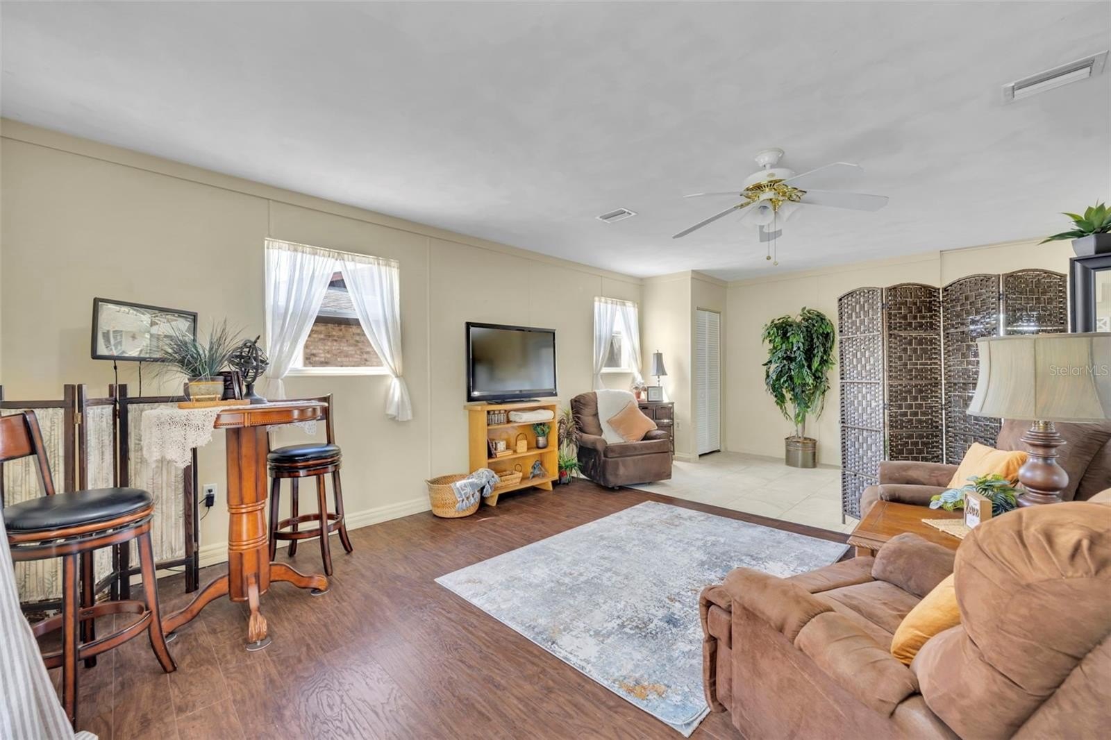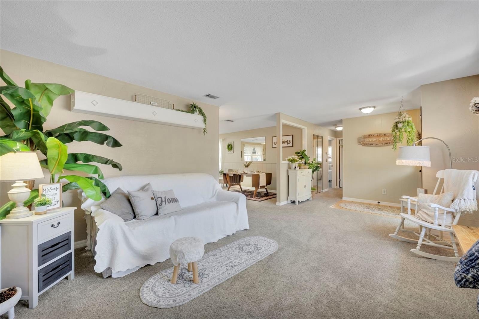 Possible GIGANTIC Primary Bedroom! So much space & opportunity in the Garage Conversion used currently as a Great Room. Curb Appeal adorn this 2208 TOTAL Sq Ft; 1714 Heated Sq Ft- BREATH OF FRESH AIR! DO NOT be FOOLED! This well-maintained, proudly owned by the same family since 1976 comes with PEACE OF MIND HOME WARRANTY! Through the door awaits this hand-crafted home updated with care, quality, all while holding its classic charm. Adding to the curb appeal is the Picturesque Bay Window with a peaceful view of the flower gardens. 15.4 x 12.10 Living Room has stylish new carpeting & versatile flooring throughout the home, neutral palette, & thoughtful design creating a serene ambiance. Heart Of The Home REMODELED GOURMET KITCHEN features upgraded solid wood cabinetry, complete suite of Stainless Steel Appliances with NEW stove, NEW dishwasher & 6 month NEW microwave, Granite countertops, & Stone Backsplash. Charming kitchen has cabinetry galore with its additional generously sized pantry. Open to dinette serves to delight in visiting while cooking, or accommodating gatherings in the 19.7 x 9.10 light & airy dining room; abundant daylight beaming in through the sliding glass doors & large windows. TWO SETS of sliding glass doors! Off dinette leads to the carpeted elongated Lanai; outside is your private oasis & feeling the relaxation suggests you sit back, grab a glass of wine and relax. The 2nd set of sliding doors lead to the 21.2 x 15 patio with plenty of seating & quiet for morning to read, relax & enjoy a cup of tea.This ample 15 x 10 Primary Bedroom will fit a queen bed nicely or even a king. The timeless chic in the en suite bathroom with fully tiled ceramic shower & tub, sizeable vanity are delightful. Cozy Bedroom 2; 11.6 x 9.8 also with a queen bed & closet. Nostalgic charm bathroom in a sweet sage green with fully tiled walk in shower. Sage Green is one of the 2026 BATHROOM TOP colors of the YEAR! Entertaining, hosting, & gathering is MADE for this spectacular property w/multiple gathering places! THIS 19.5 x 13.8 GRAND GREAT ROOM has SO MANY possibilities! COULD IT BE? College Kid Condo, MIL Suite, Office, Nursery, Family Recreation! Private entrance, laminate flooring and VOLUMINOUS SLIDING GLASS DOORS with exceptional light funneling in, a retractable awning & spacious area for whatever you choose! One of the home’s standouts features is that it’s open & airy perfection indoors & outdoors for hosting, entertaining, holidays, enjoying quiet moments, or soaking in views of nature and relaxation. MASSIVE backyard, containing plenty of space for guests, entertaining, parties, BBQ's and so much more for your leisurely enjoyment. POOL? There is PLENTY of space! SHED on concrete slab STRUDY for storage. A summary of the numerous upgrades include: NEW CARPET 2025, 2017-Roof (4-Point peace-of-mind!), 2017-HVAC, 2017-HWH, 2021-Drainfield