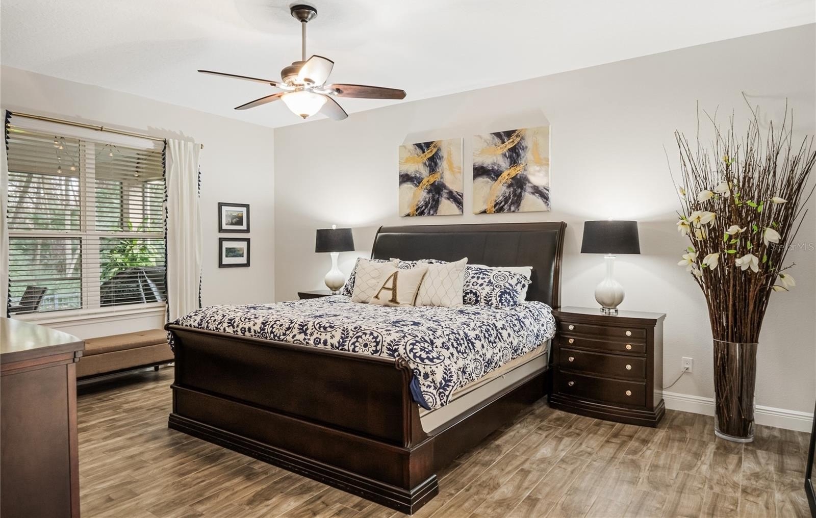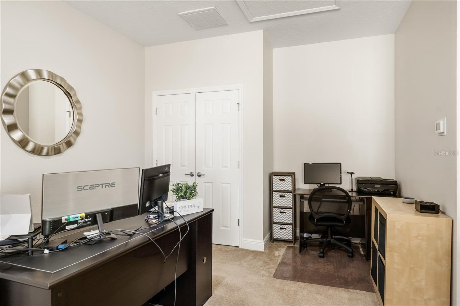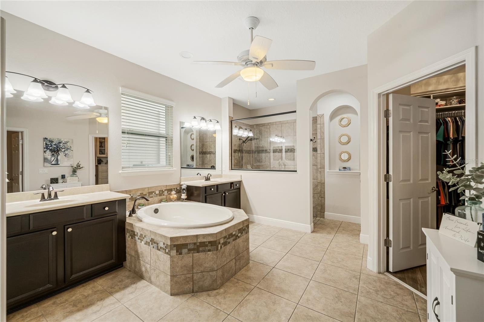 Interior finishes combine durability and style. The primary suite features wood look tile flooring and custom luxury closet built ins. Bedrooms two and three also include custom closet systems, and luxury plank vinyl flooring is installed in three guest bedrooms and the office. Ceiling fans are located in all bedrooms. The home is prewired for surround sound in the family room, bonus room, and rear patio, with speakers already installed in the family room.