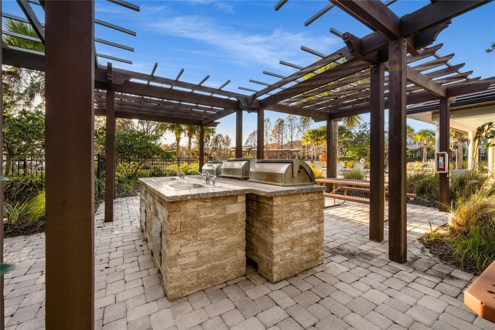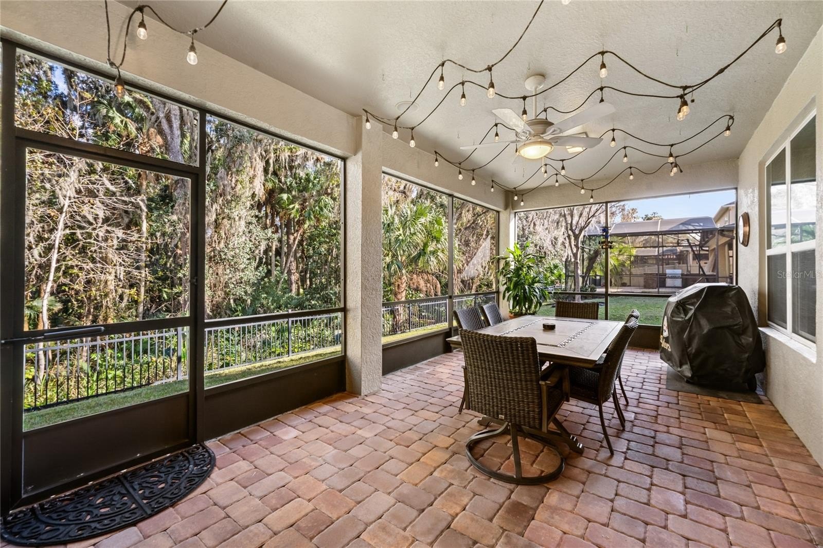 Additional exterior features include a paver driveway and screened patio, gutters, double pane tinted windows, security system, termite bond, and in wall pest control system.