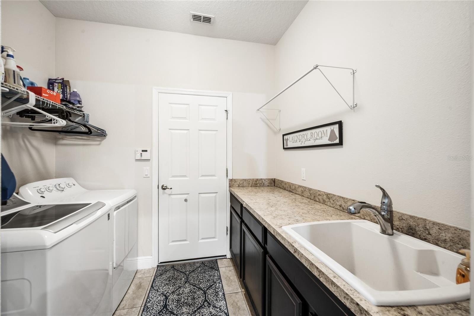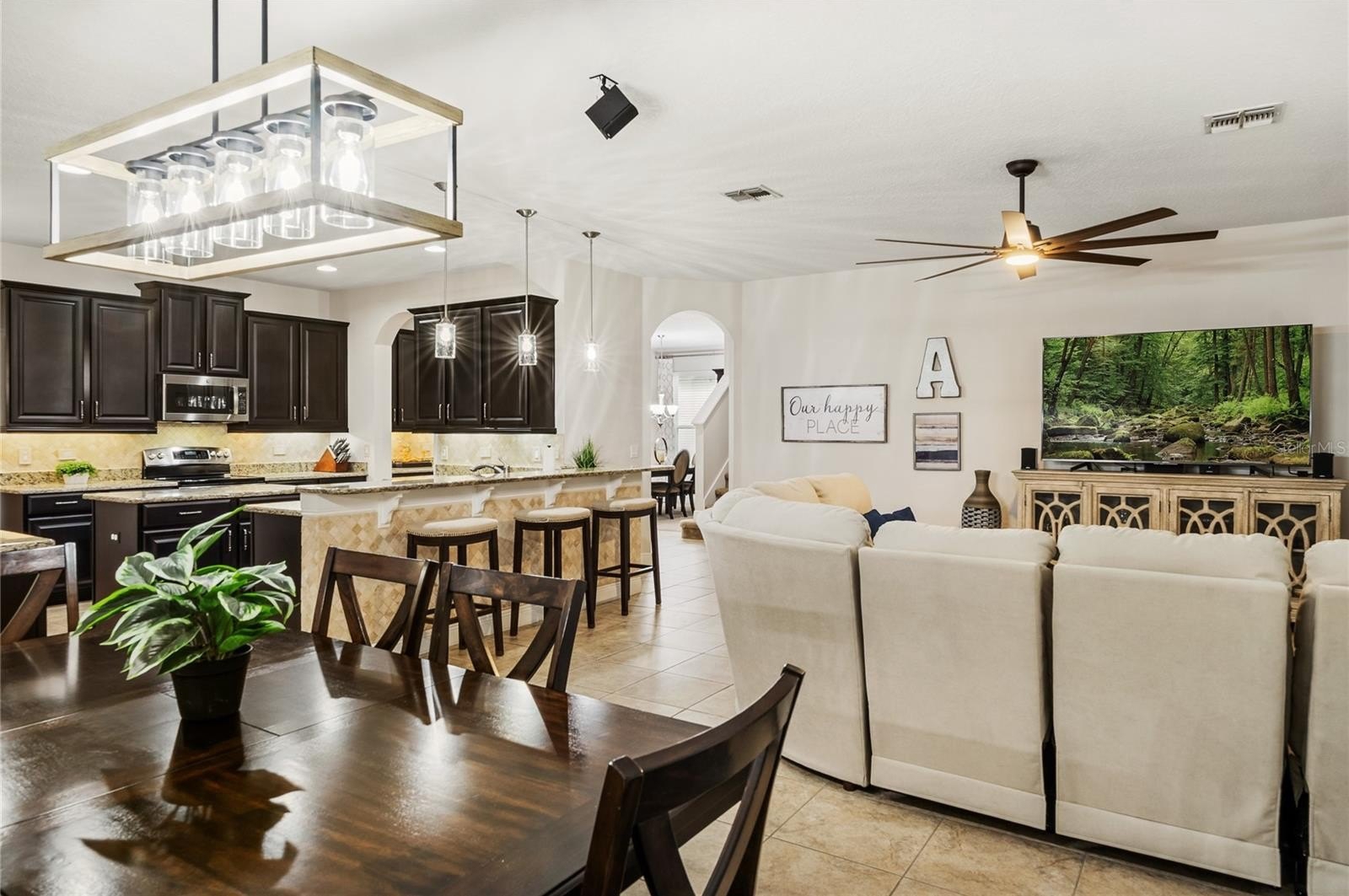 The open island kitchen serves as the heart of the home and flows seamlessly into the main living area. Features include 42" espresso cabinetry, granite countertops, stainless steel appliances including refrigerator, microwave, dishwasher, and range, under cabinet lighting, a walk in pantry, and a butler pantry with additional storage. The layout supports both everyday living and effortless entertaining. The laundry room includes a utility sink, convenient drop zone, and washer and dryer.