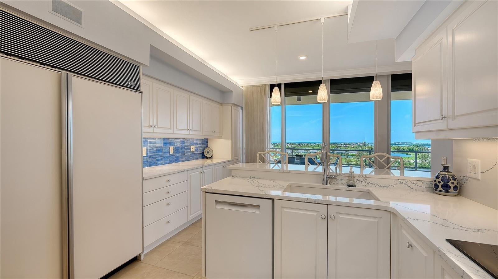 The kitchen has been refreshed in 2025 with new countertops, backsplash, sink, faucet, and disposal, complementing solid wood cabinetry, quartz surfaces, and a breakfast bar that connects seamlessly to the surrounding living spaces. This central hub is designed for both functionality and gathering, with clear sightlines to the terraces and beyond.