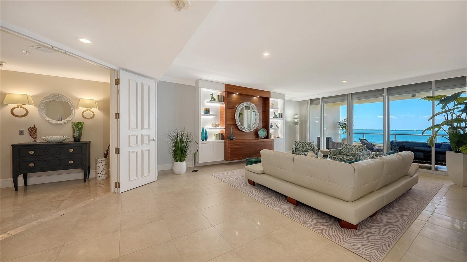 The open floor plan has been thoughtfully reimagined to enhance everyday living and entertaining. The current configuration features a spacious great room, a casual family room in place of the traditional dining area, and a dining room reallocated to the den/third bedroom—offering versatility that can easily be adapted to suit a buyer’s preferred layout. Walls of glass sliders frame expansive water, city, and golf course views while filling the interior with natural light.