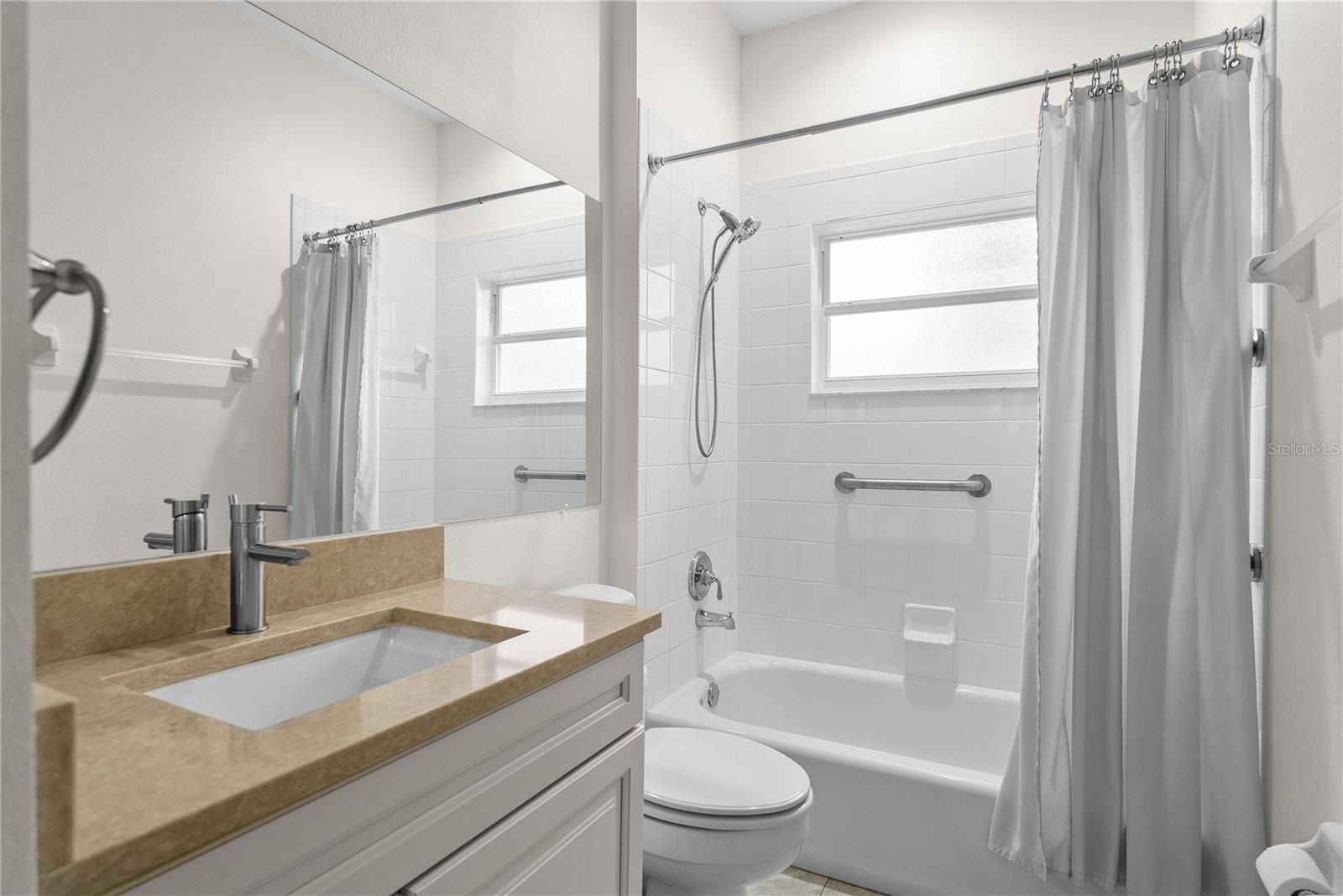 The guest bathroom has also been updated with a new vanity, comfort-height toilet, and an additional light fixture above the tub.