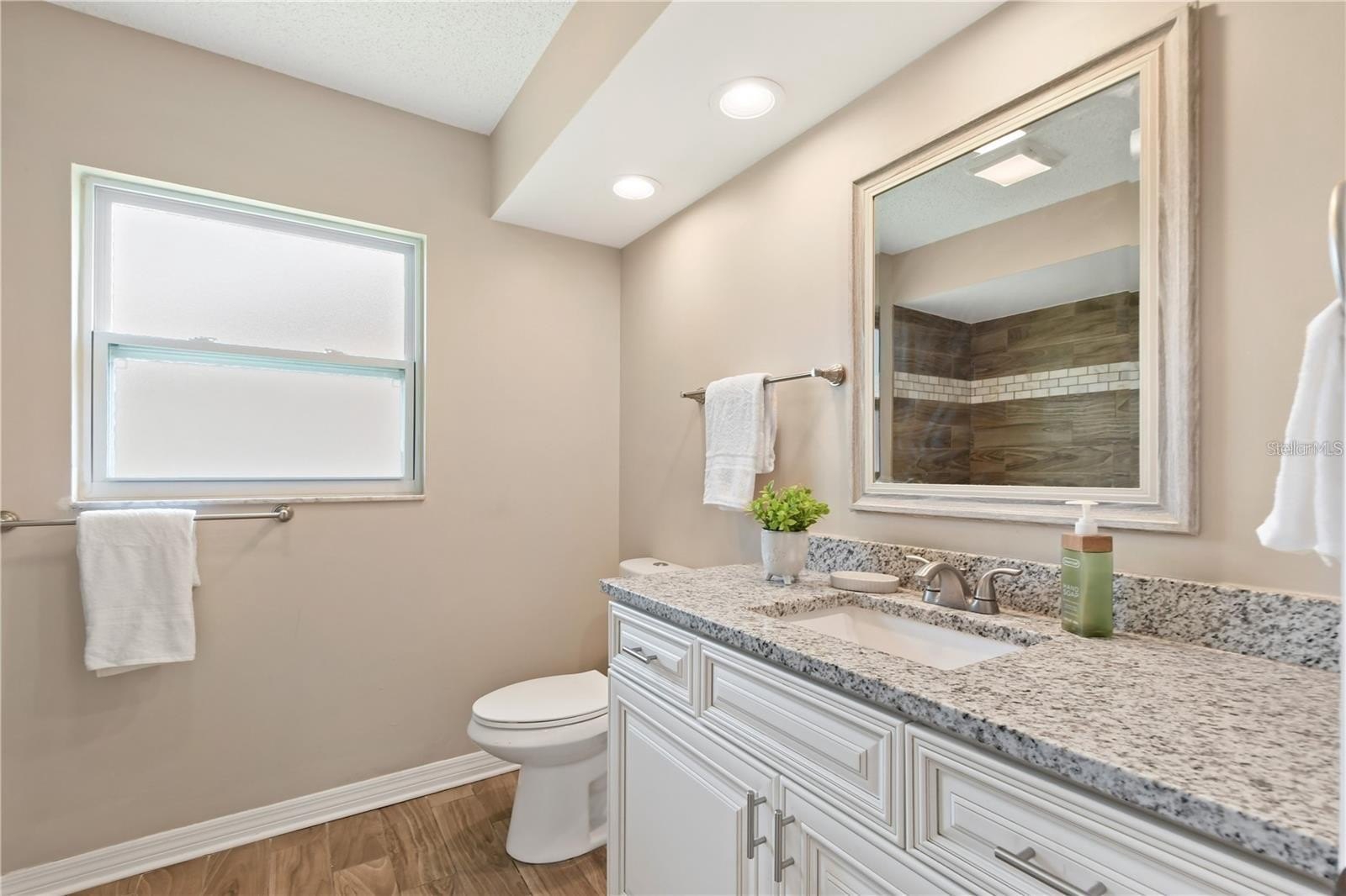 Inside, you’ll find two spacious living areas filled with natural light. The remodeled kitchen features granite countertops, stainless steel appliances, and picturesque golf course views. A wood-burning fireplace adds warmth and character to the living space.