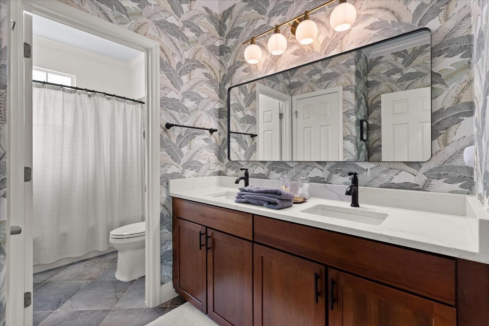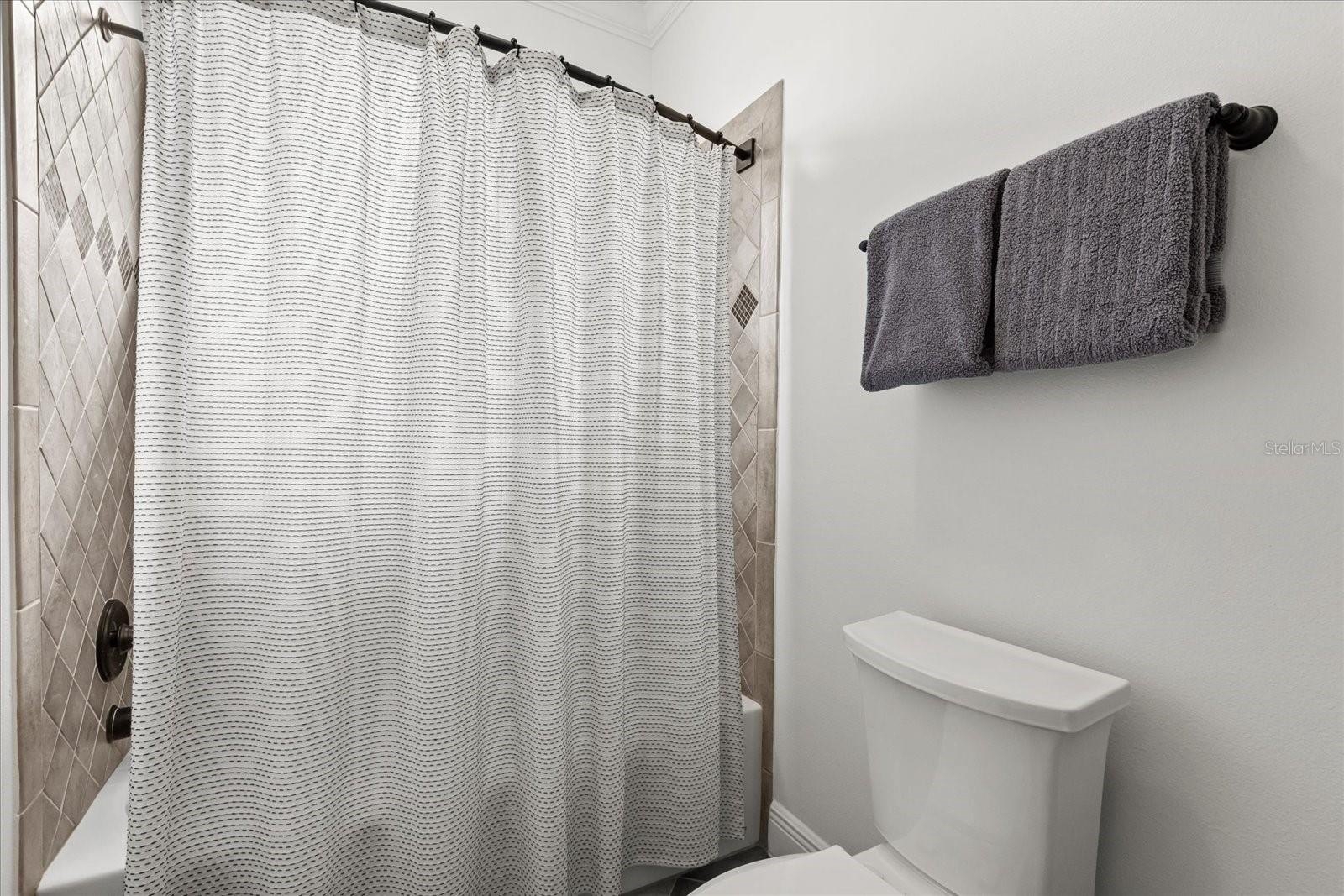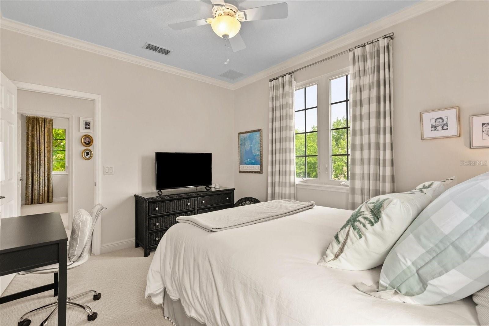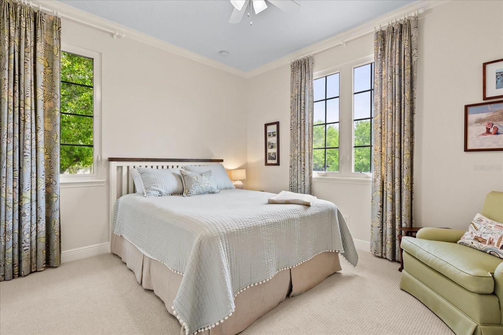 The private first floor primary features high tray ceiling, crown molding, and a spa-like bath with updated quartz countertops and a pebble stone shower floor. On the second floor two additional bedrooms and upgraded full bath offer flexibility, including potential for en-suite configurations, along with a charming window seat/reading nook. Carpets are premium Karastan.