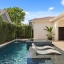 The home was strategically repositioned on a larger corner lot to create approximately 1,000 square feet of alfresco dining space, seamlessly connecting indoor and outdoor living. The backyard is an entertainer’s dream, highlighted by a saltwater pool and swim spa (2020), with water features and Badu jets for exercise resistance swimming. All outdoor areas feature travertine surround and mature landscaping including a privacy hedge, hibiscus, confederate jasmine, raised flower and herb beds and fruit trees. A leveled backyard was intentionally designed with a drainage system running beneath the travertine pavers to the street.