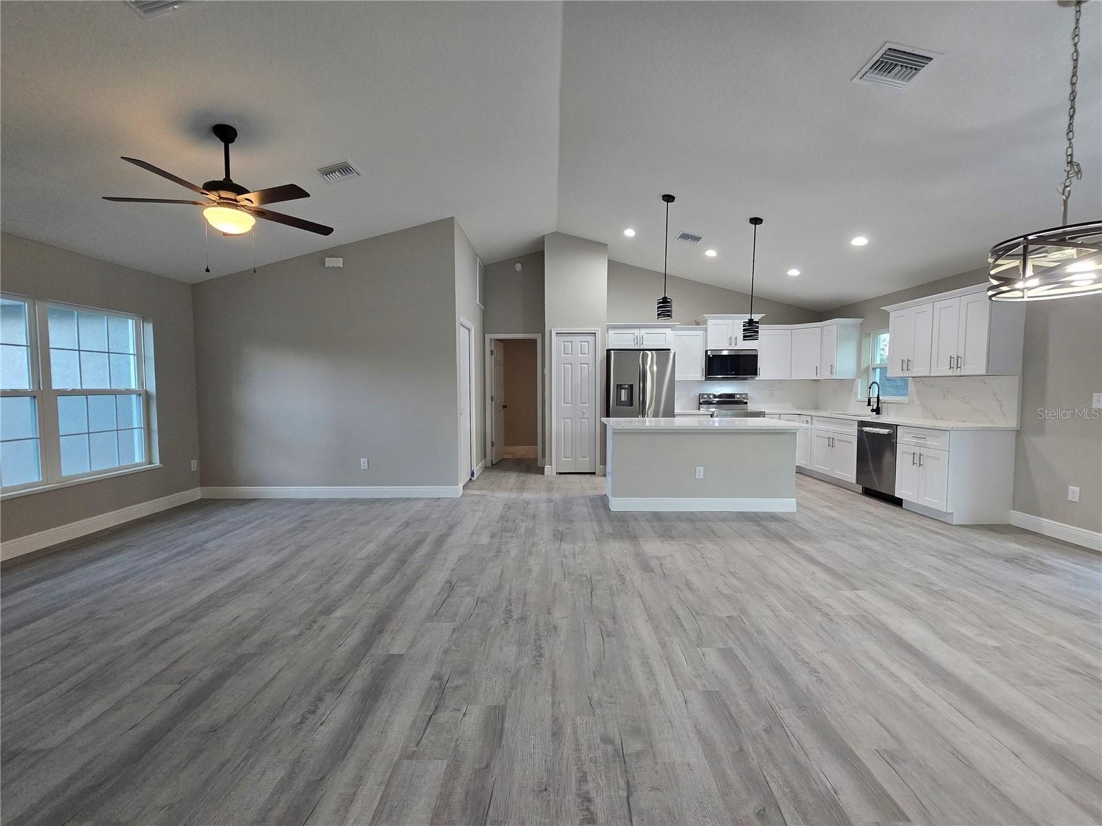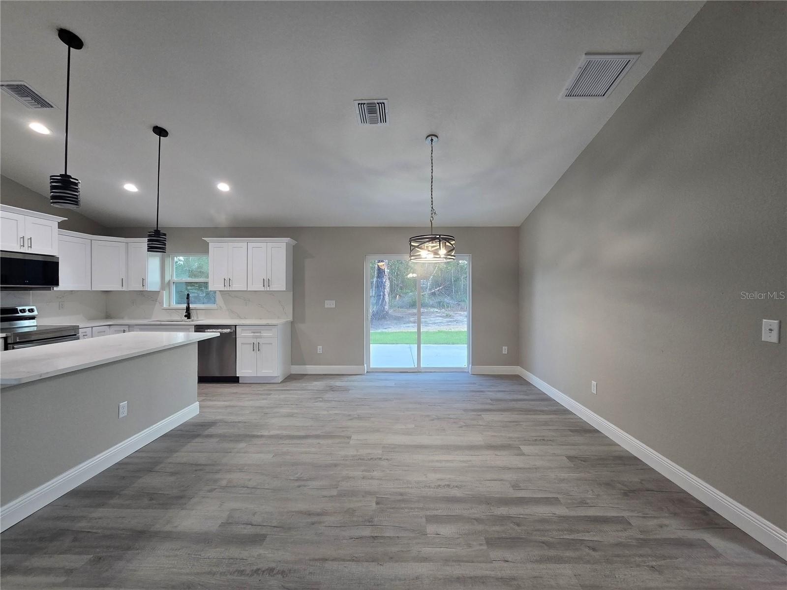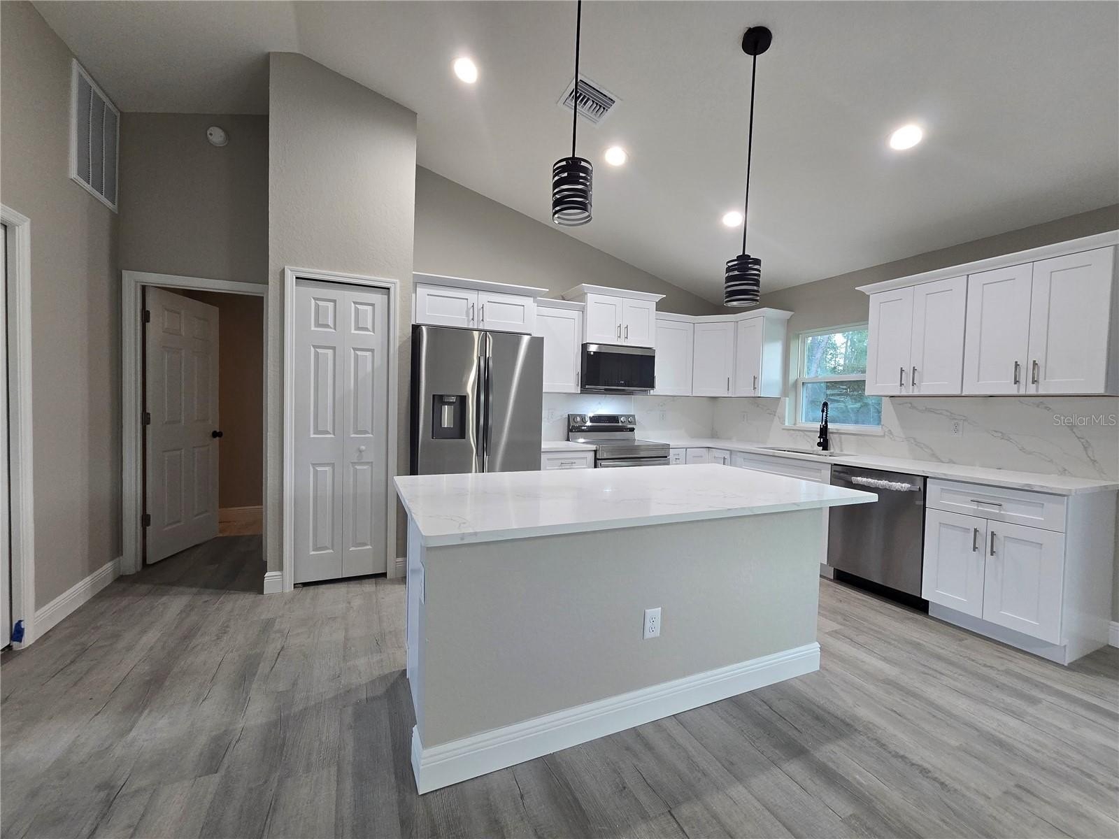 Come see this wonderfully styled, 3 bedroom, 2 bath, 2 car garage on a OVERSIZED .25 AC CORNER LOT in the very popular Silver Springs Shores area. This home features a split plan, high ceilings & QUARTZ STONE counters in the KITCHEN, BATHROOMS & WINDOW LEDGES! When you step in side, you will notice the open design with tall ceilings and a split floor plan. The primary bedroom features an oversized closet & en suite bathroom with A FULLY TILED, EZ ENTRY SHOWER & linen closet. The kitchen, has whisper quiet drawers & UPGRADED cabinets with stylish knobs. Gorgeous sink with a beautiful open view. DELUXE SMART APPLIANCE PACKAGE INCLUDES Stainless steel Fridge, Dishwasher, Stove & Microwave comes with the home. A beautifully patterned Quartz counter island comes with room for chairs. Nearby, you have access to the laundry room & garage via a handy pocket door. Across the house, the secondary rooms share the bathroom and will have good space for a full size bedroom set, office, or a game room. The choices are endless! Ample closet space has been supplied as well for all of their storage needs. The .25 acre CORNER LOT gives you plenty of room for all of your toys! NOT IN AN HOA so you are free to build a fence, add a pool, do what you want, how you want! On a well and septic system so NO UTILITY BILLS is also a great plus! If you install back up power in preparation for any possible outage, you will still have use of water and sewer as long as you have electric! Close enough to give you access to Belleview, Summerfield, The Villages, The Interstate and beyond. Less than 10 min to Wal-Mart, Publix, Aldi & Save a Lot, The post office, 3 auto parts stores & car washes as well as many food & medical offices nearby for ease. A short drive in either direction will lead to Ocala's downtown square or to our famous Lake Weir, where you can boat, kayak, jet ski, or enjoy a meal on the lake over looking the sunset. First Time Homebuyer & Veteran friendly! Almost completed, you can be in QUICKLY!