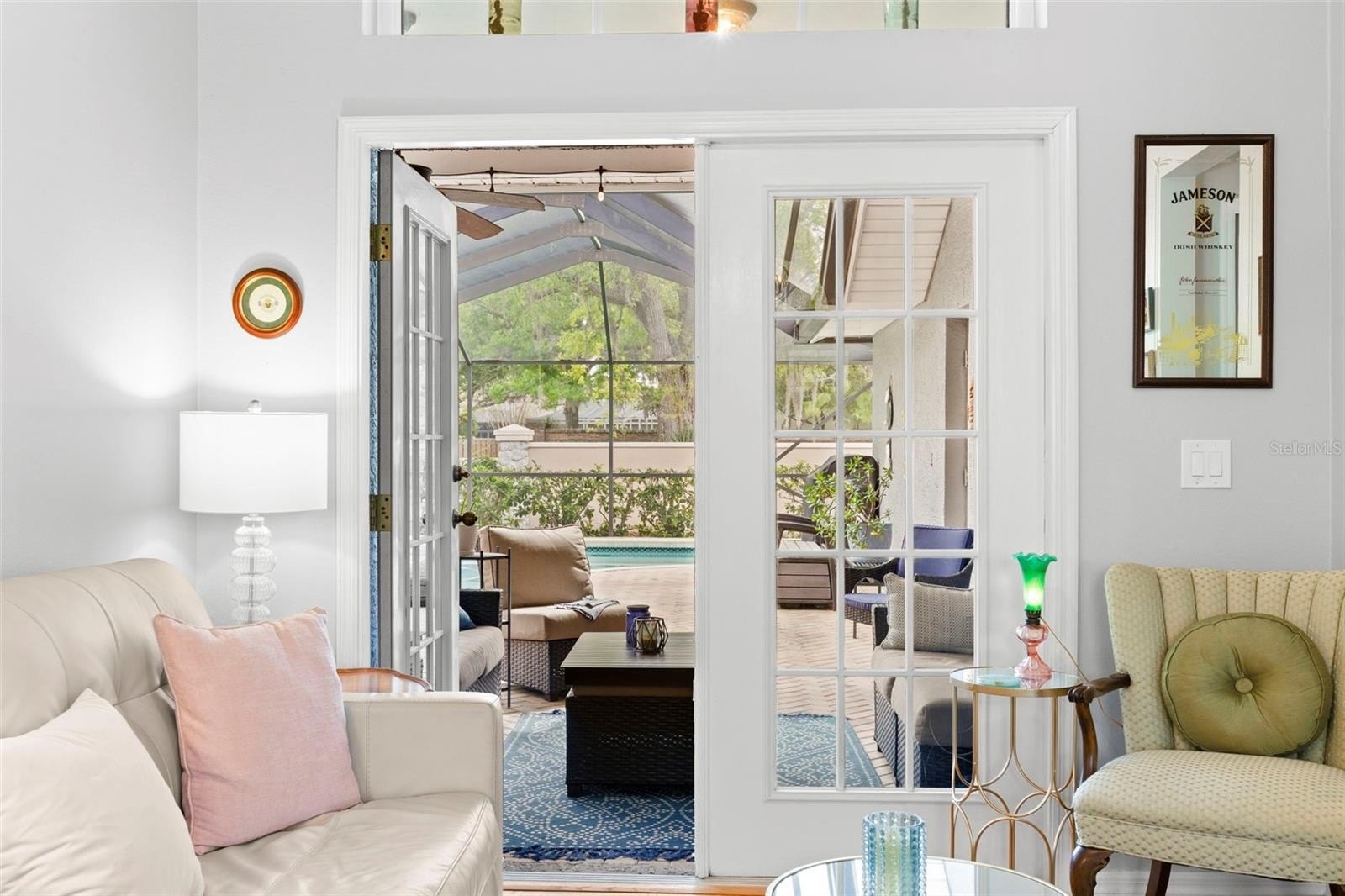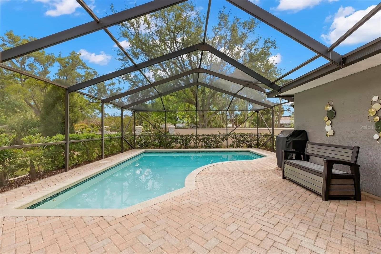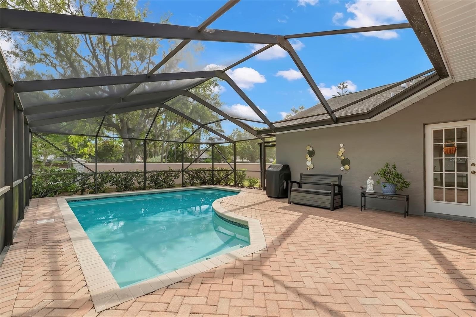 Welcome to an exceptional opportunity in the highly desirable Stonebriar enclave of East Lake Woodlands—where timeless design meets effortless Florida living. This impeccably maintained four-bedroom, two-bath pool home showcases true pride of ownership and offers a seamless blend of comfort, functionality, and style. From the moment you arrive, the home’s pristine condition and inviting curb appeal set the tone. Step through the front door and be immediately captivated by a stunning sightline that draws your eye through the living space to the screened lanai and sparkling pool beyond—an ideal introduction to the indoor-outdoor lifestyle that defines this residence. To the right, the formal dining room offers generous proportions, perfect for hosting gatherings both intimate and grand. Straight ahead, the formal living room provides direct access to the lanai, creating a fluid transition for entertaining and allowing you to fully embrace Florida’s beautiful weather year-round. Privately positioned to the left of the entry, the primary suite is a serene retreat featuring its own access to the lanai. The en suite bath is thoughtfully appointed with a deep soaking tub, step-in shower, and a spacious walk-in closet—delivering both comfort and convenience. At the heart of the home, the updated kitchen is a standout, boasting white shaker cabinetry, stone countertops, and an elegant tile backsplash. A breakfast bar and optional nook space add flexibility, while the open layout flows effortlessly into the family room, complete with a cozy wood-burning fireplace—perfect for relaxed evenings at home. The split-bedroom floor plan enhances privacy, with three additional generously sized bedrooms located toward the rear of the home, each offering ample closet space. The secondary bath features a tub/shower combination and provides direct access to the laundry room and lanai, functioning perfectly as a pool bath. Step outside to your private oasis—an expansive screened lanai featuring a solar heated saltwater pool, ideal for year-round enjoyment. The covered area offers the perfect setting for outdoor dining and lounging, and select patio furnishings are available for purchase, making this space move-in ready for immediate enjoyment. A spacious backyard completes the outdoor experience. With its thoughtful layout, stylish updates, and inviting indoor-outdoor flow, this home is truly ready for its next chapter. Don’t miss the opportunity to experience everything this exceptional property has to offer—schedule your private showing today.