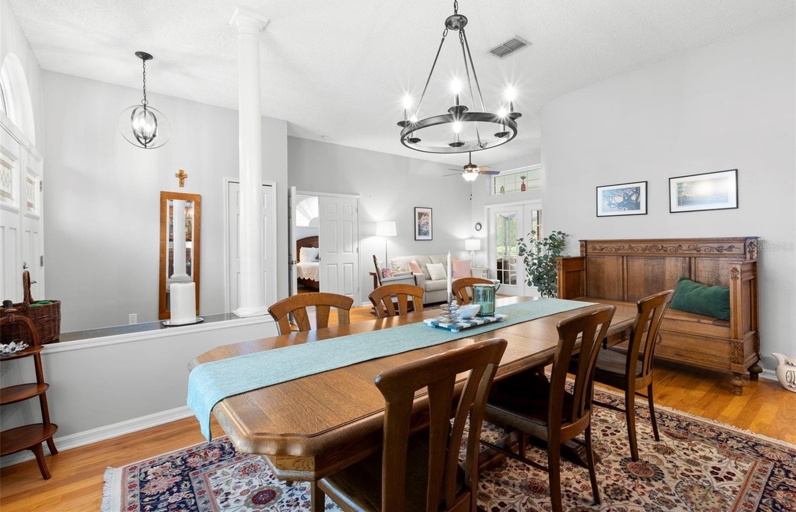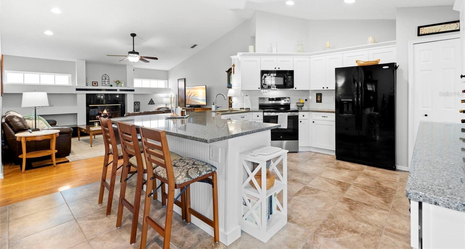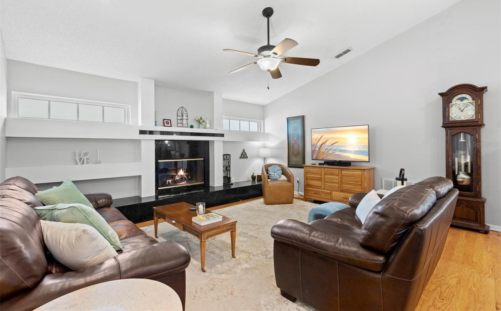 Welcome to an exceptional opportunity in the highly desirable Stonebriar enclave of East Lake Woodlands—where timeless design meets effortless Florida living. This impeccably maintained four-bedroom, two-bath pool home showcases true pride of ownership and offers a seamless blend of comfort, functionality, and style. From the moment you arrive, the home’s pristine condition and inviting curb appeal set the tone. Step through the front door and be immediately captivated by a stunning sightline that draws your eye through the living space to the screened lanai and sparkling pool beyond—an ideal introduction to the indoor-outdoor lifestyle that defines this residence. To the right, the formal dining room offers generous proportions, perfect for hosting gatherings both intimate and grand. Straight ahead, the formal living room provides direct access to the lanai, creating a fluid transition for entertaining and allowing you to fully embrace Florida’s beautiful weather year-round. Privately positioned to the left of the entry, the primary suite is a serene retreat featuring its own access to the lanai. The en suite bath is thoughtfully appointed with a deep soaking tub, step-in shower, and a spacious walk-in closet—delivering both comfort and convenience. At the heart of the home, the updated kitchen is a standout, boasting white shaker cabinetry, stone countertops, and an elegant tile backsplash. A breakfast bar and optional nook space add flexibility, while the open layout flows effortlessly into the family room, complete with a cozy wood-burning fireplace—perfect for relaxed evenings at home. The split-bedroom floor plan enhances privacy, with three additional generously sized bedrooms located toward the rear of the home, each offering ample closet space. The secondary bath features a tub/shower combination and provides direct access to the laundry room and lanai, functioning perfectly as a pool bath. Step outside to your private oasis—an expansive screened lanai featuring a solar heated saltwater pool, ideal for year-round enjoyment. The covered area offers the perfect setting for outdoor dining and lounging, and select patio furnishings are available for purchase, making this space move-in ready for immediate enjoyment. A spacious backyard completes the outdoor experience. With its thoughtful layout, stylish updates, and inviting indoor-outdoor flow, this home is truly ready for its next chapter. Don’t miss the opportunity to experience everything this exceptional property has to offer—schedule your private showing today.