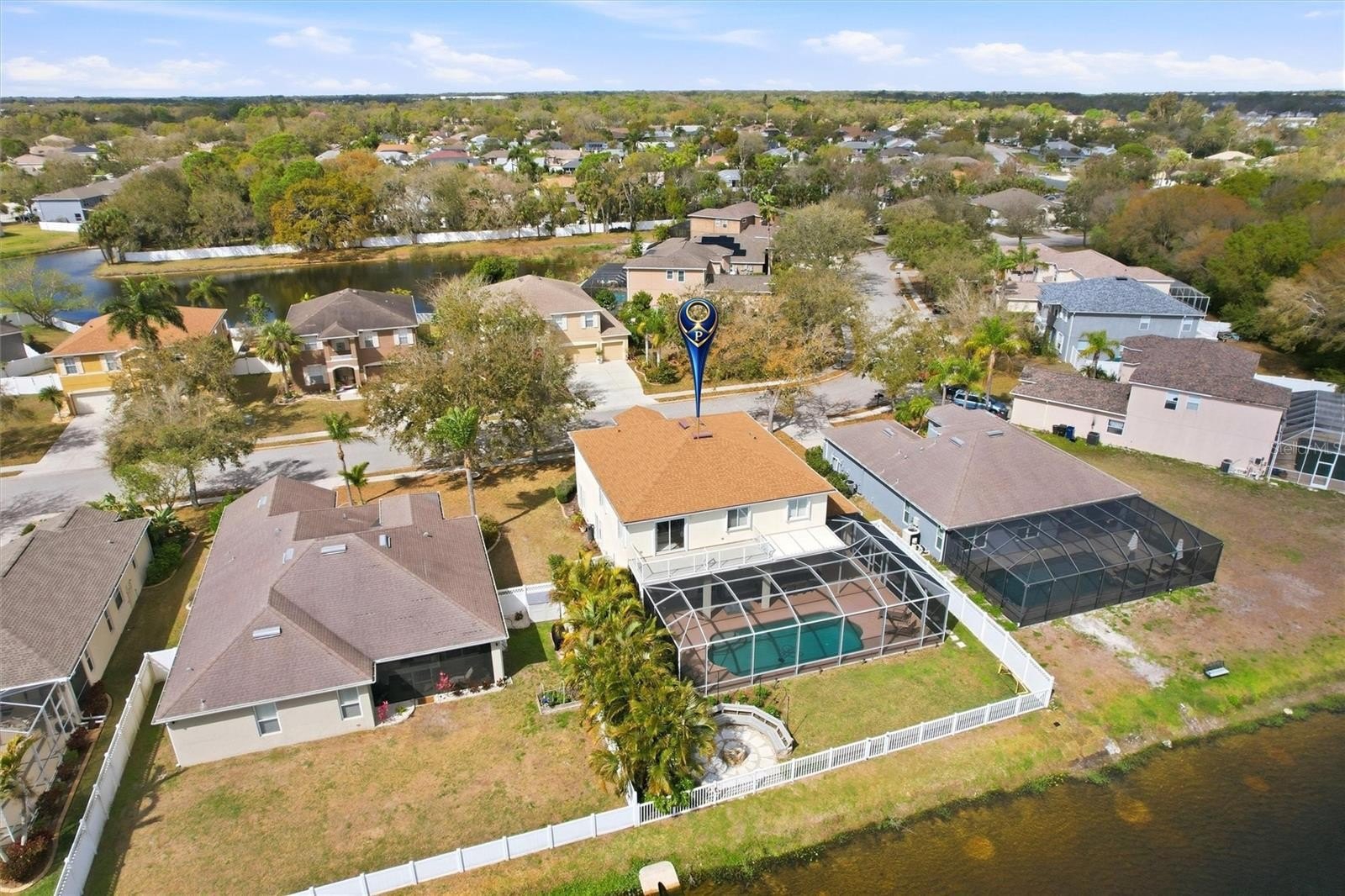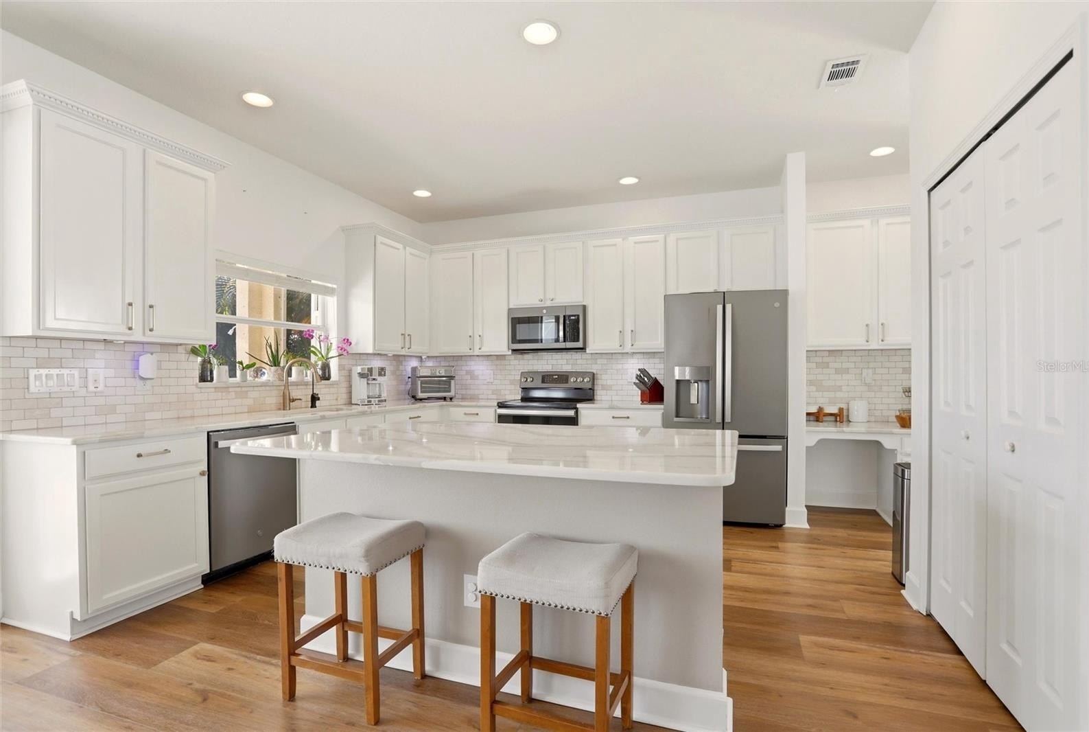 This stunning two story home has been beautifully renovated and maintained from top to bottom with a new roof (2021), hurricane shutters (2025), one new AC unit (2022), new pool cage with roof addition (2023), saltwater pool conversion (2021), custom built cabinetry in living room, dining room and upstairs loft (2022), custom built closets in every bedroom (2021), water conditioner throughout house and reverse osmosis filter in kitchen (2025), quartz kitchen countertops with new appliances (2021) new washer and dryer (2025) and vinyl flooring (2020).