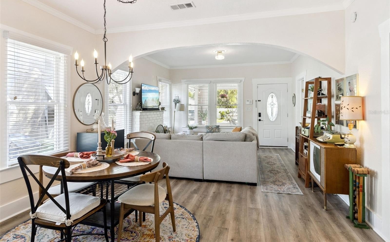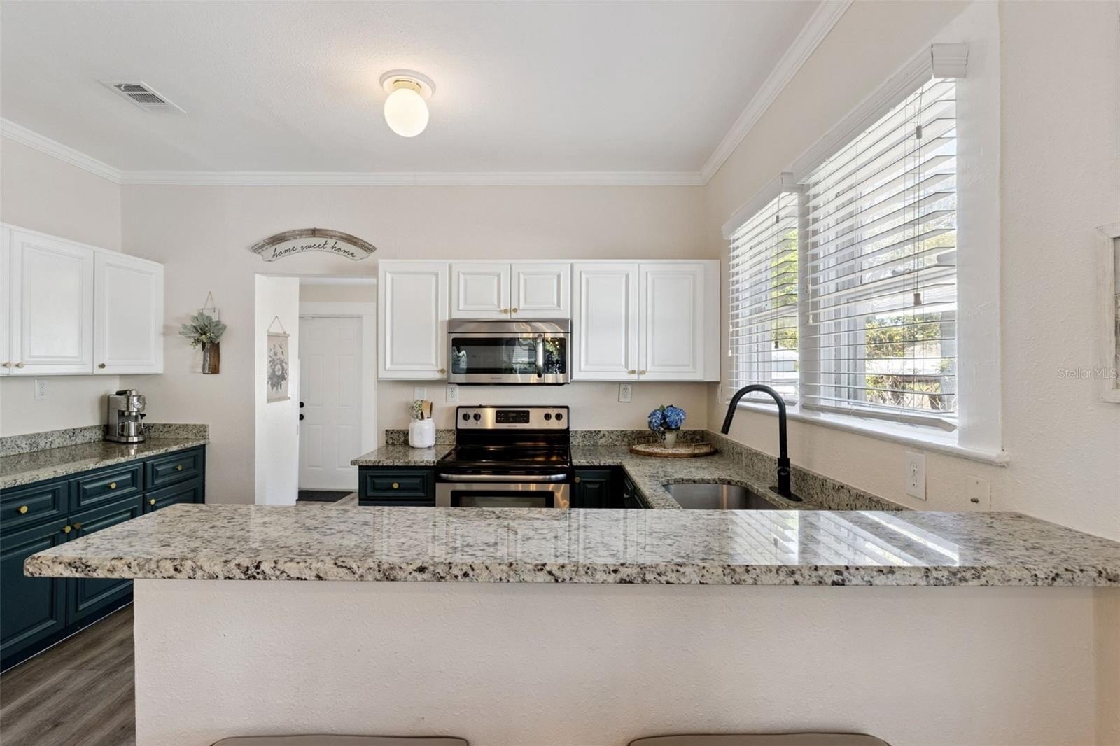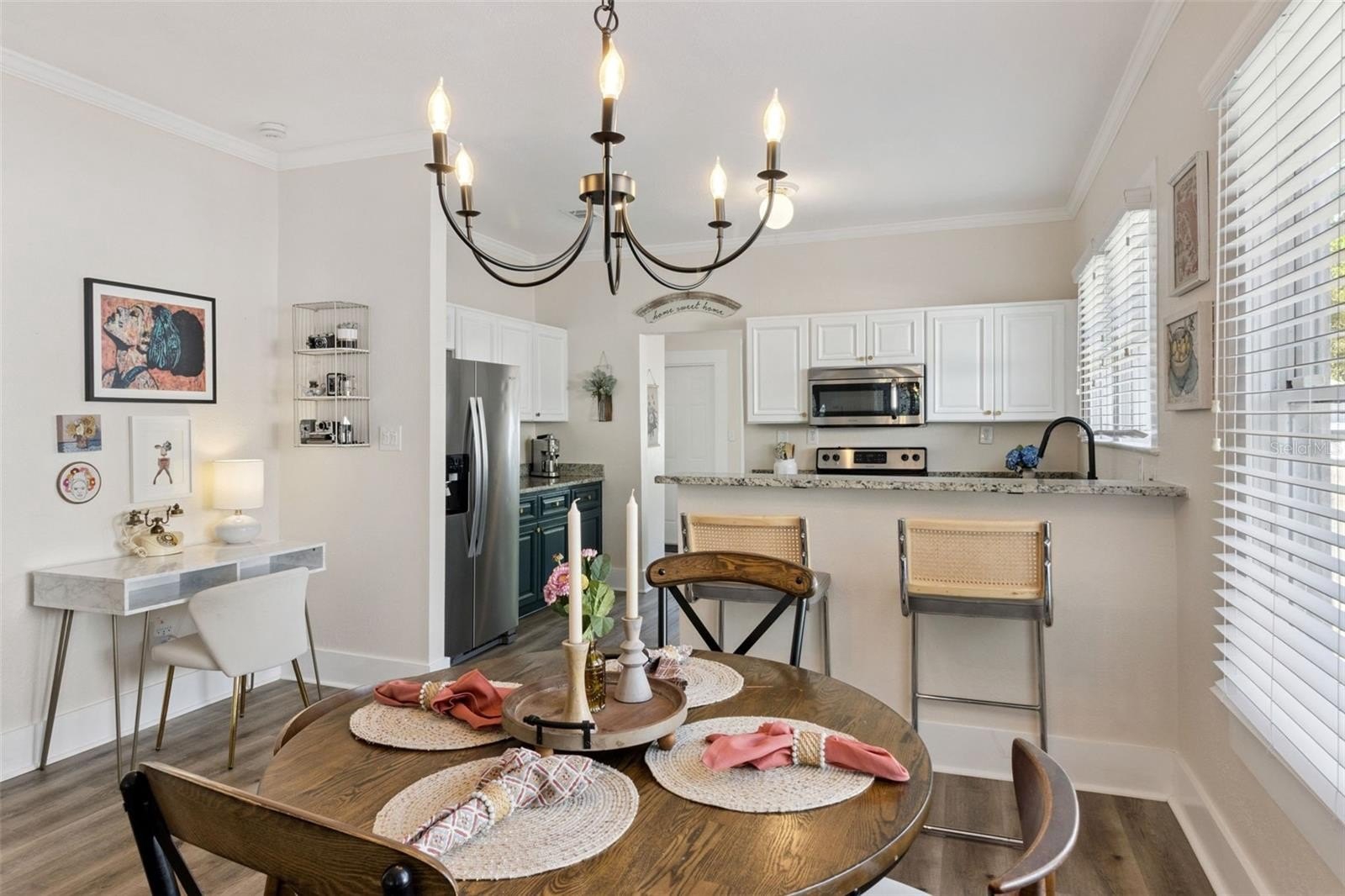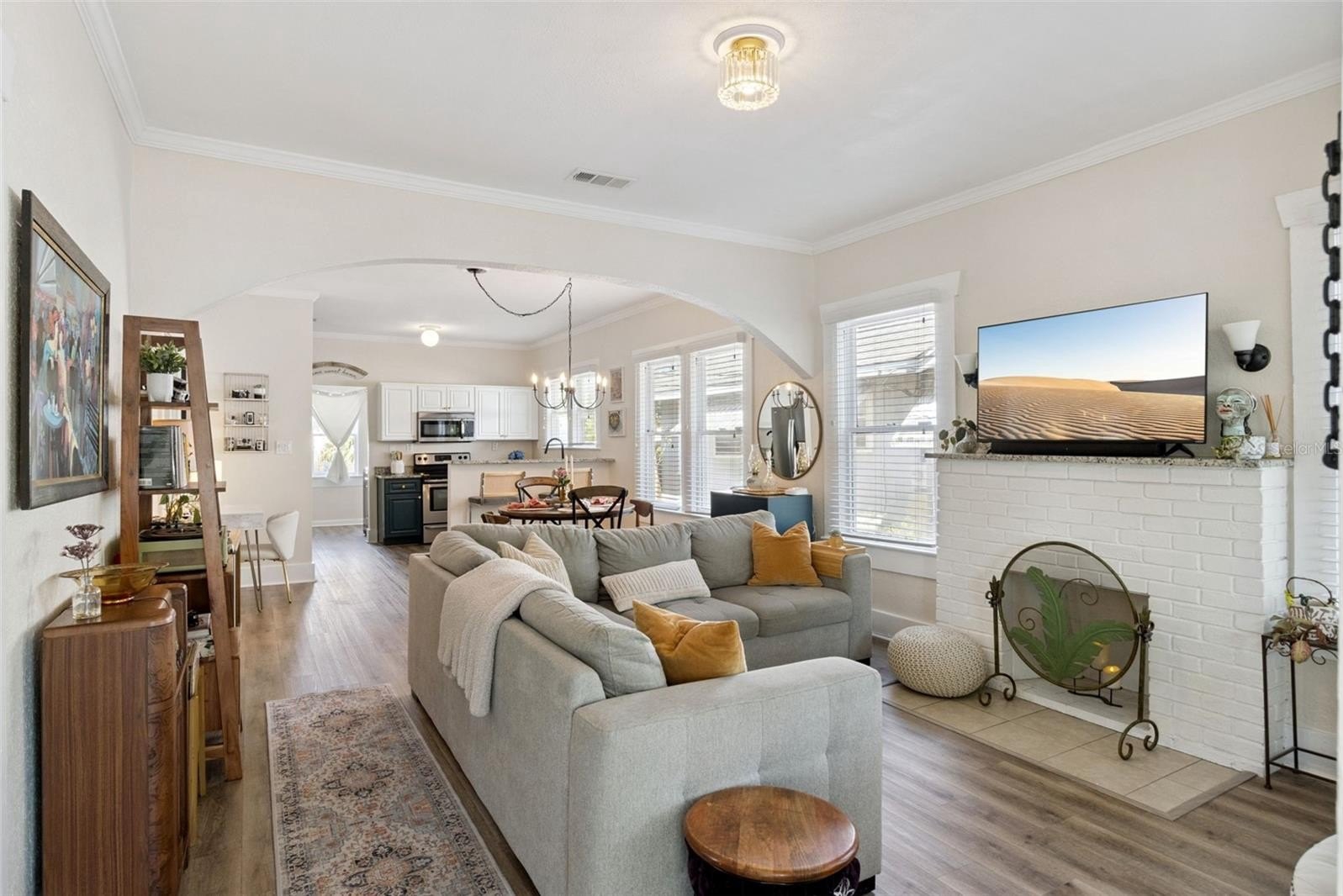 The covered front porch opens to a bright living room with a fireplace, high ceilings and crown molding. The open layout connects the living room to the kitchen, making the main level feel spacious and functional for everyday living and entertaining. The kitchen features white cabinetry, granite countertops, stainless steel appliances and a breakfast bar.