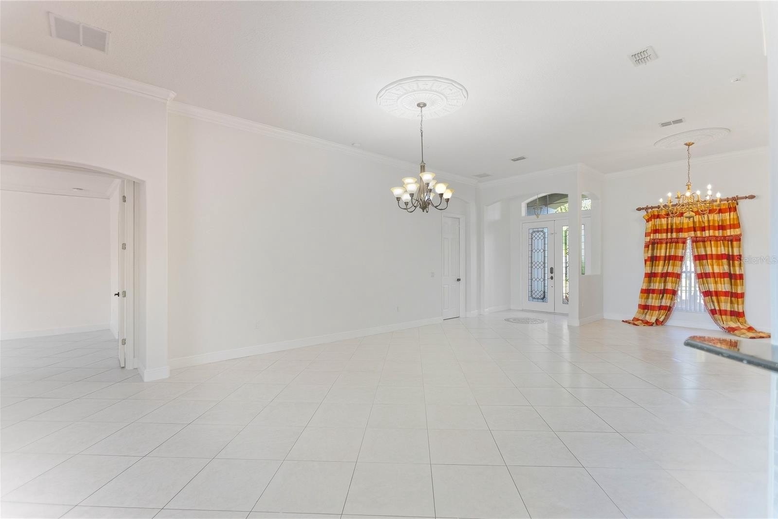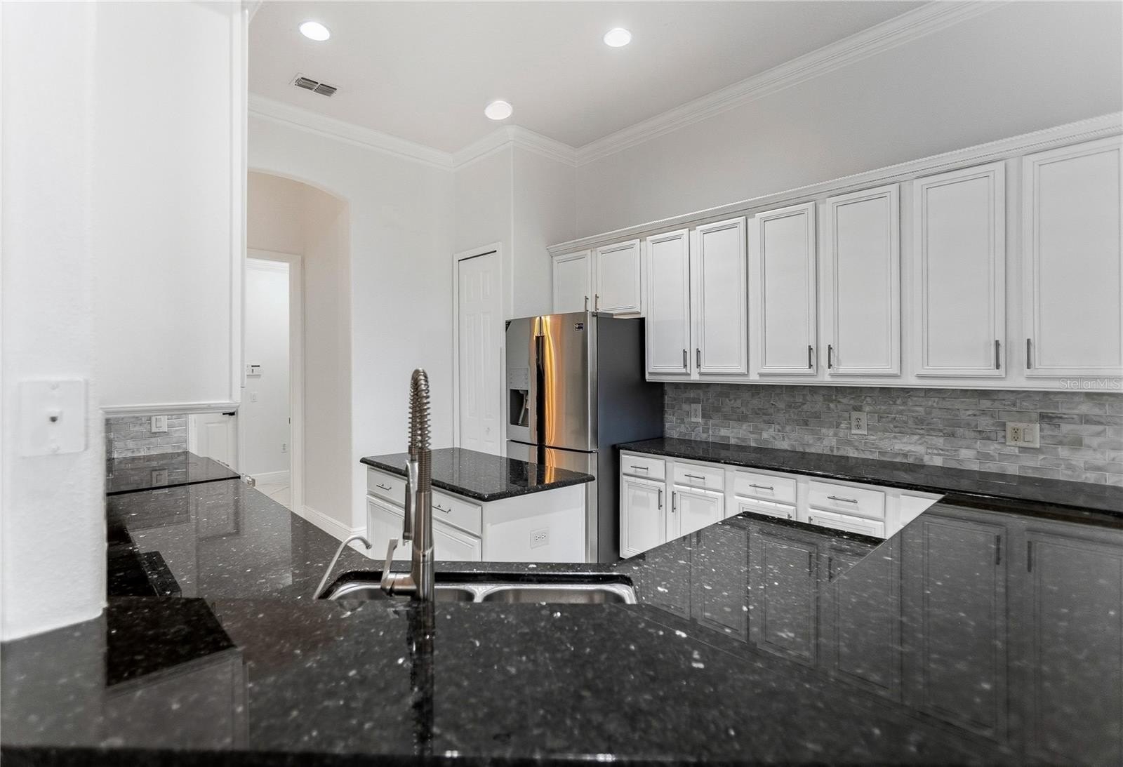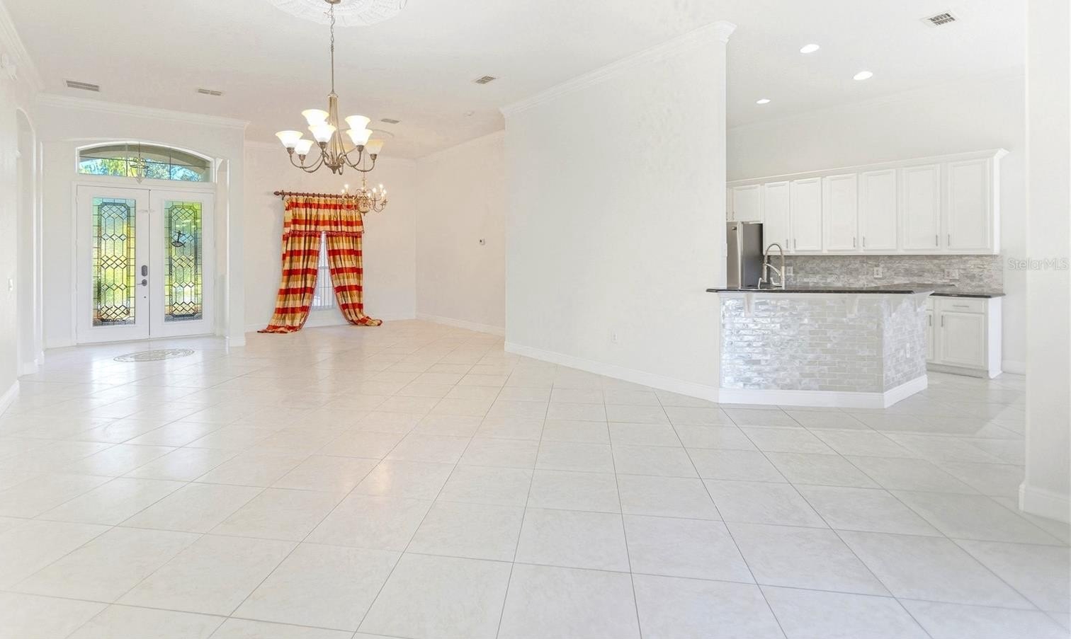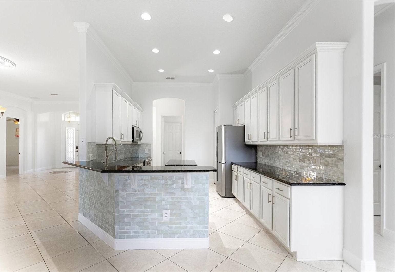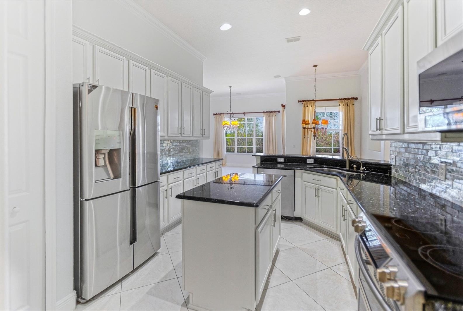 Step inside to an open floorplan with all-tile flooring, fresh interior paint, and designer light fixtures. The chef’s kitchen is well-appointed with modern cabinetry, granite countertops, stainless steel appliances, and custom backsplash, creating a bright, modern heart of the home.