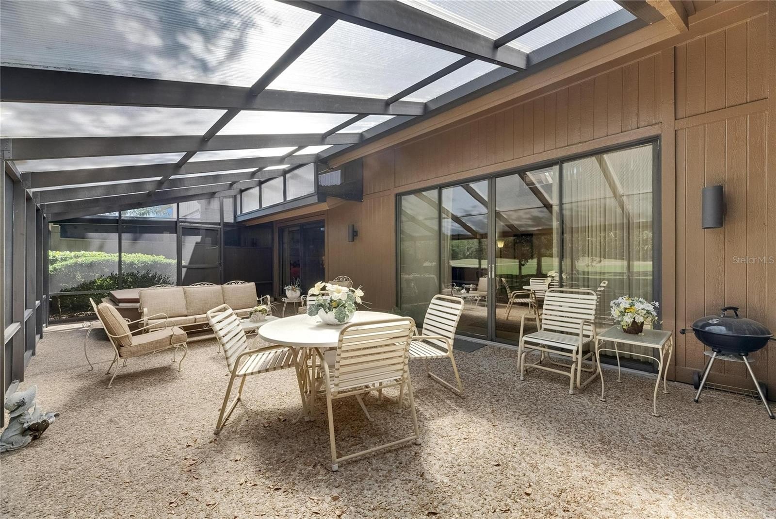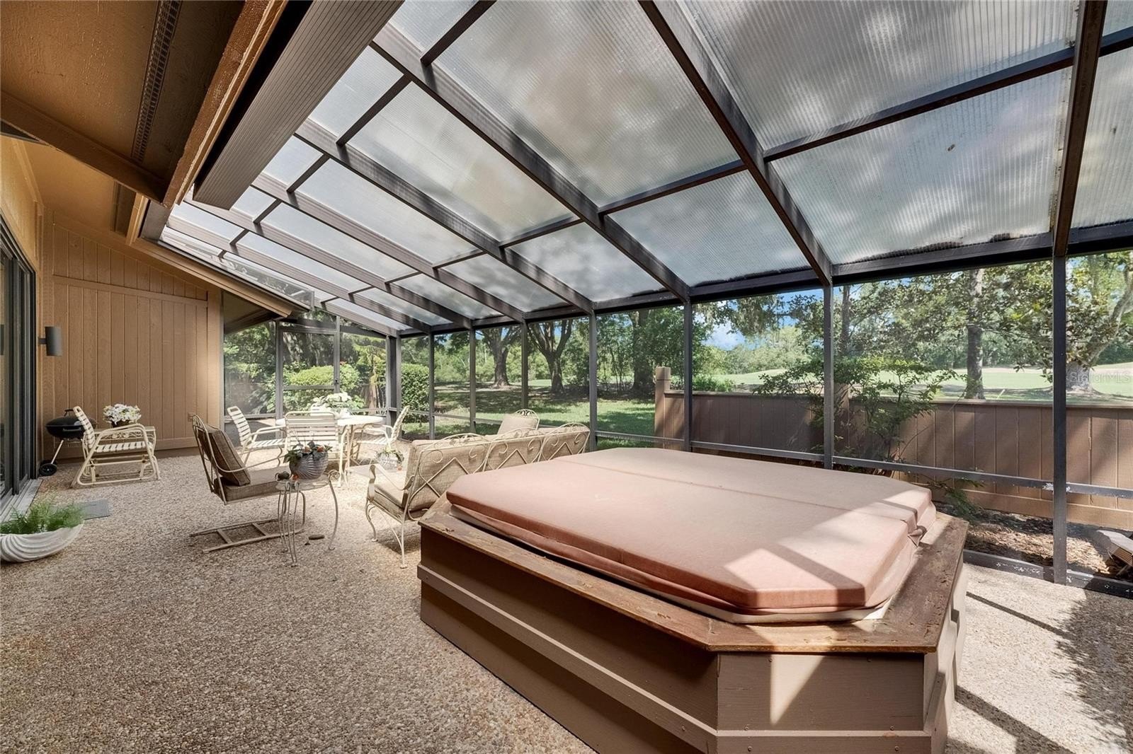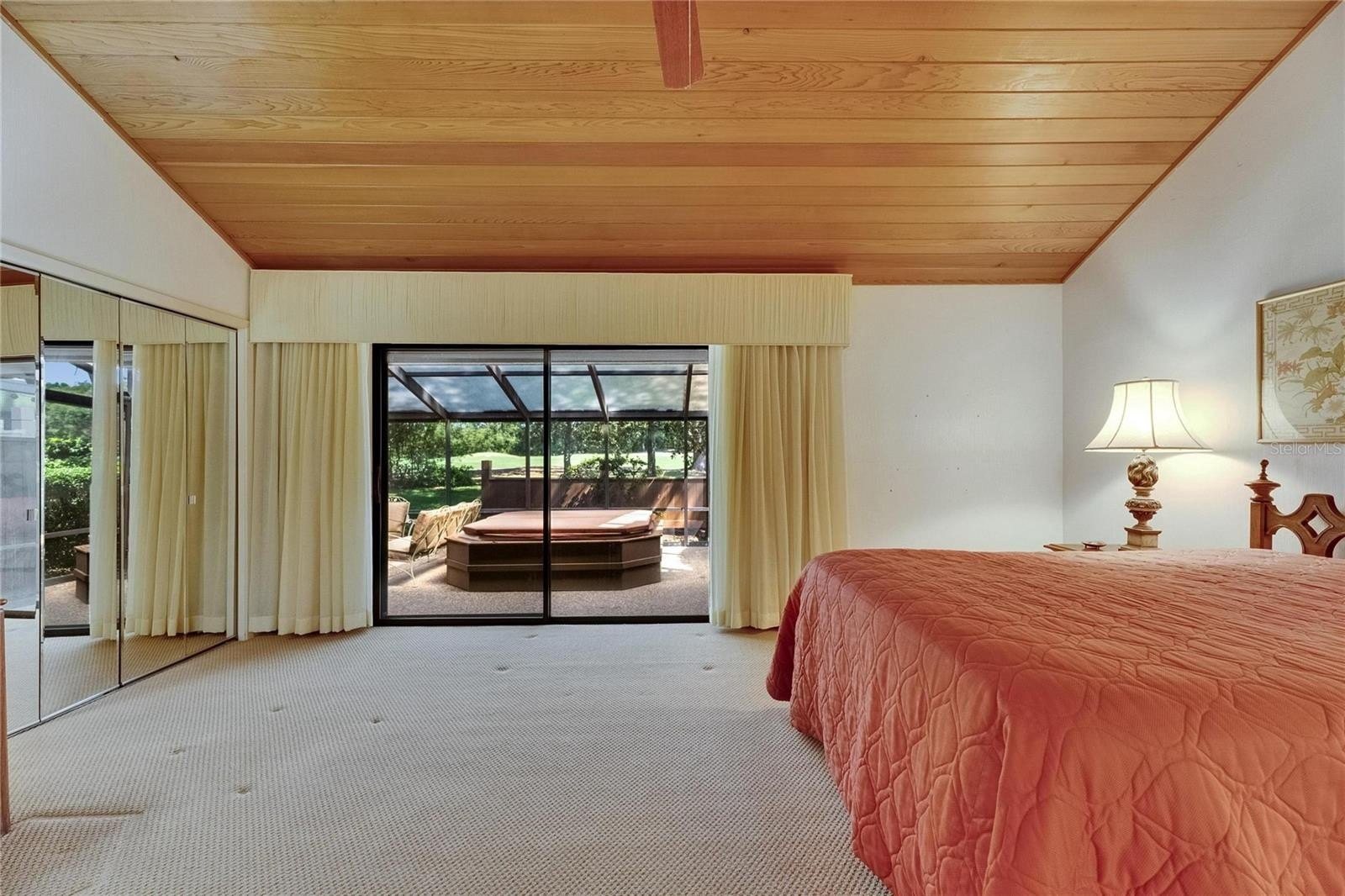 The expansive 25x17 family room is the heart of the home, complete with a striking wood-burning fireplace, built-in bar, and sliding glass doors that open to a screened lanai, an ideal setting for morning coffee or evening gatherings overlooking the fairway. The kitchen flows seamlessly into the main living and dining areas, offering tiled floors, a breakfast bar, and ample space to make it your own. The oversized primary suite features three closets and a spacious en-suite bath with a garden tub, separate walk-in shower, and natural light from above. Each bedroom enjoys its own private bath, including one with French doors leading to a charming courtyard retreat, perfect for guests or a quiet escape.