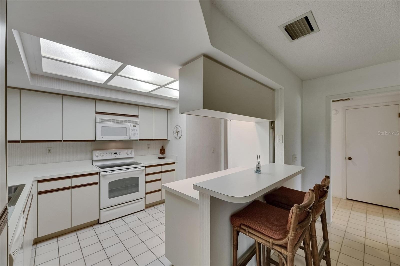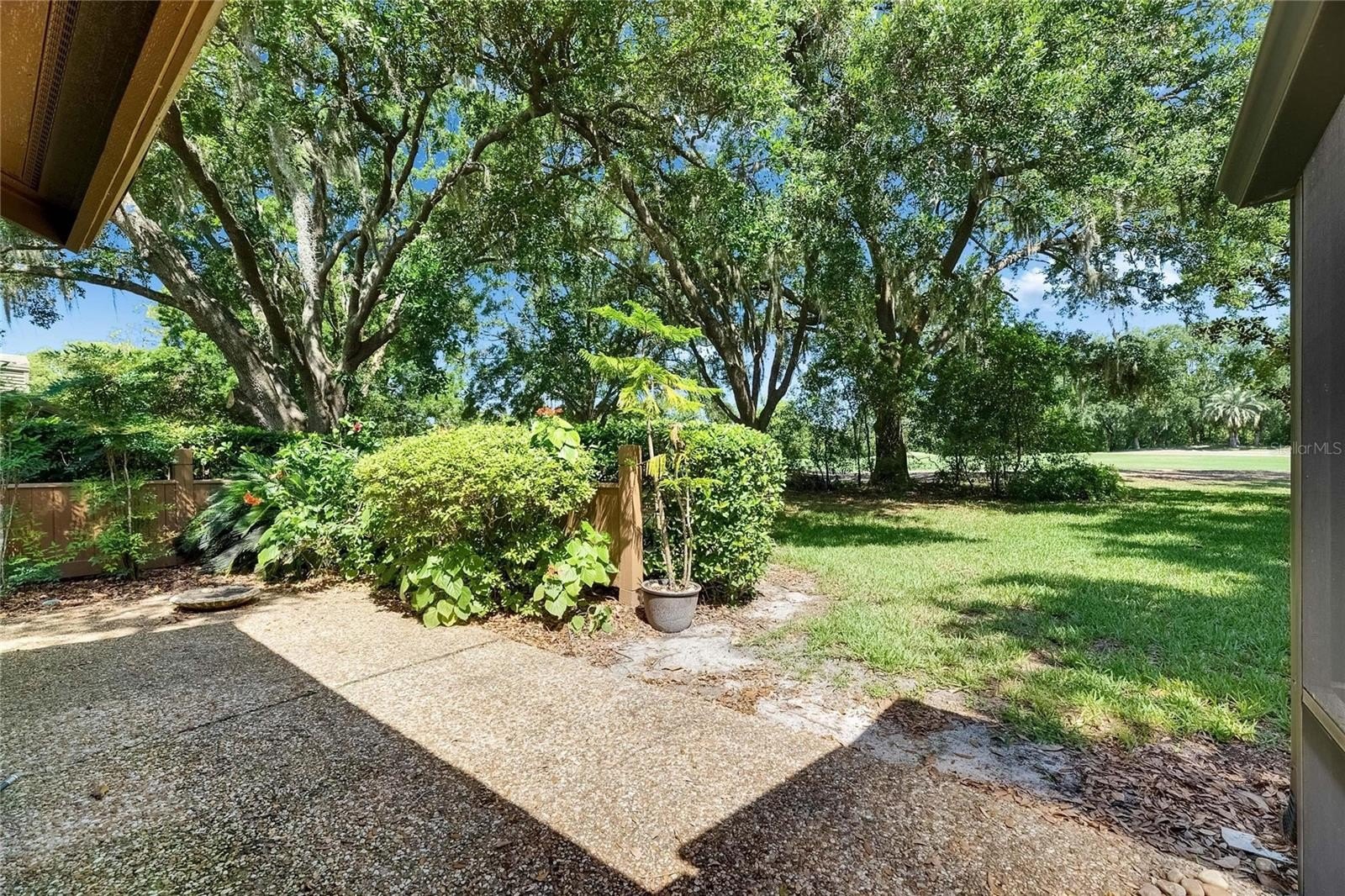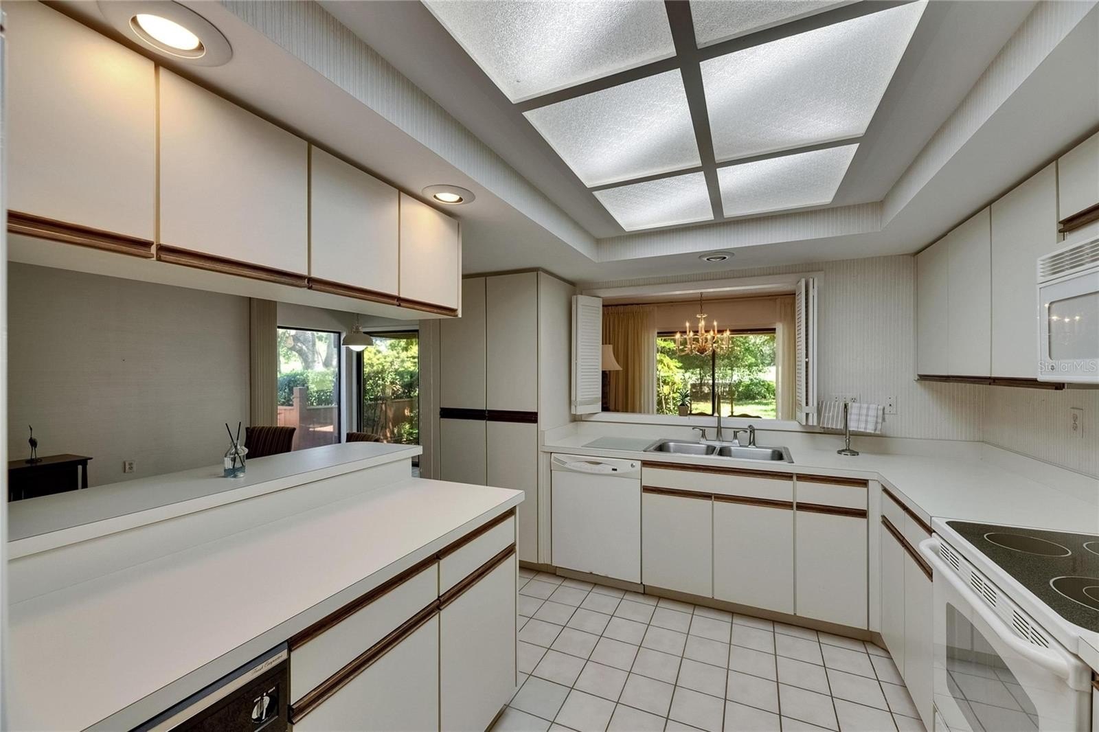 The expansive 25x17 family room is the heart of the home, complete with a striking wood-burning fireplace, built-in bar, and sliding glass doors that open to a screened lanai, an ideal setting for morning coffee or evening gatherings overlooking the fairway. The kitchen flows seamlessly into the main living and dining areas, offering tiled floors, a breakfast bar, and ample space to make it your own. The oversized primary suite features three closets and a spacious en-suite bath with a garden tub, separate walk-in shower, and natural light from above. Each bedroom enjoys its own private bath, including one with French doors leading to a charming courtyard retreat, perfect for guests or a quiet escape.